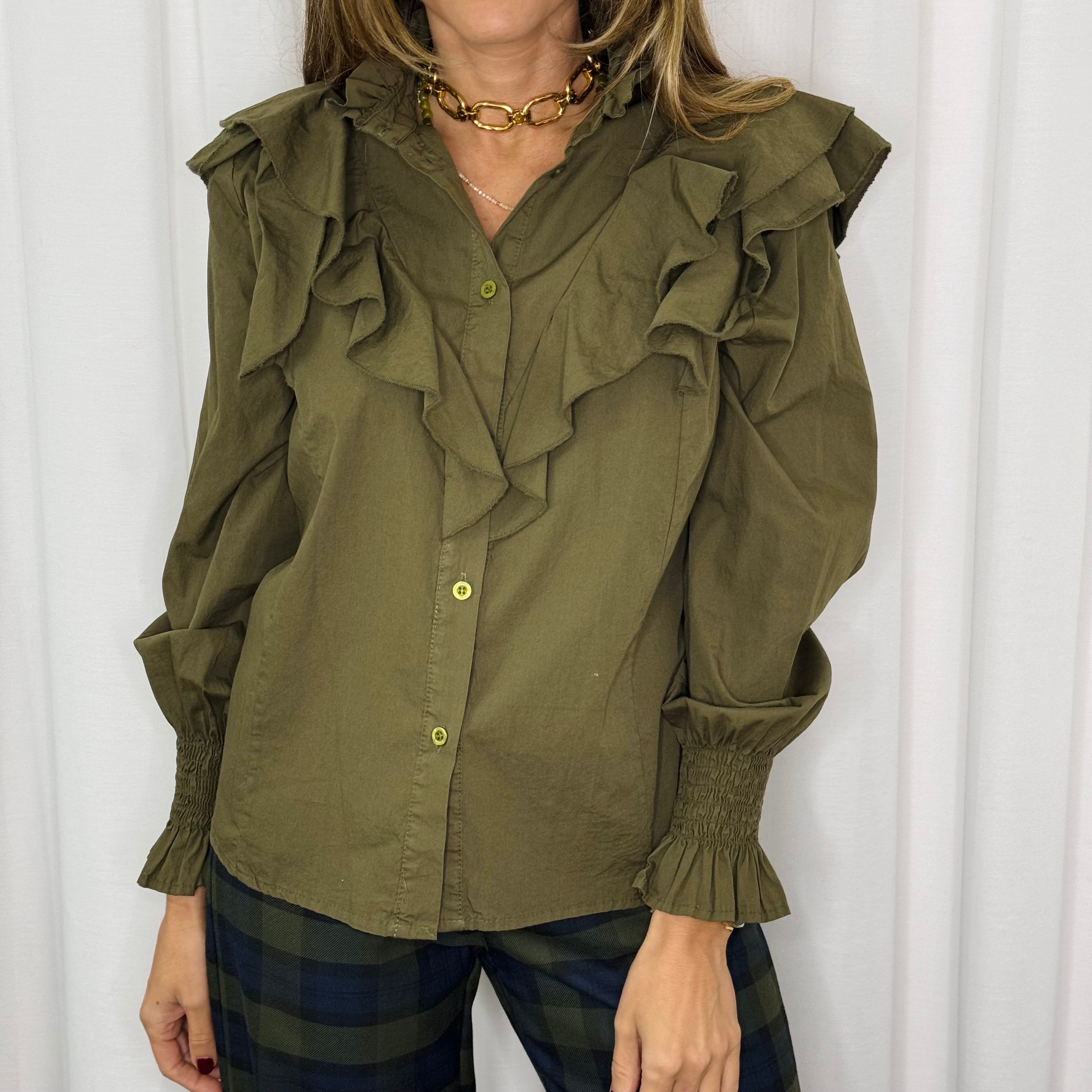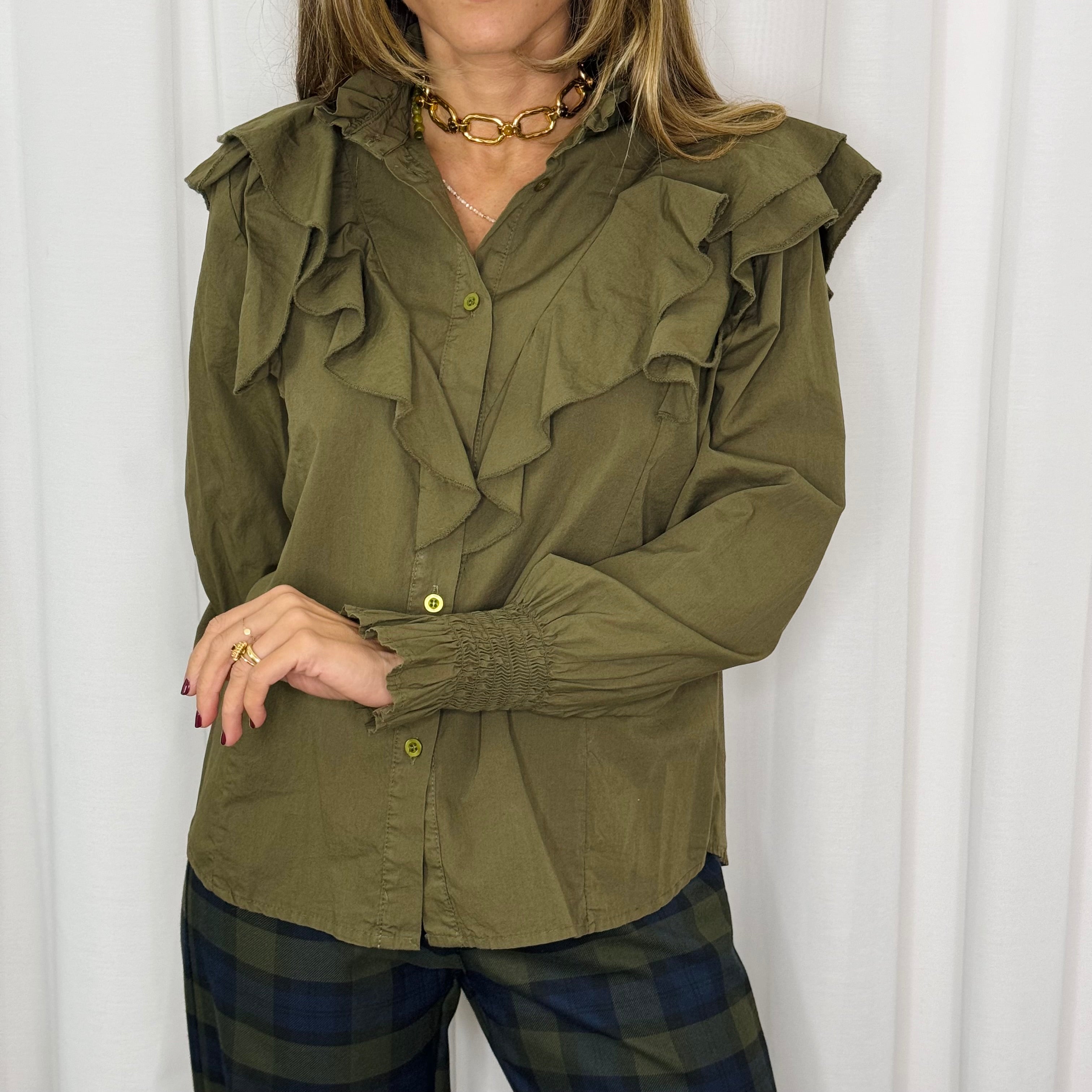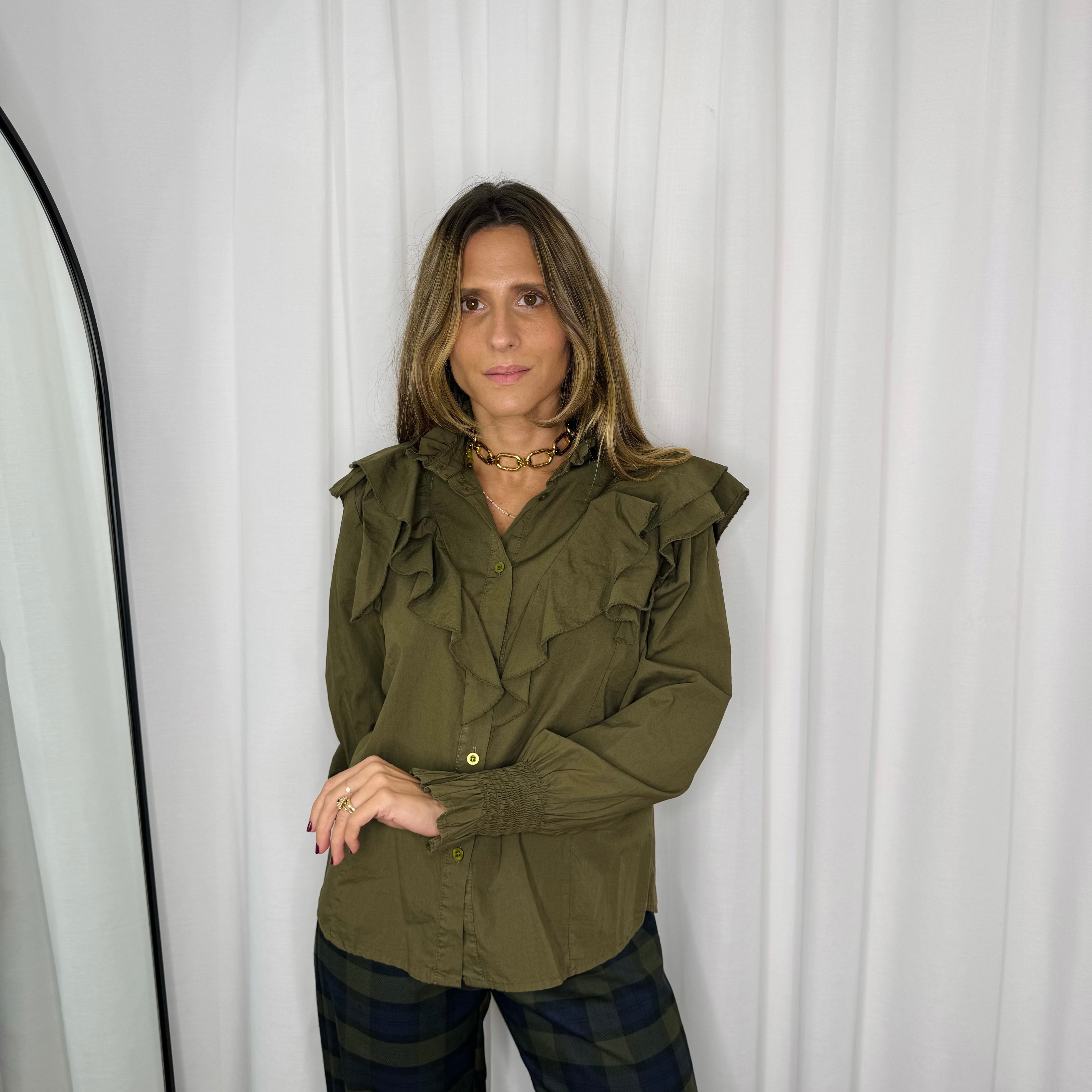 Camisa caqui com folhos. Favos na gola e punhos. Aperta com botões ao centro.