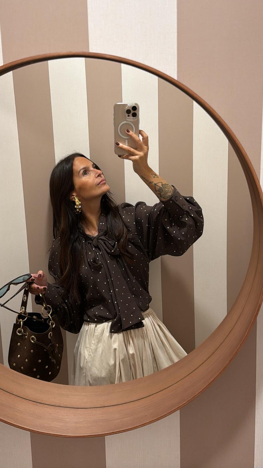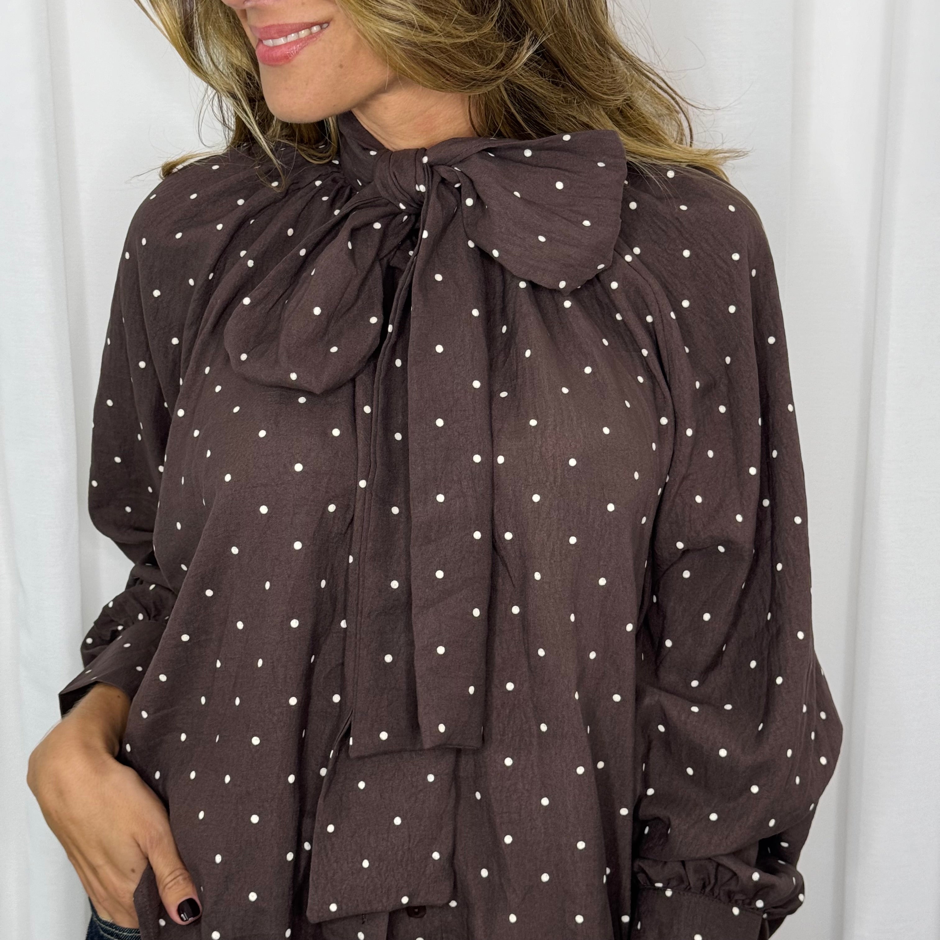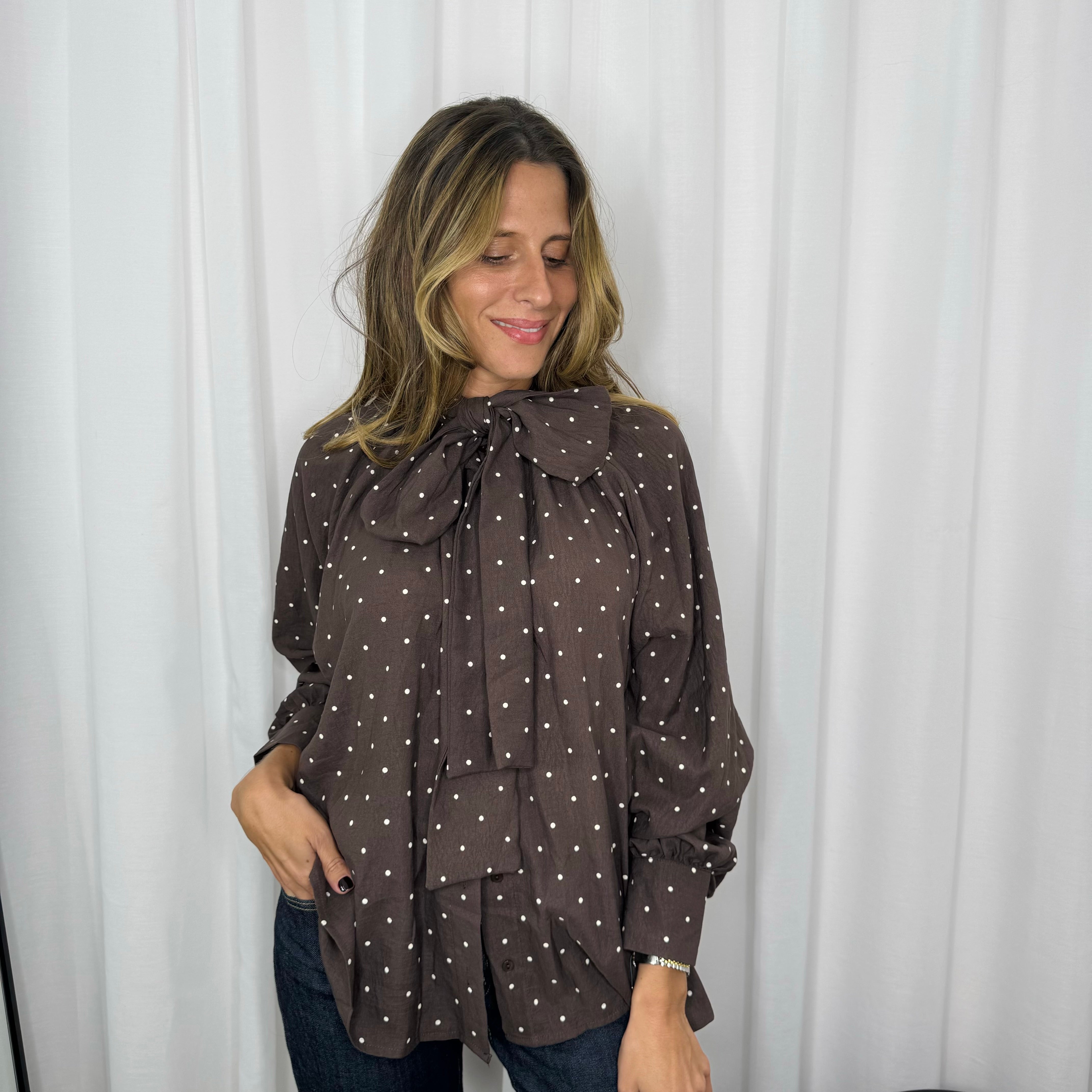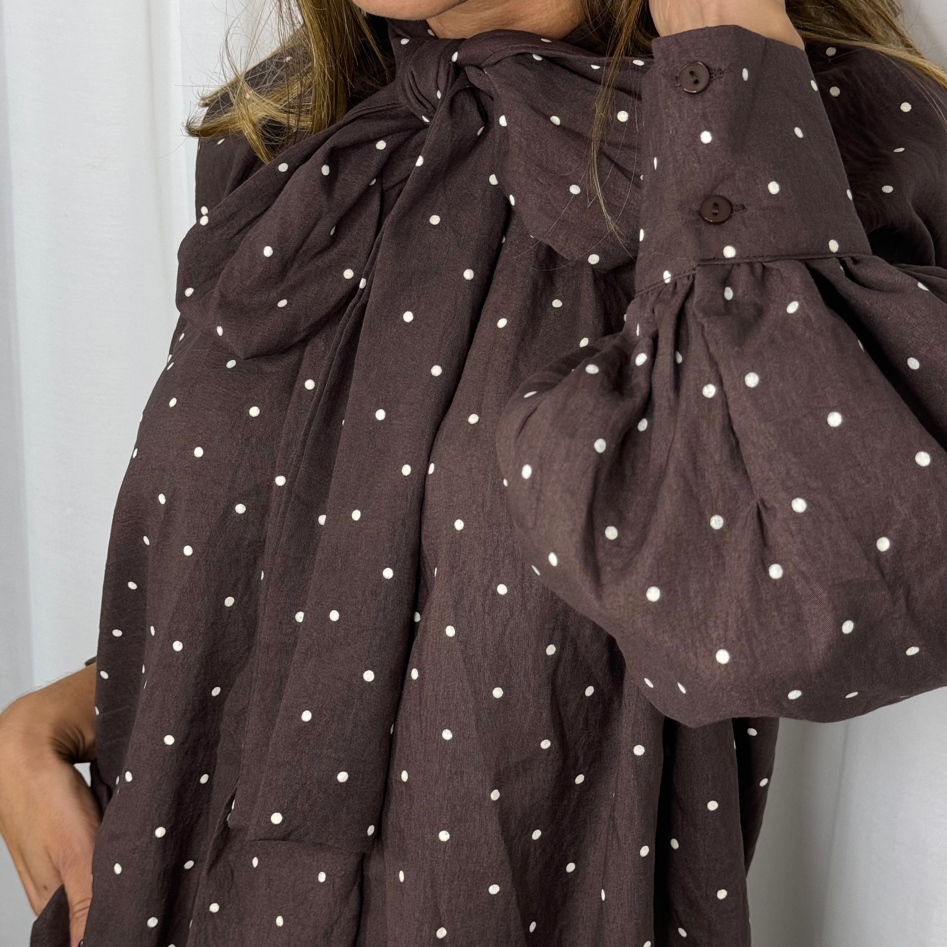 Camisa fundo castanho com bolas brancas. Mangas largas com botões nos punhos. Aperta com botões ao centro. Pormenor de laçada na gola.