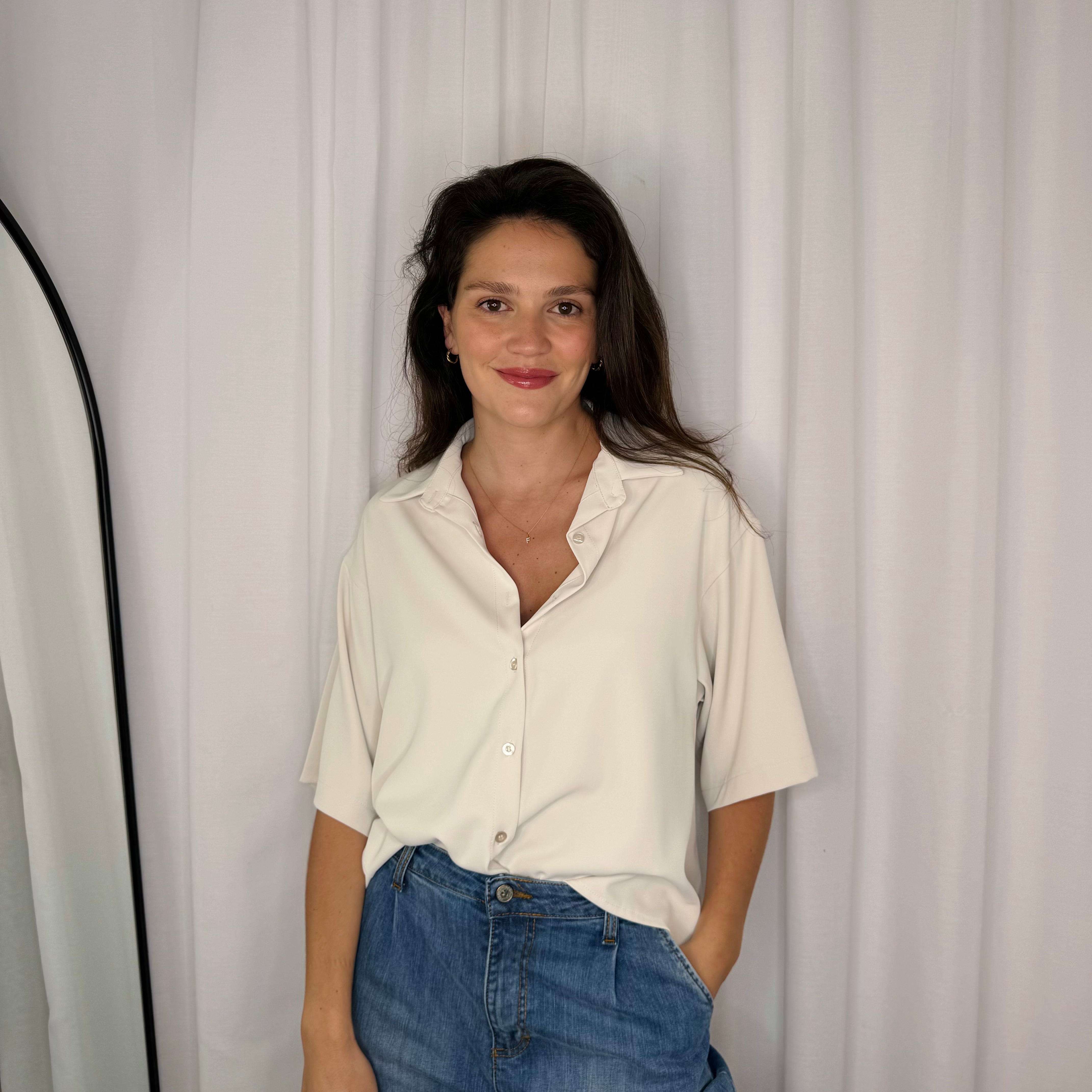 Camisa mangas curtas. Golas em aba. Aperta com botões ao centro.