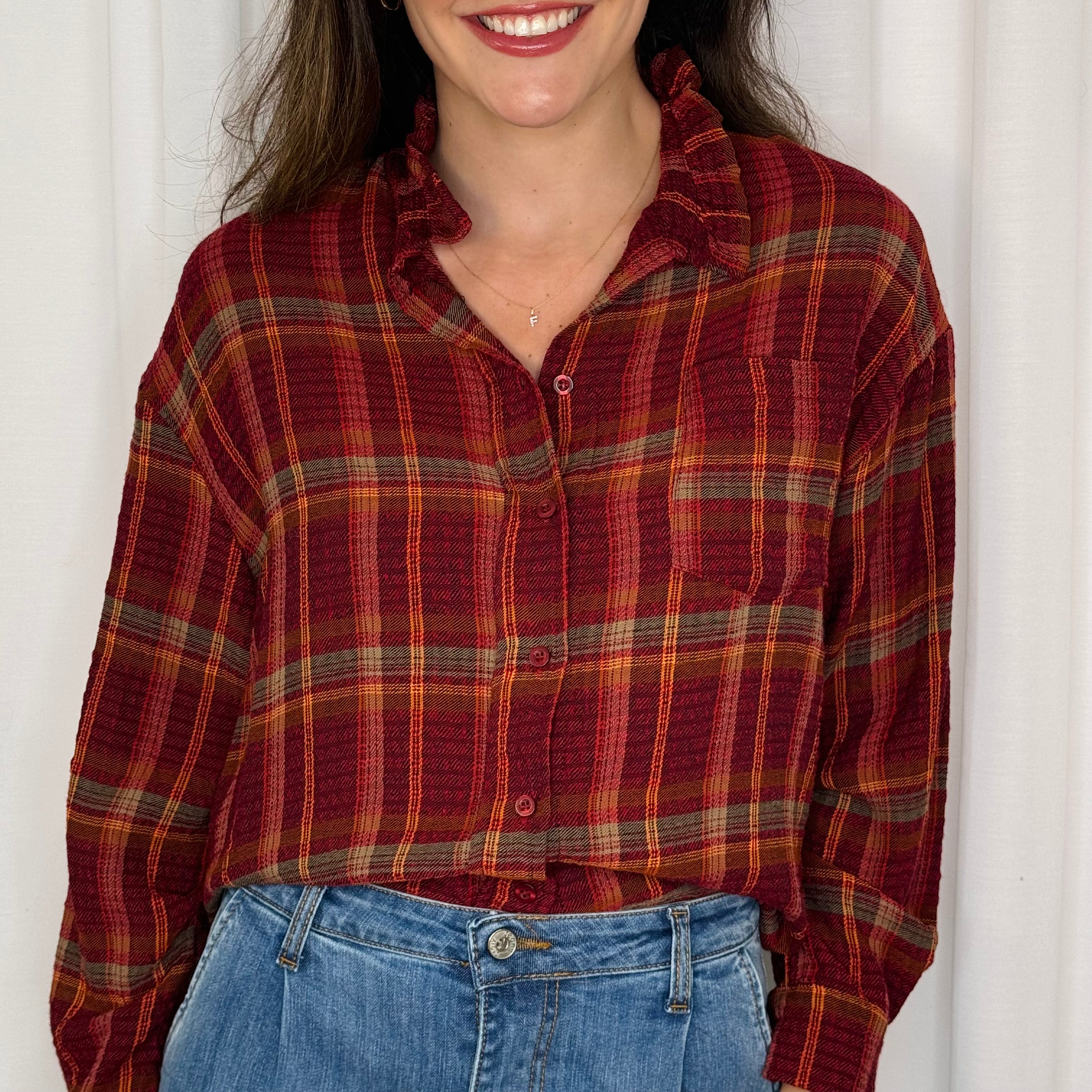 Camisa fundo bordeaux com estampado escocês. Aperta com botões ao centro.