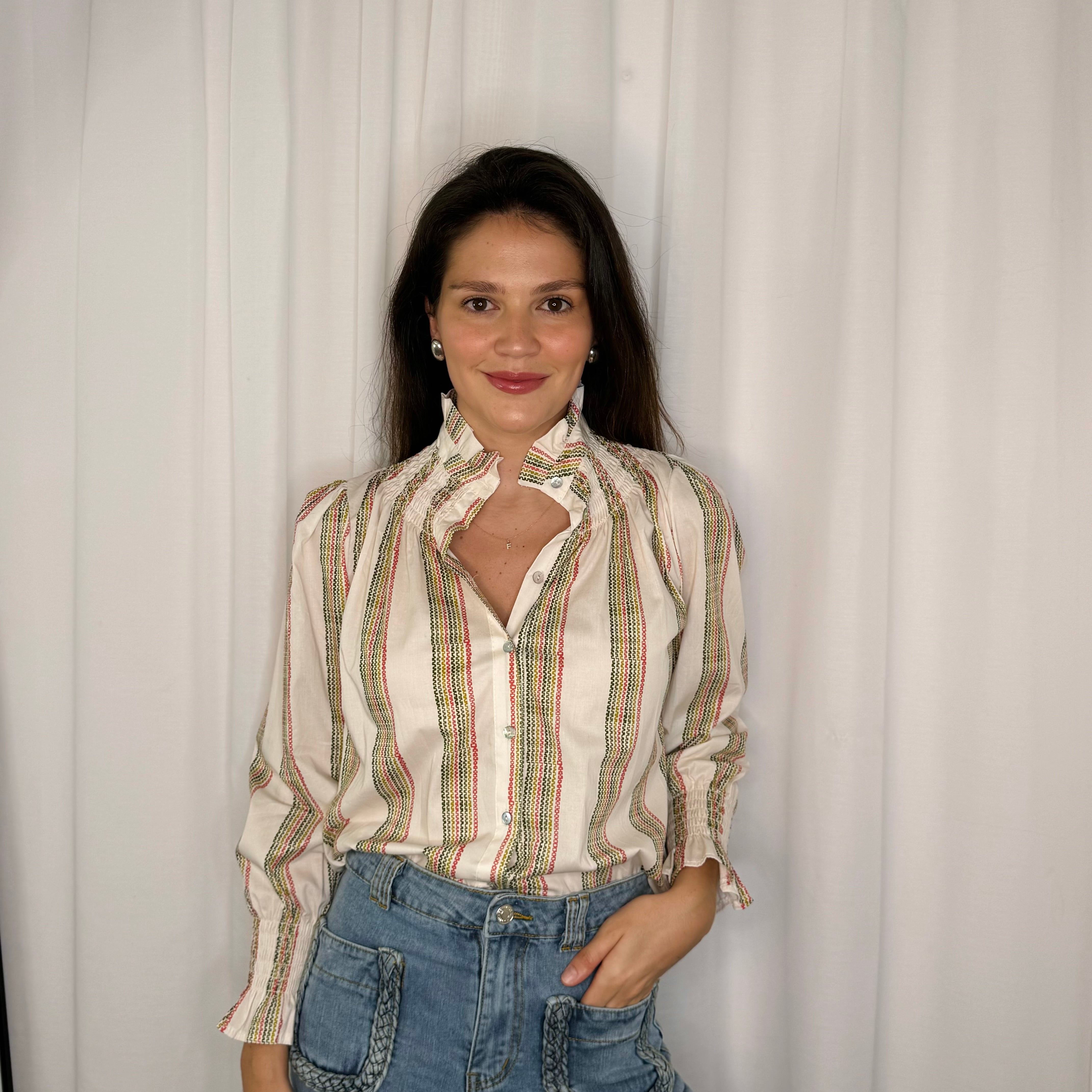 Camisa bege estampada. Aperta com botões ao centro. Favos na gola e punhos.
