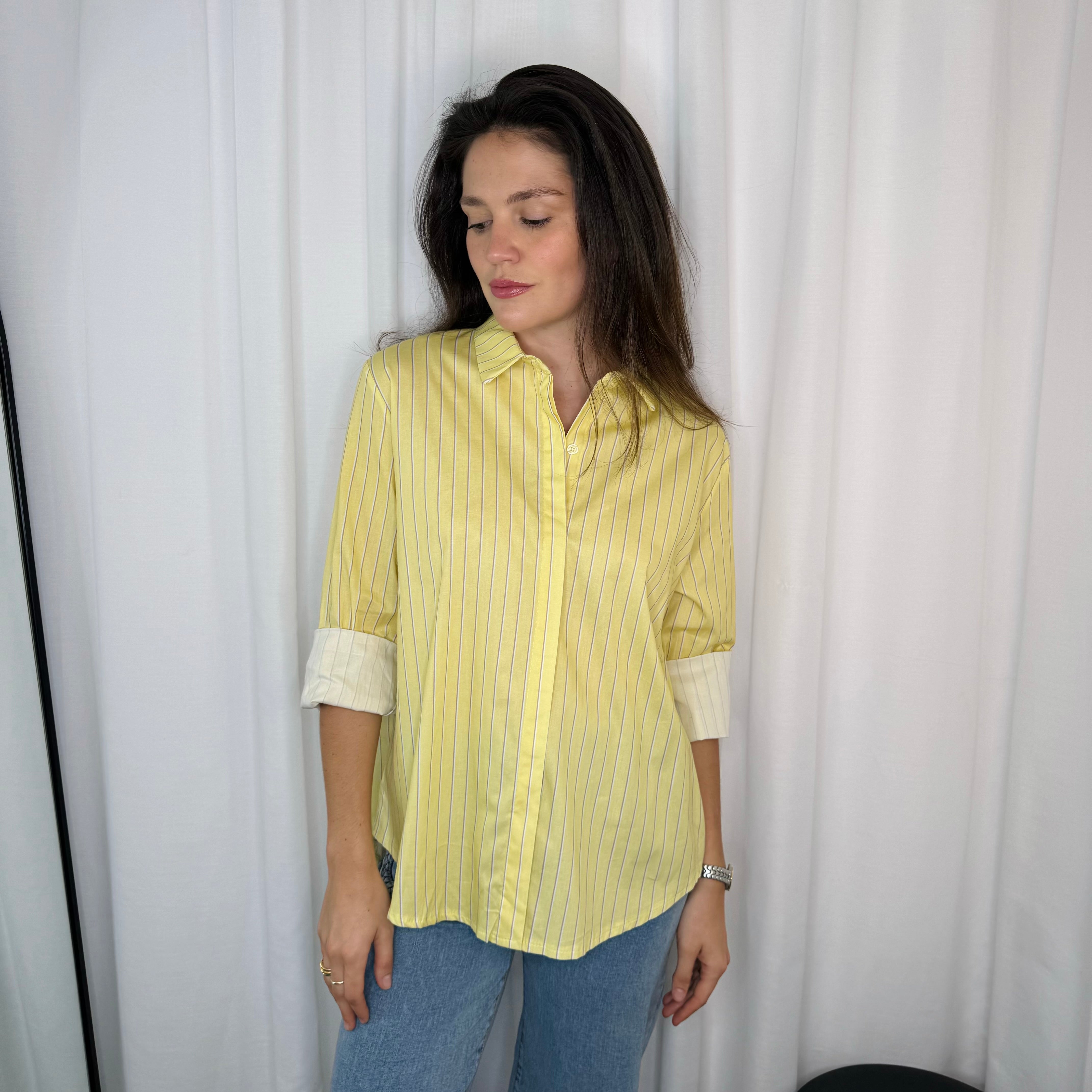 Camisa modelo oversized amarela com riscas. Aperta com botões ao centro. Golas em aba.