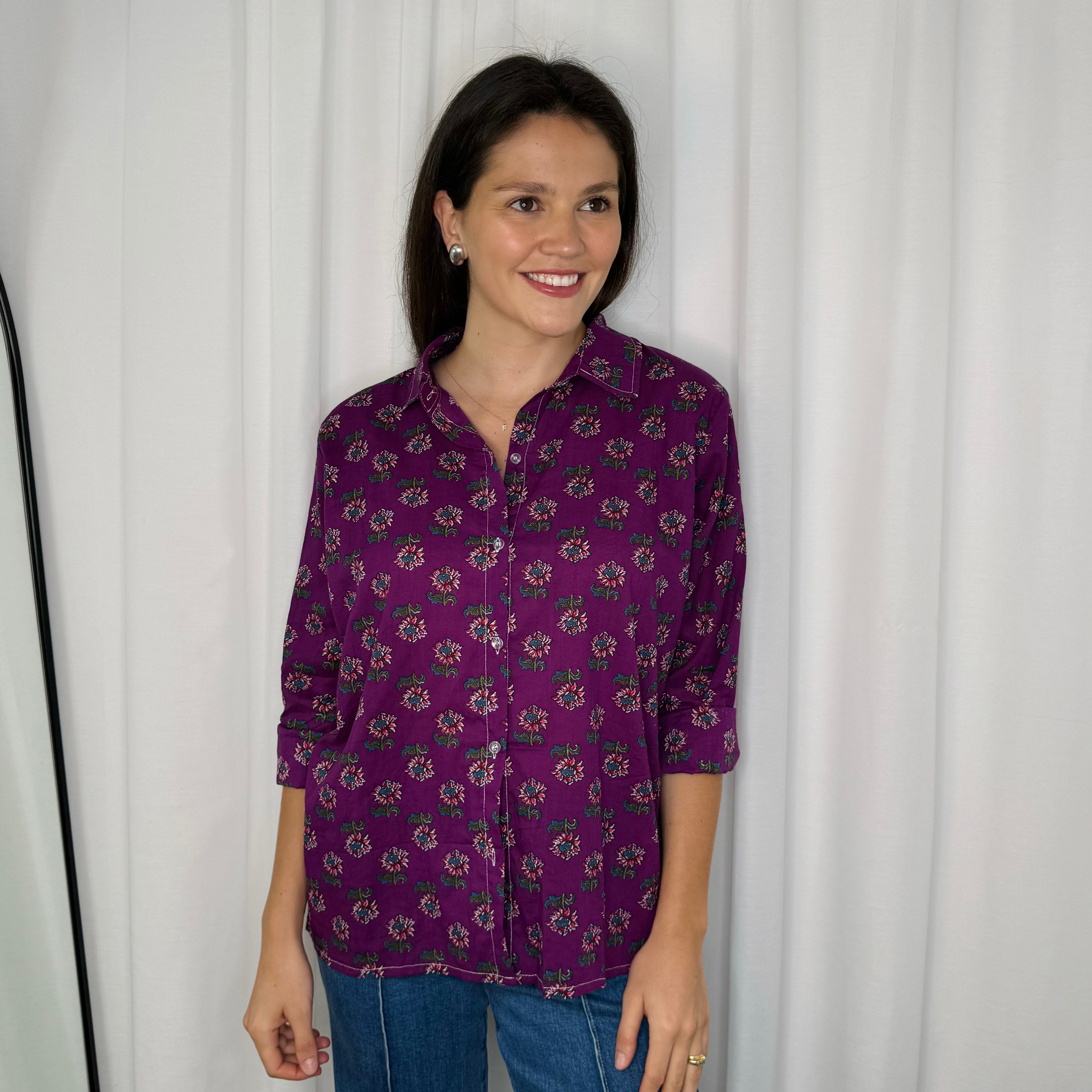 Camisa com golas em aba. Aperta com botões ao centro. Fundo liso com estampado floral.