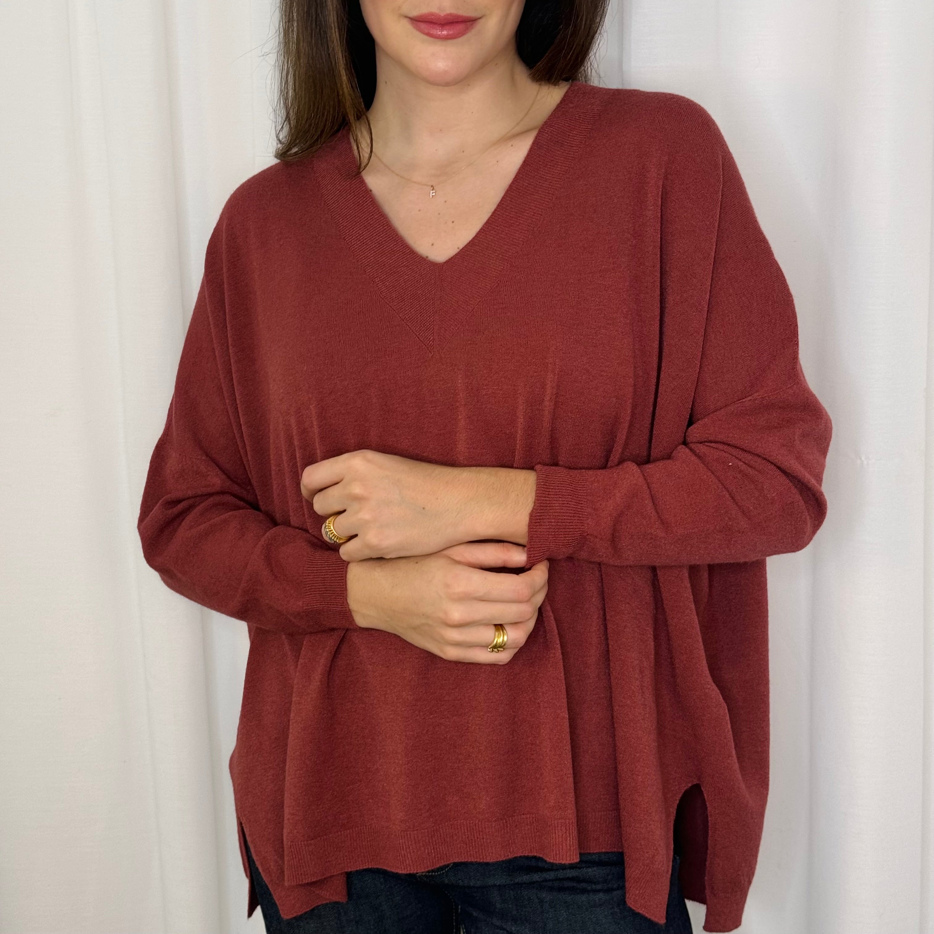 Camisola em decote bico. Modelo largo com racha lateral. Pormenor canelado na gola. Manga comprida.