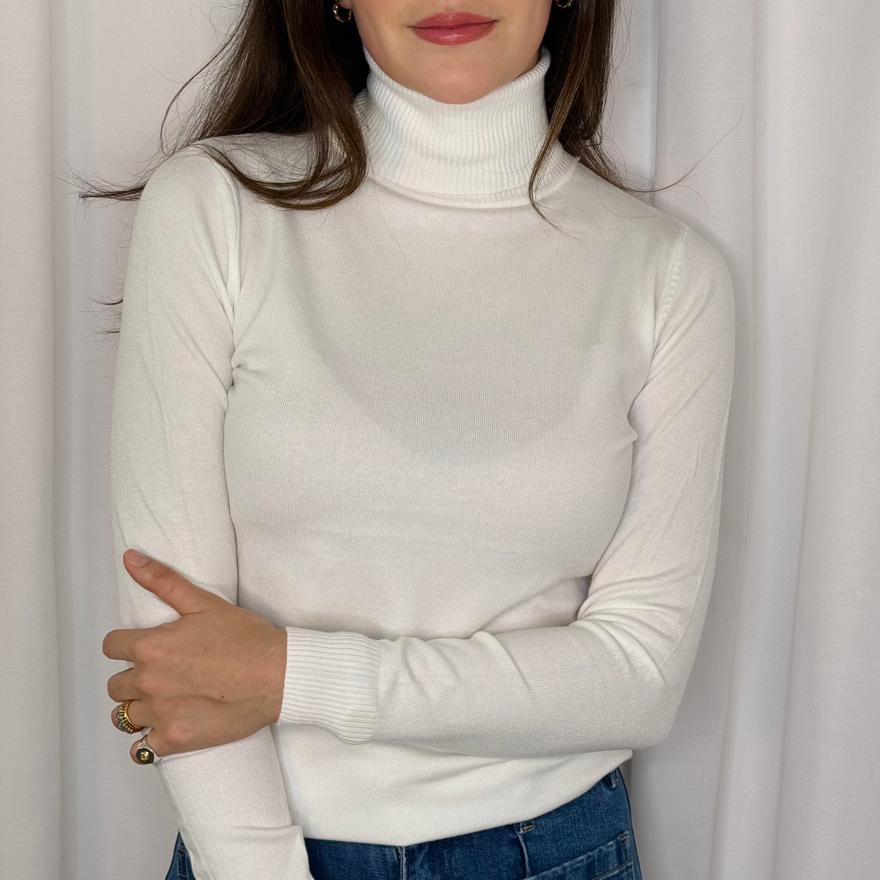 Camisola gola alta. Malha macia e confortável.