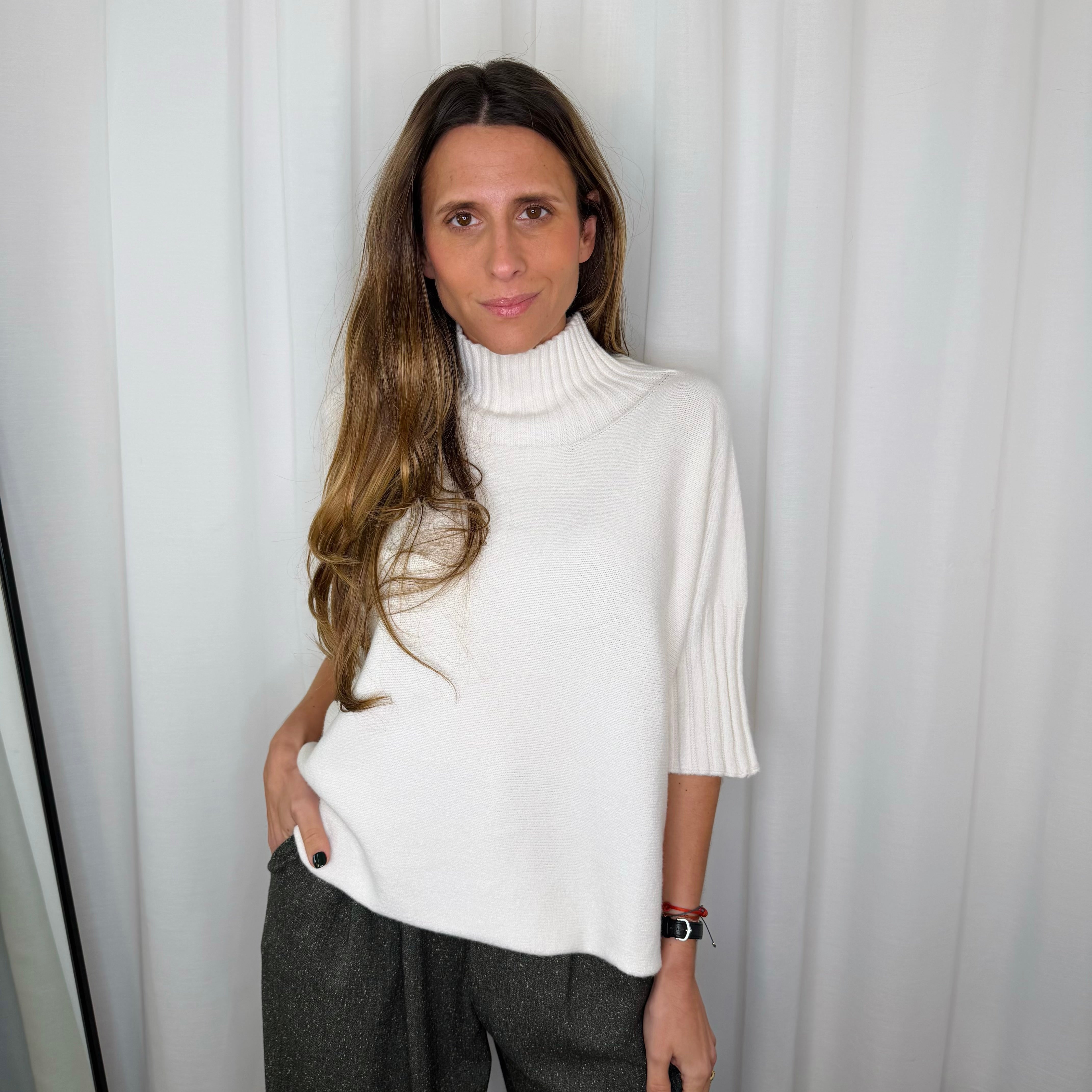 Camisola em malha de meia gola. Mangas 3/4. Punhos e gola canelados.