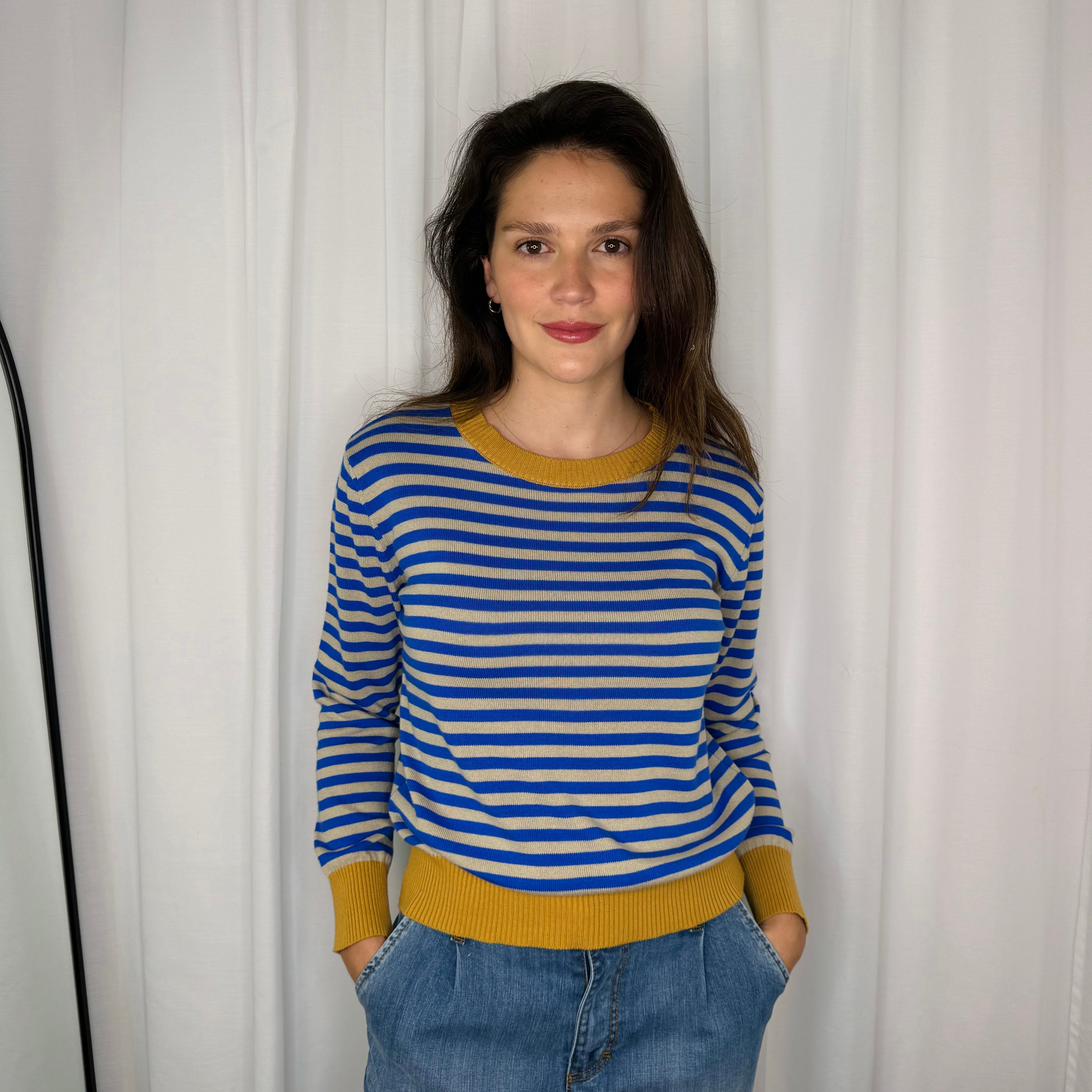 Camisola em malha fina com riscas azul e cru. Gola, punhos e cós mostarda.