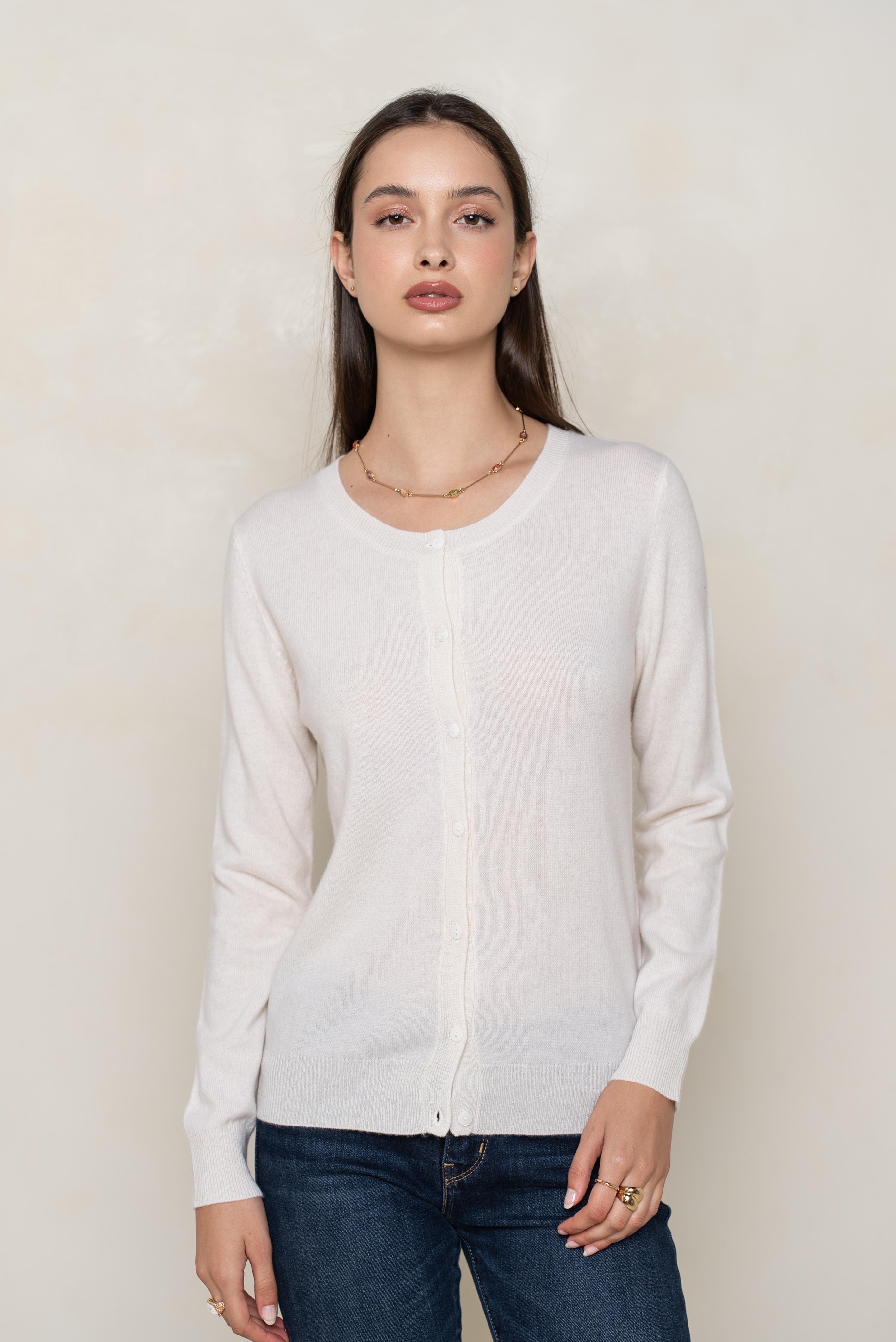Cardigan confecionado em tecido 100% Cashmere. Decote redondo. Manga comprida. Fecho por botões. Acabamentos em nervuras .