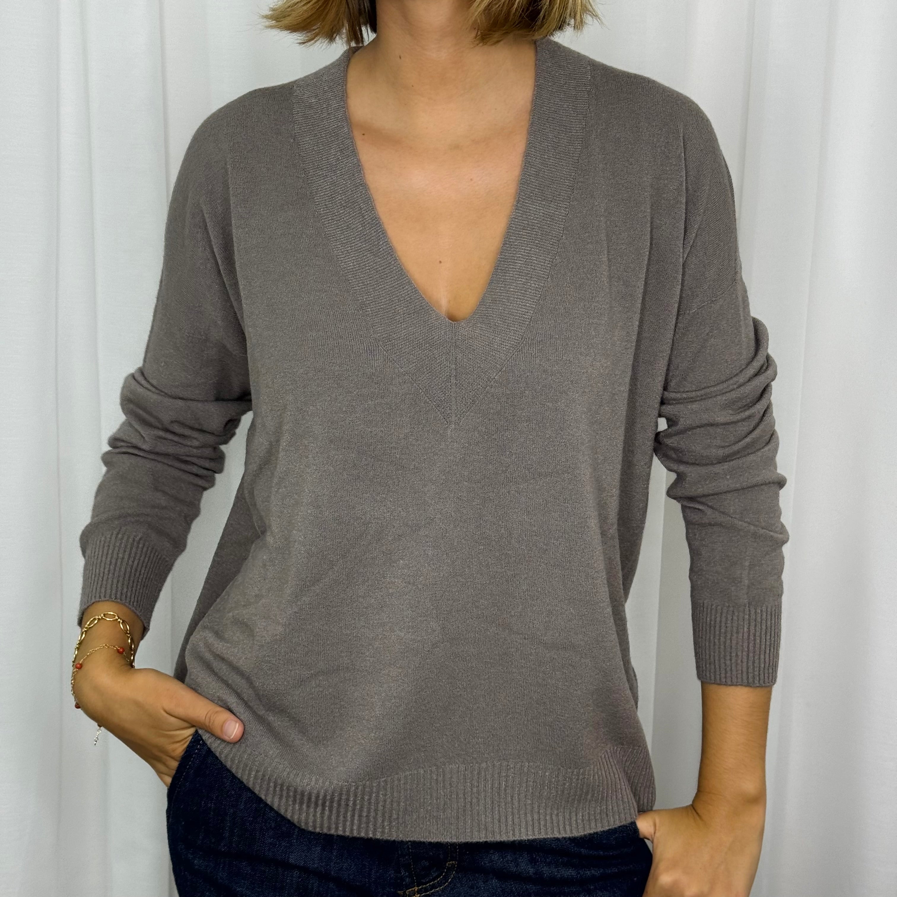 Camisola em decote bico. Modelo largo com racha lateral. Pormenor canelado na gola. Manga comprida.