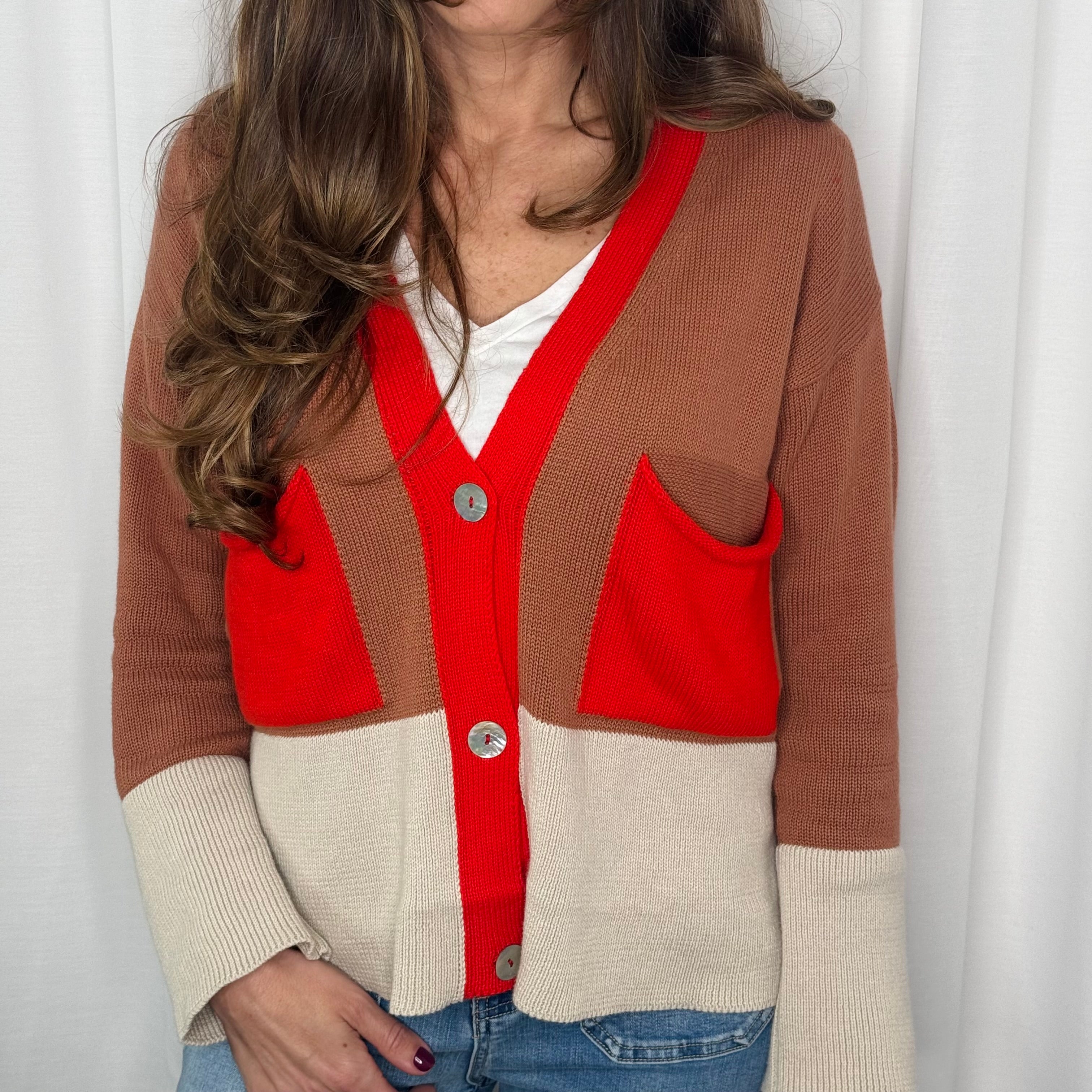 CARDIGAN BEGE CAMEL E VERMELHO