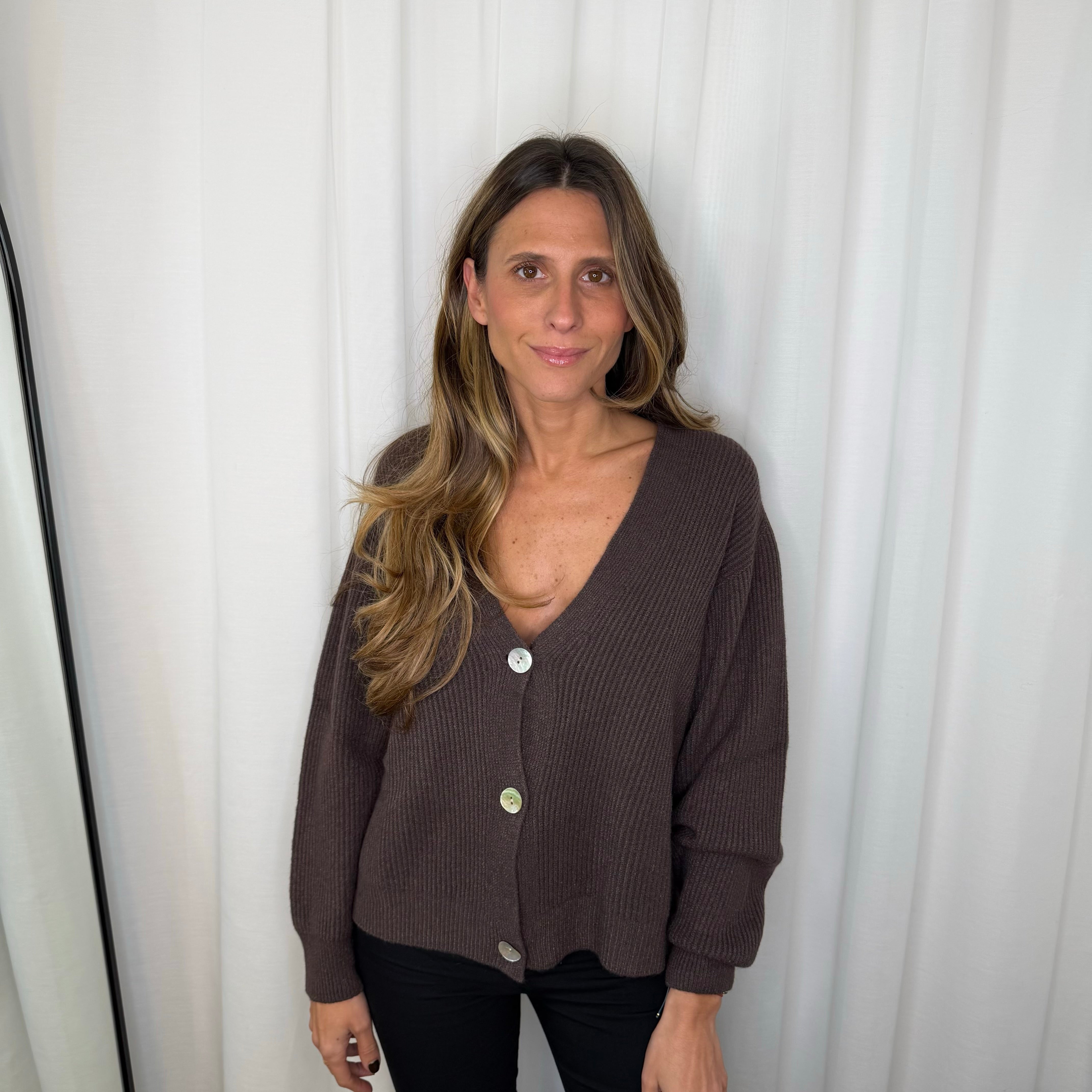 Cardigan canelado. Decote bico. Botões em madre pérola.