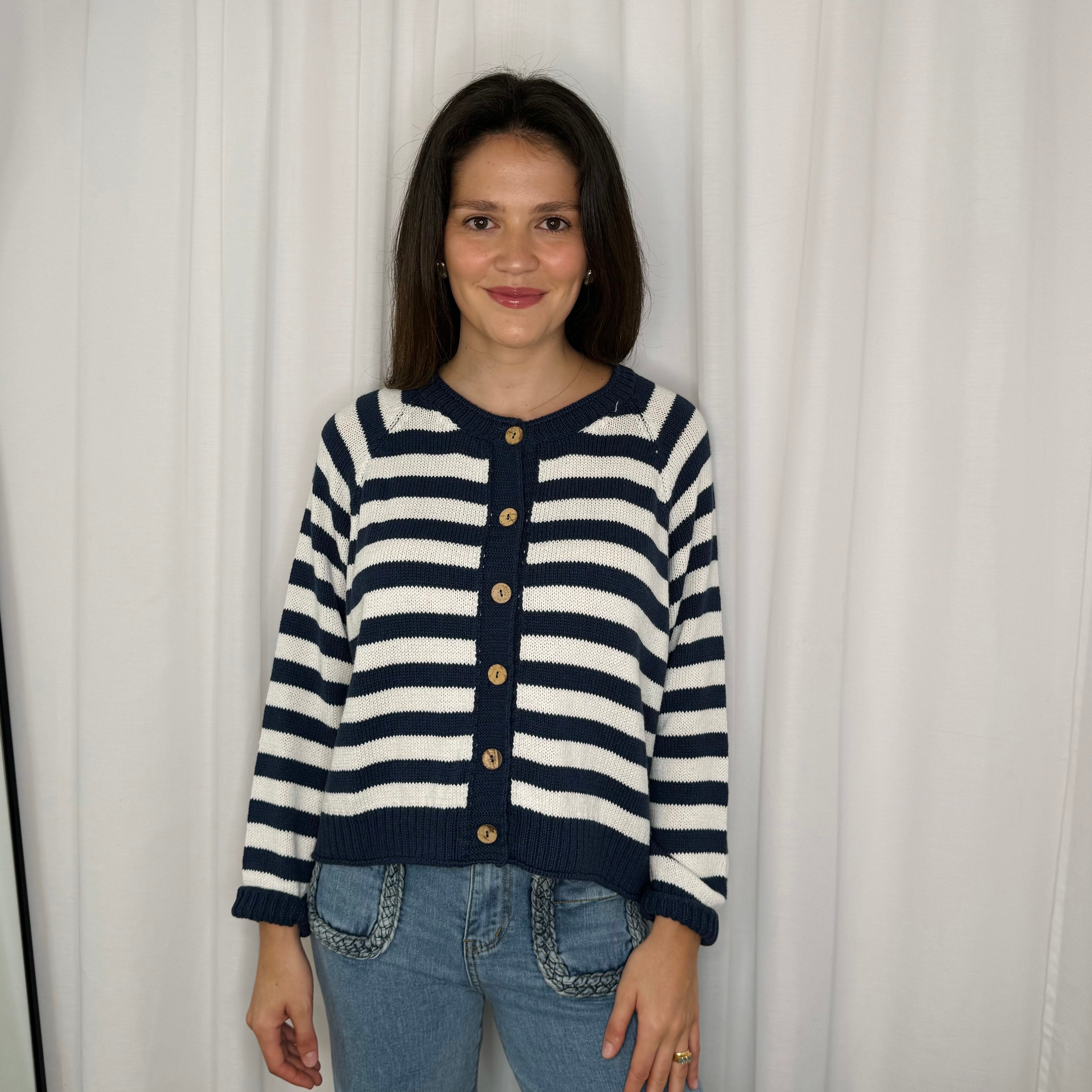 Cardigan com botões ao centro e decote redondo. Malha confortável.