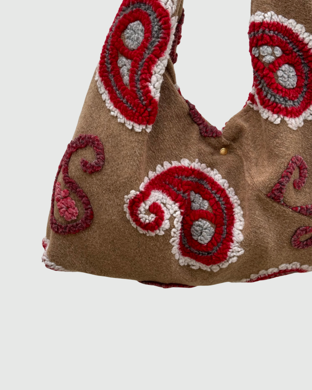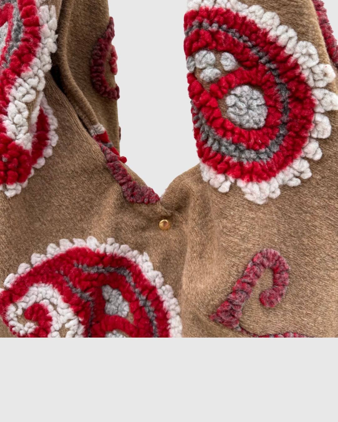 Carteira em carneira camel com cornucópias bordadas bordeaux. Alça em pele. Aperta com botão.