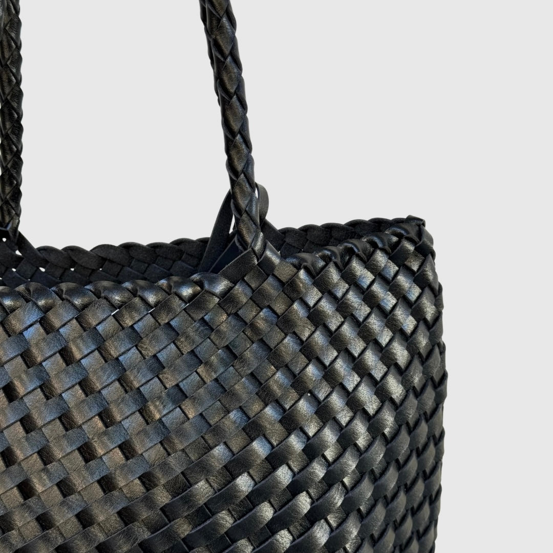 Carteira estilo saco em pele. Entrançada. Duas alças.