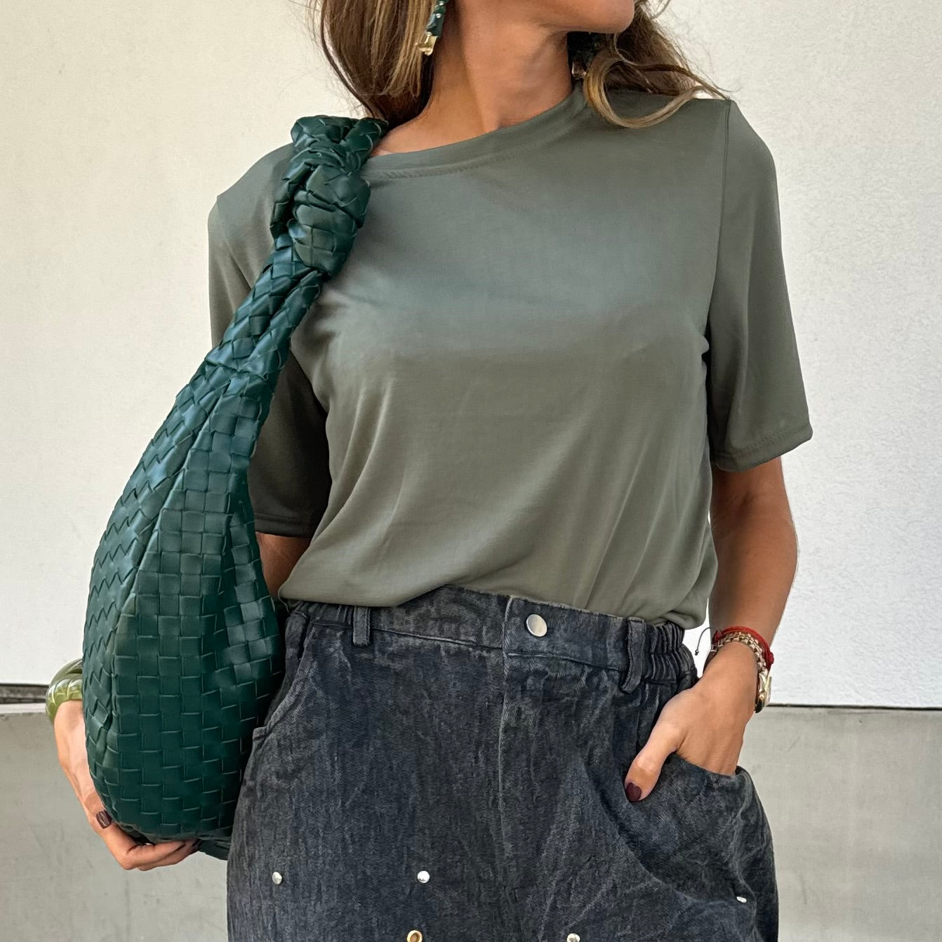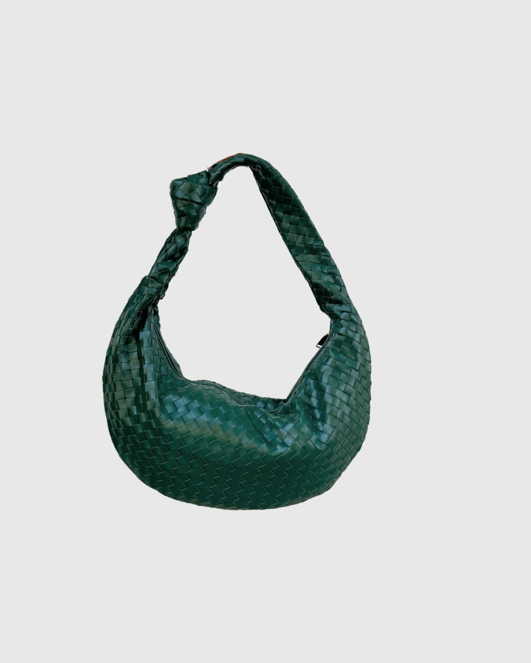 Carteira entrançada. Nó na alça. Aperta com fecho.