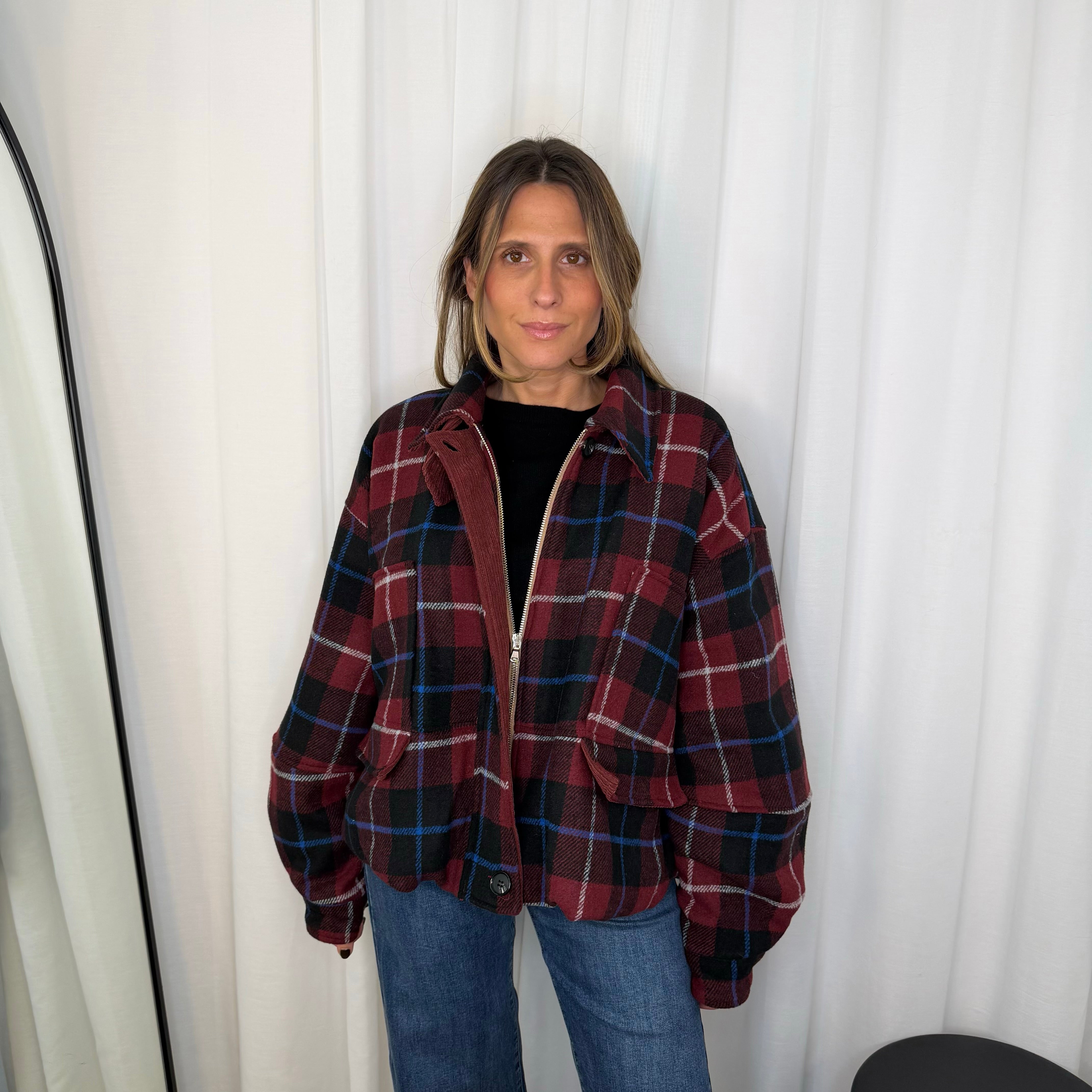 Casaco bomber em fazenda. Fundo bordeaux com estampado escocês em azul. Gola em aba. Acabamentos em bombazine. Aperta com fecho zipper e botões.