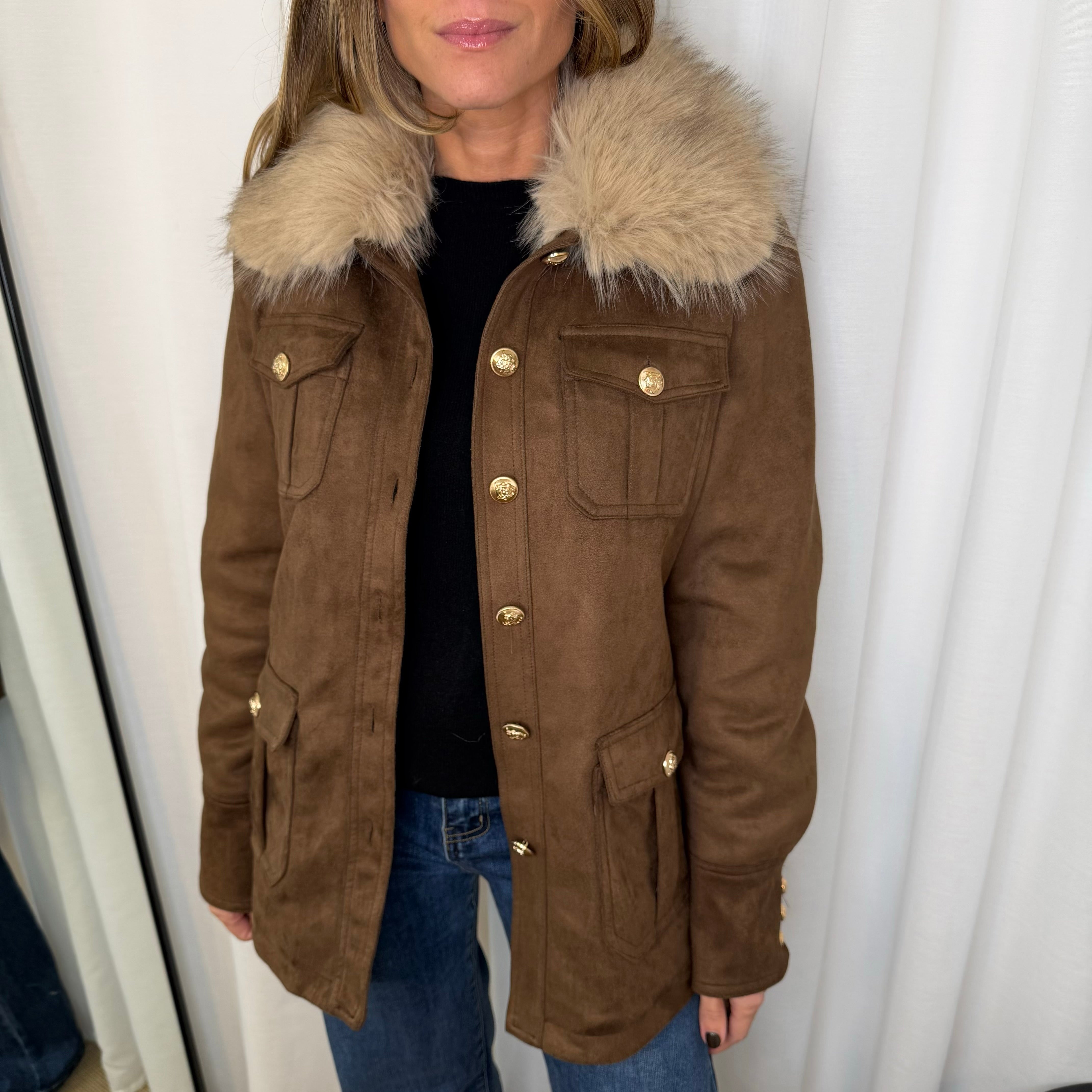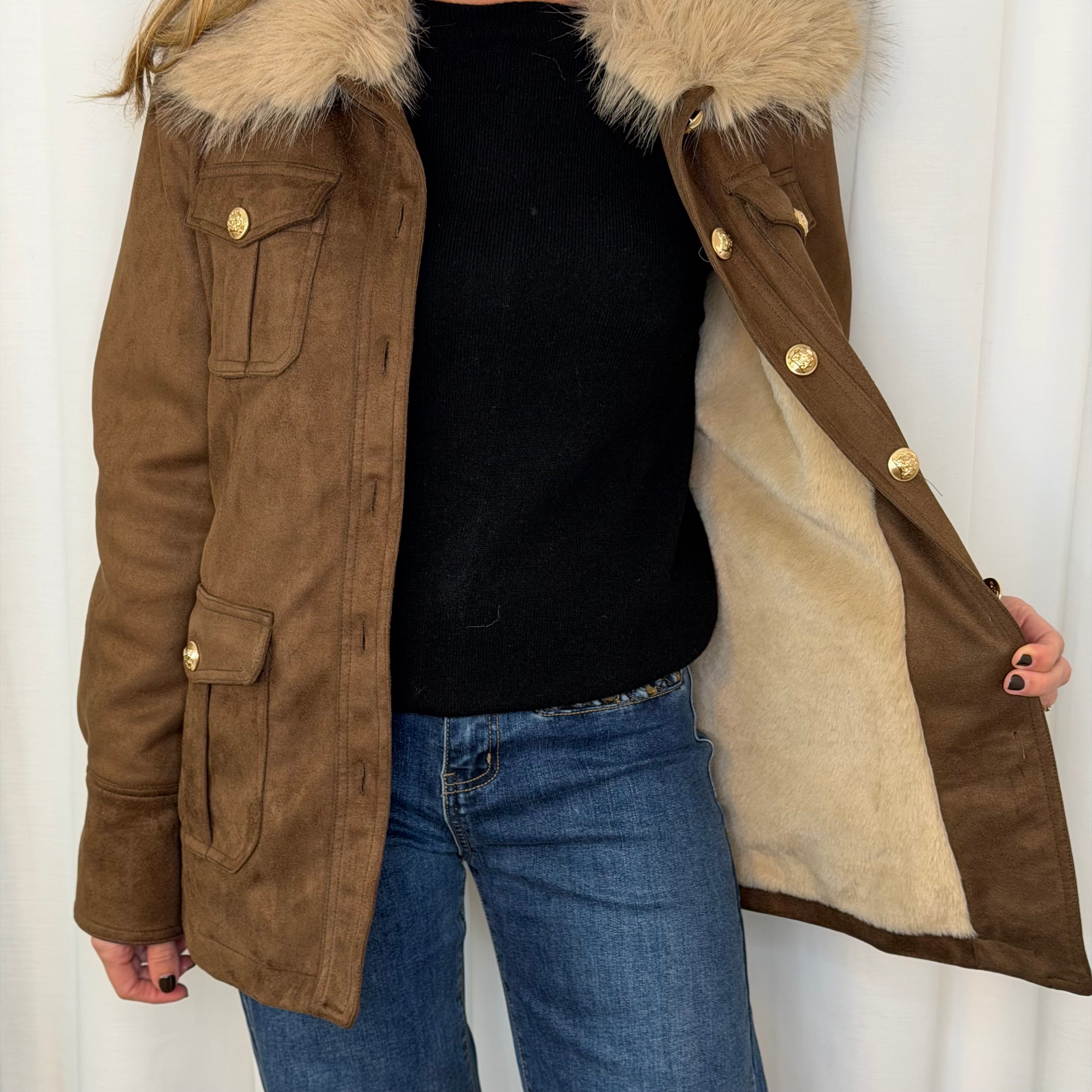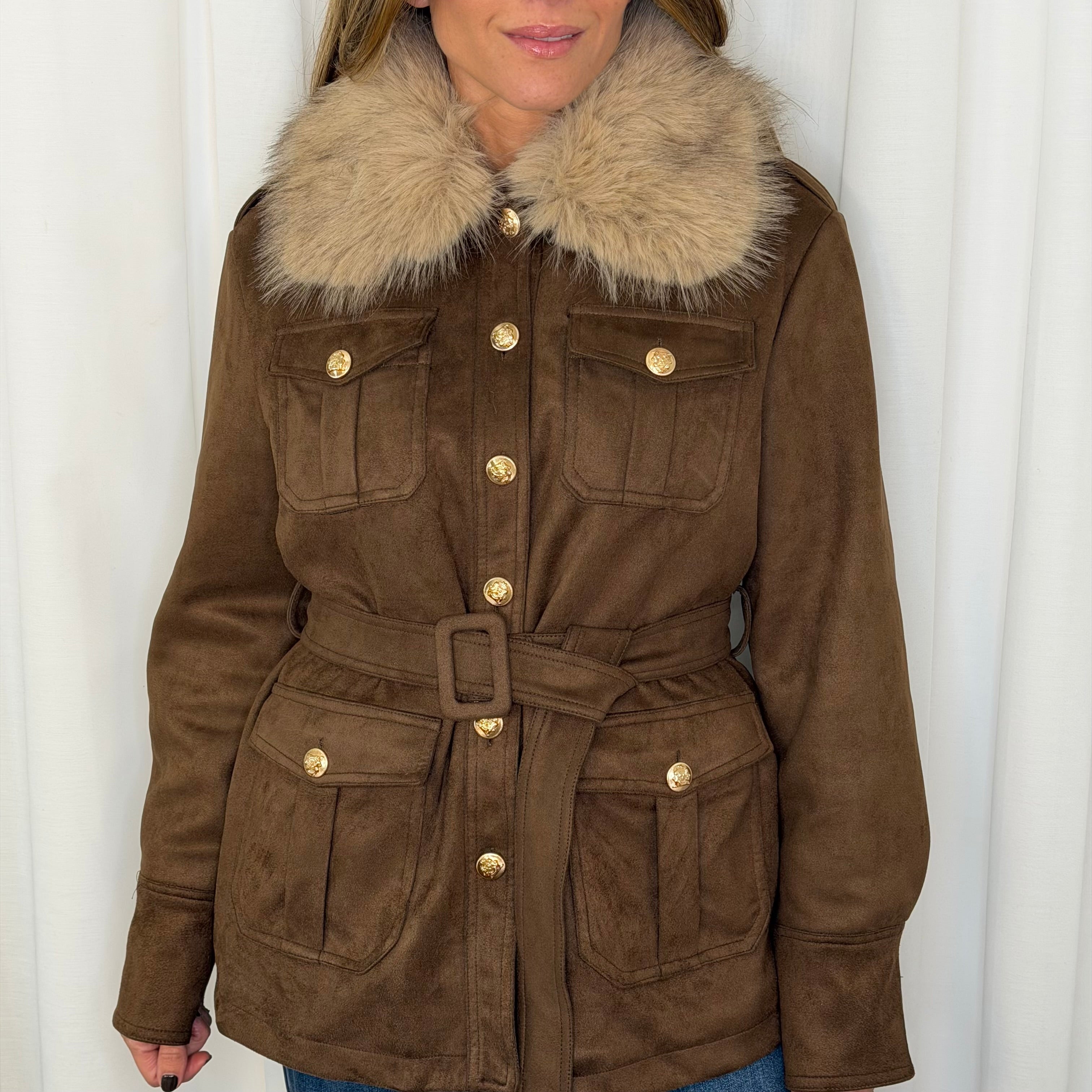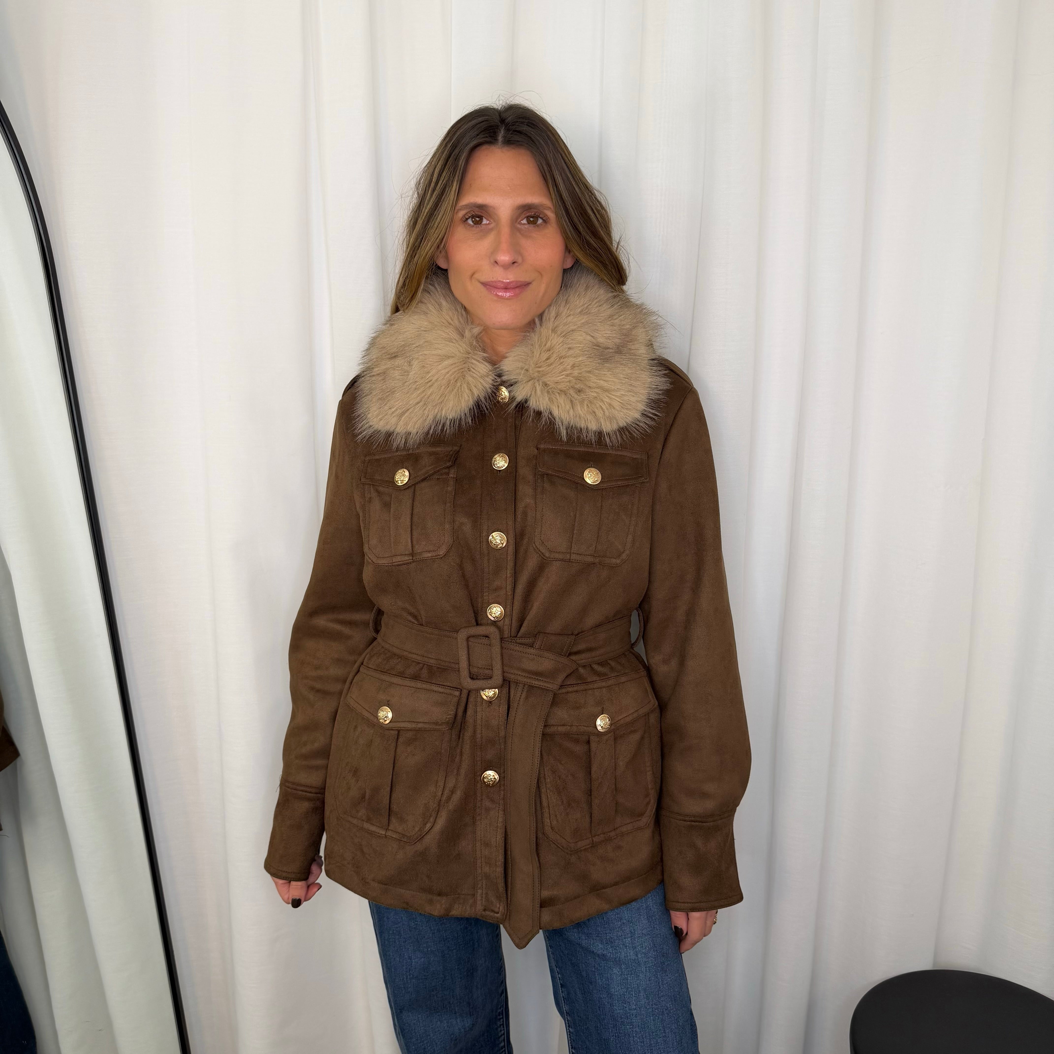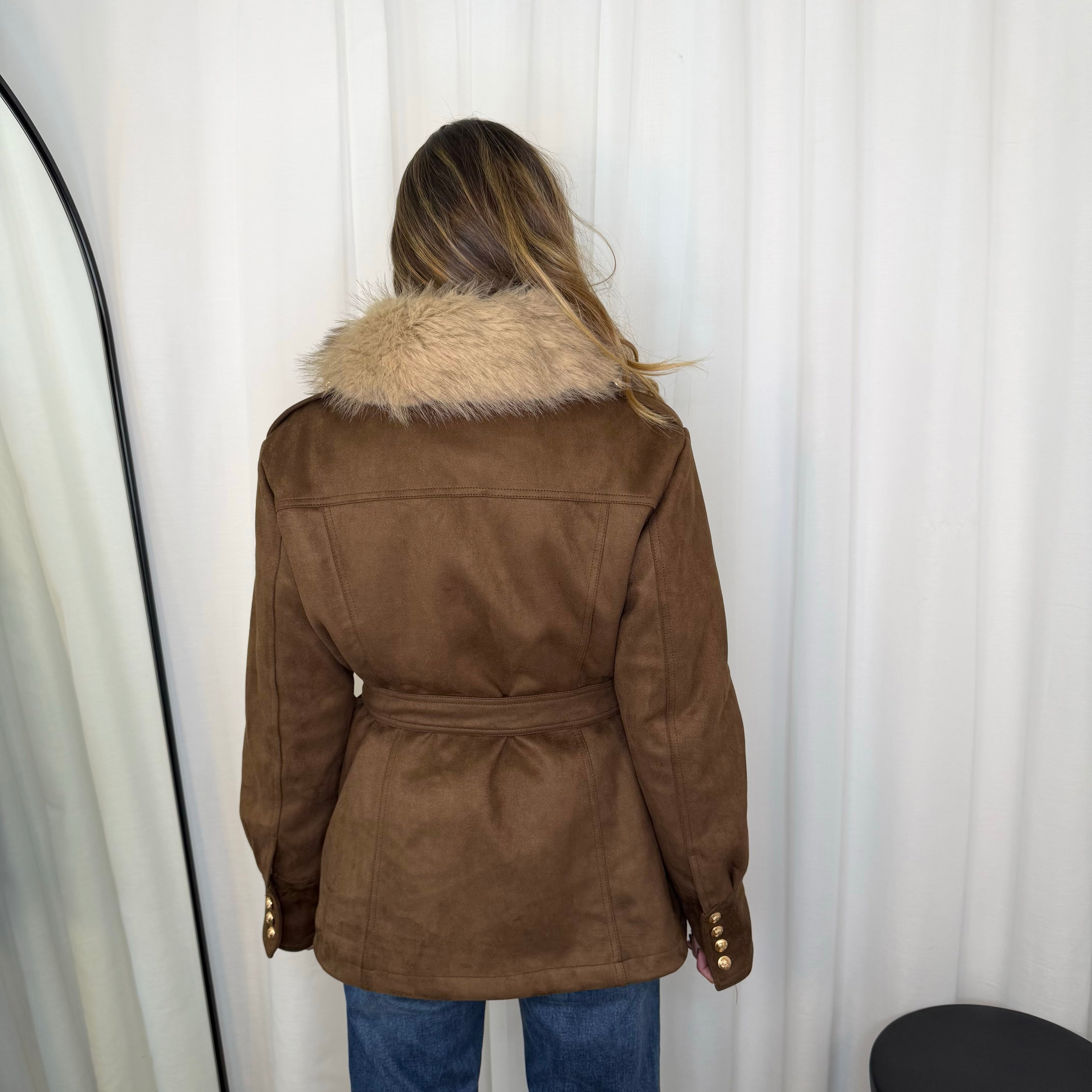 Casaco em nobuck. Gola e forro em pelo. Botões dourados. Aperta com botões e cinto com fivela. Bolsos de chapa à frente.