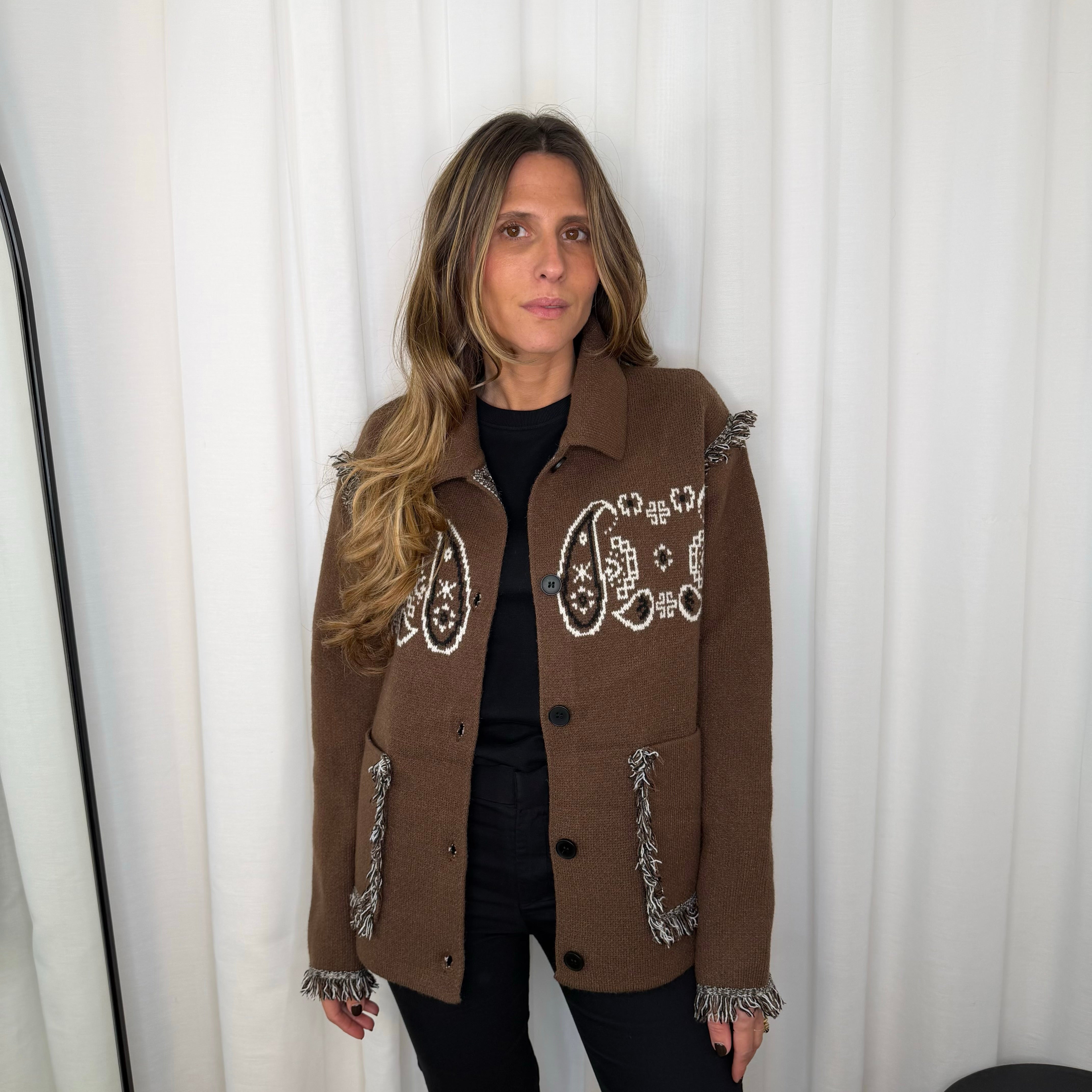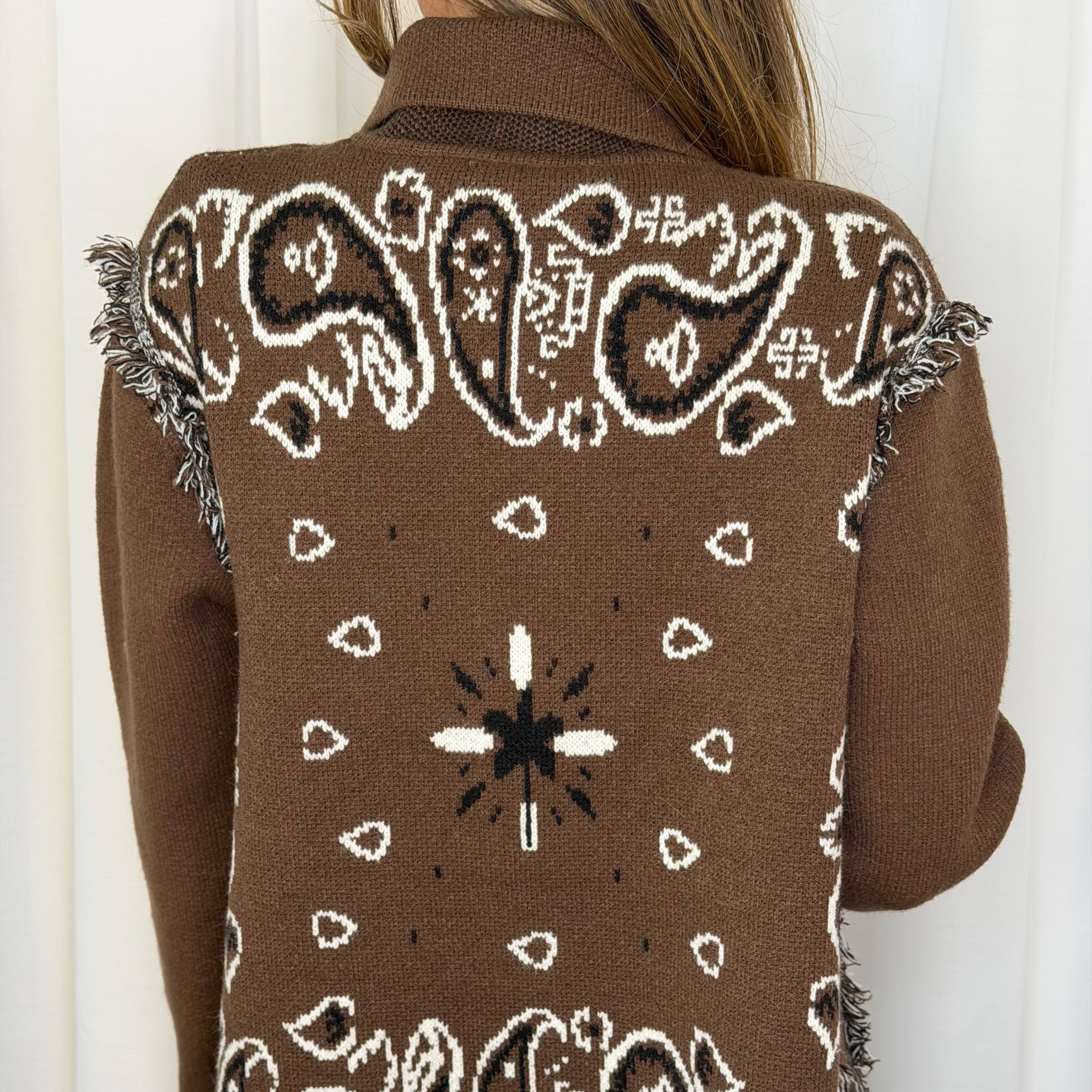 Cardigan malha castanho com estampado de bandanas. Acabamento em franjas. Aperta com botões ao centro. Golas em aba.