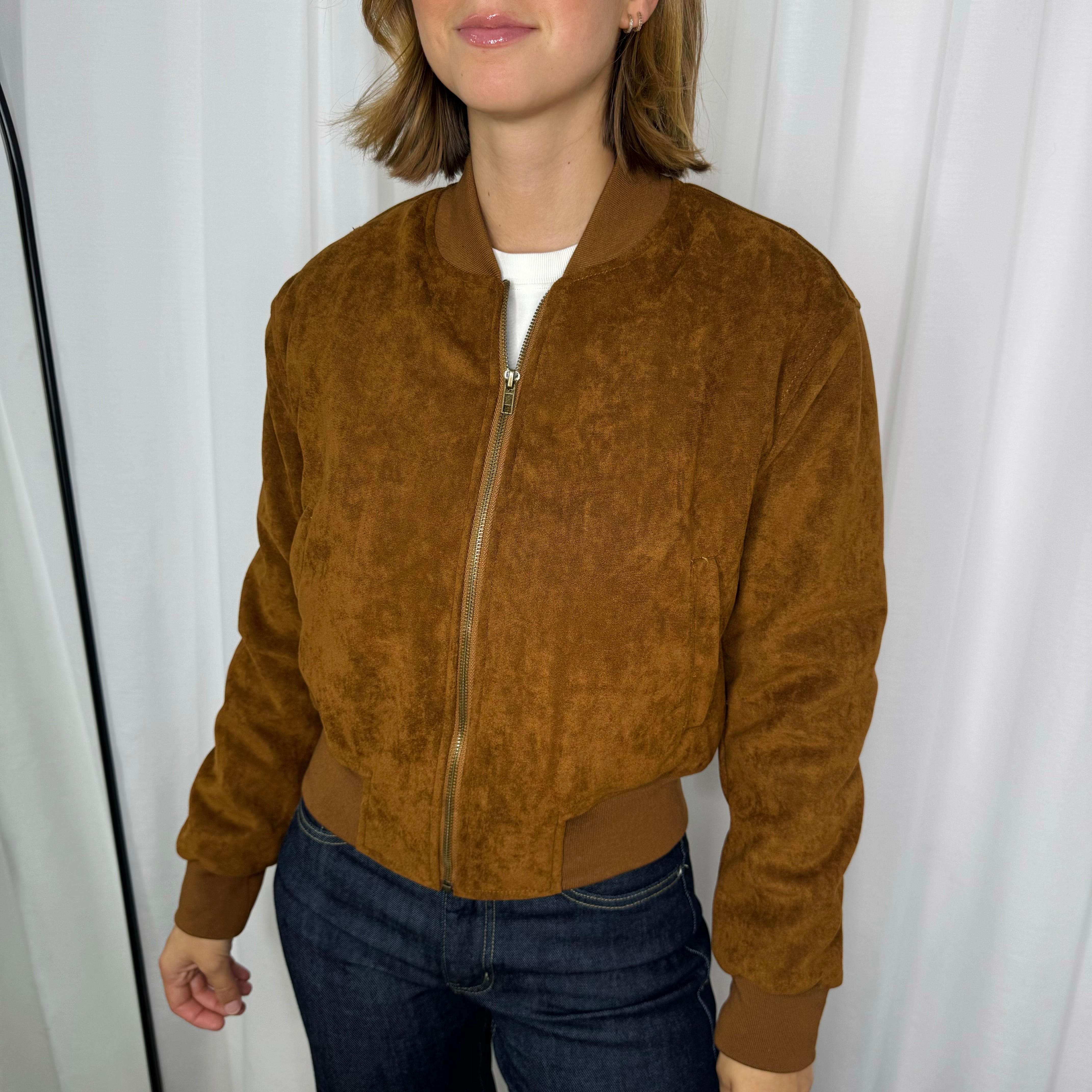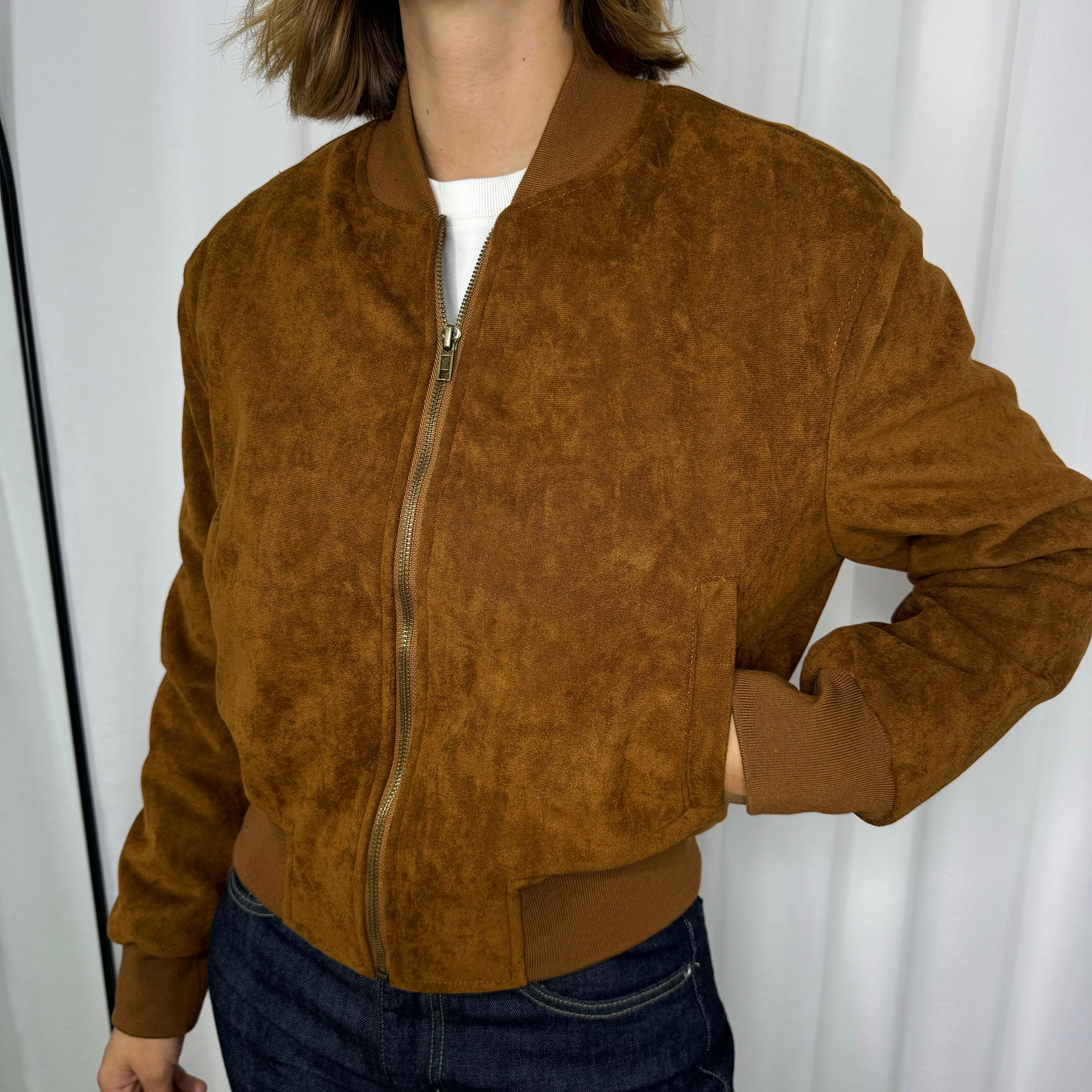 Casaco bomber em camurça camel. Modelo com fecho à frente, gola redonda, punhos e cós em malha canelada.