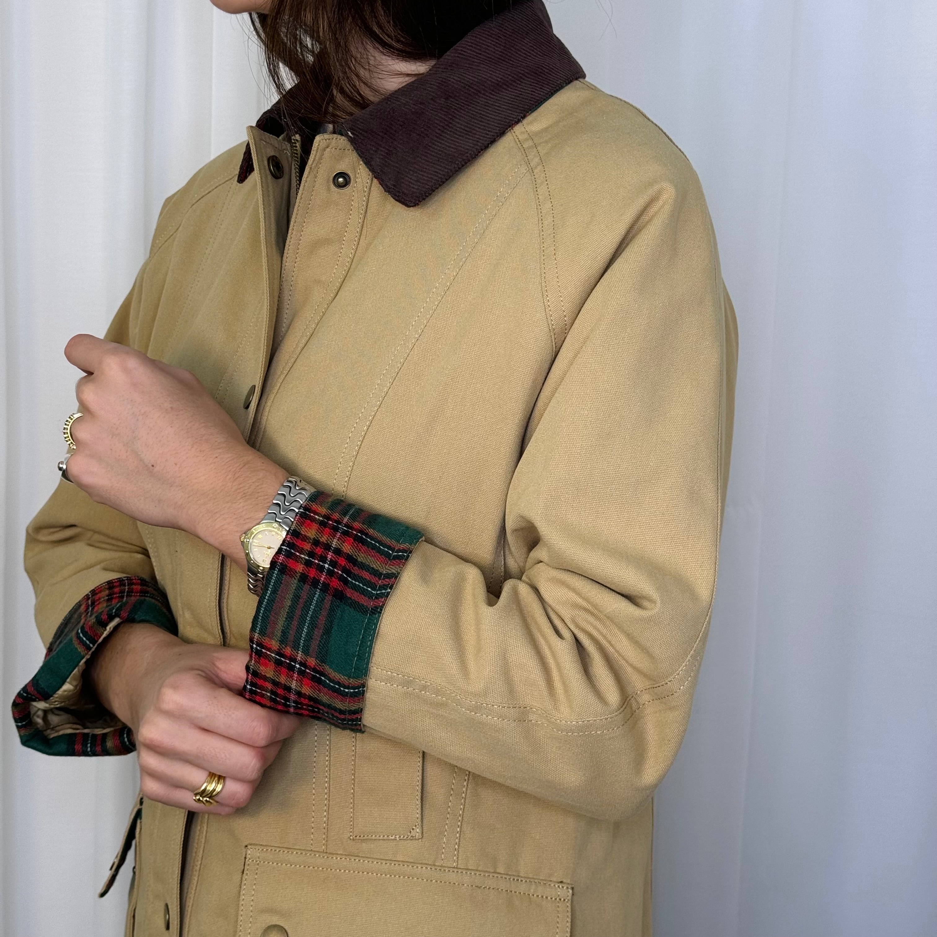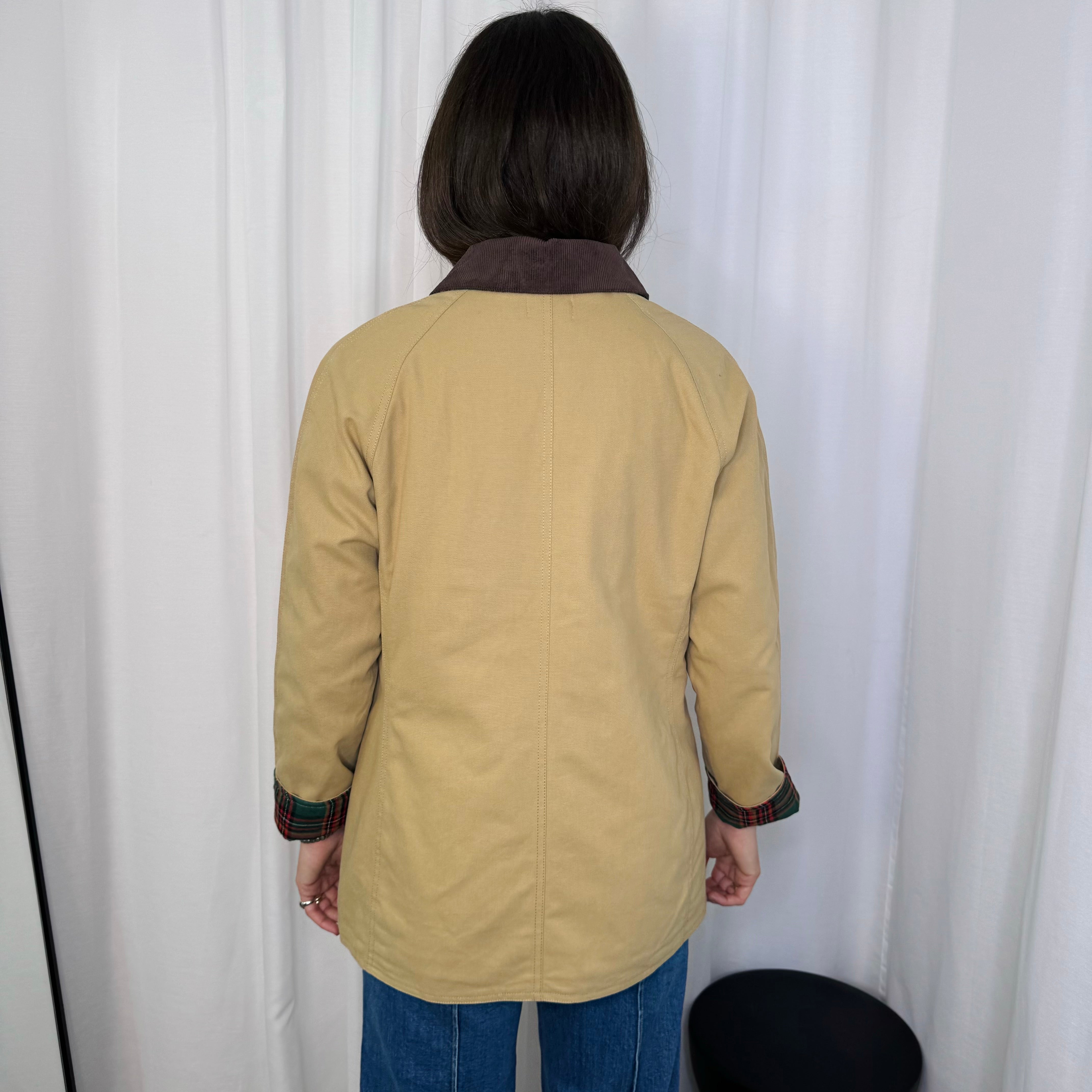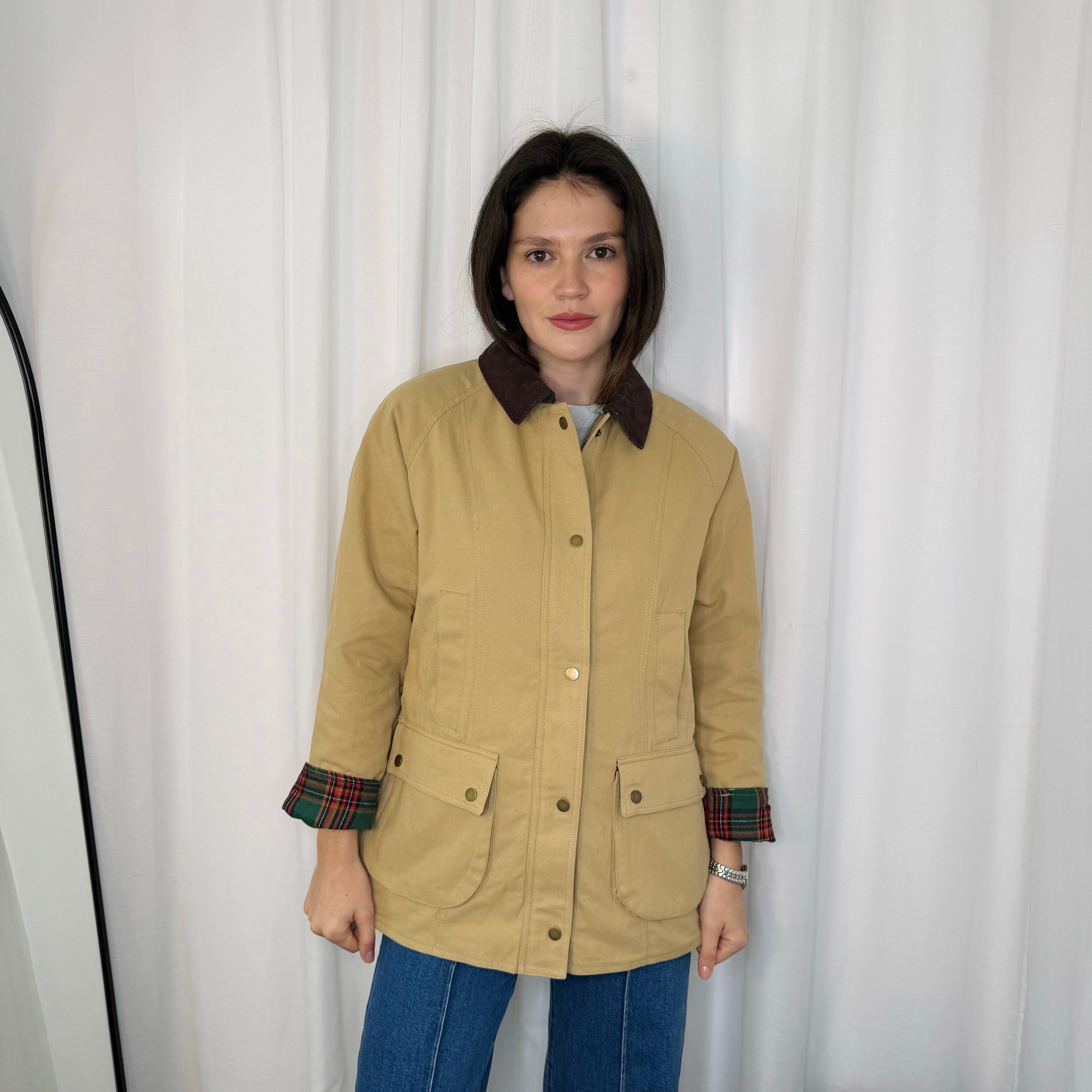 Casaco bege. Gola em bombazine castanho. Aperta com fecho e botões. Forro escocês. Bolsos à frente.