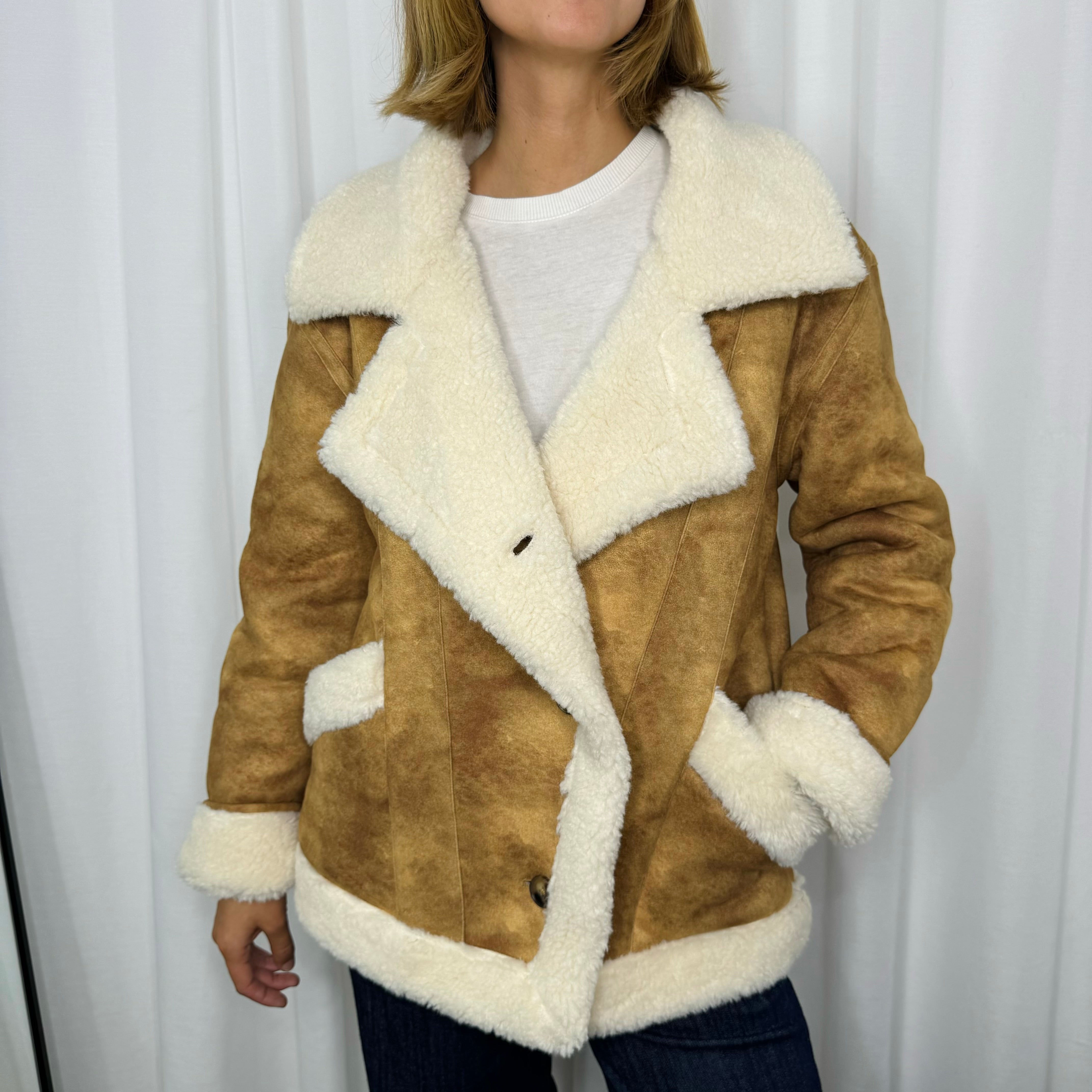 Blusão em camurça camel. Gola em aba. Interior em carneira cru. Bolsos laterais. Aperta com botão.