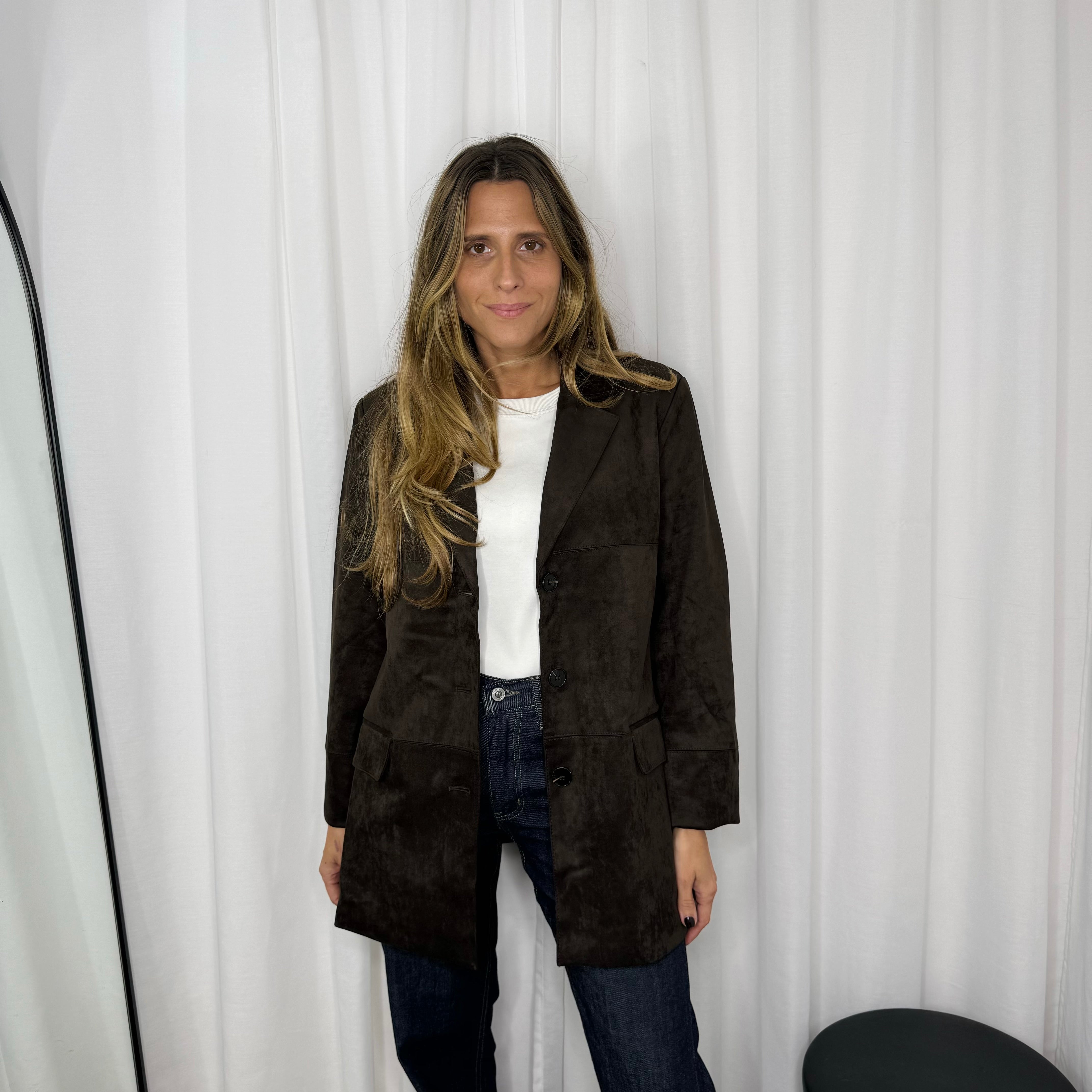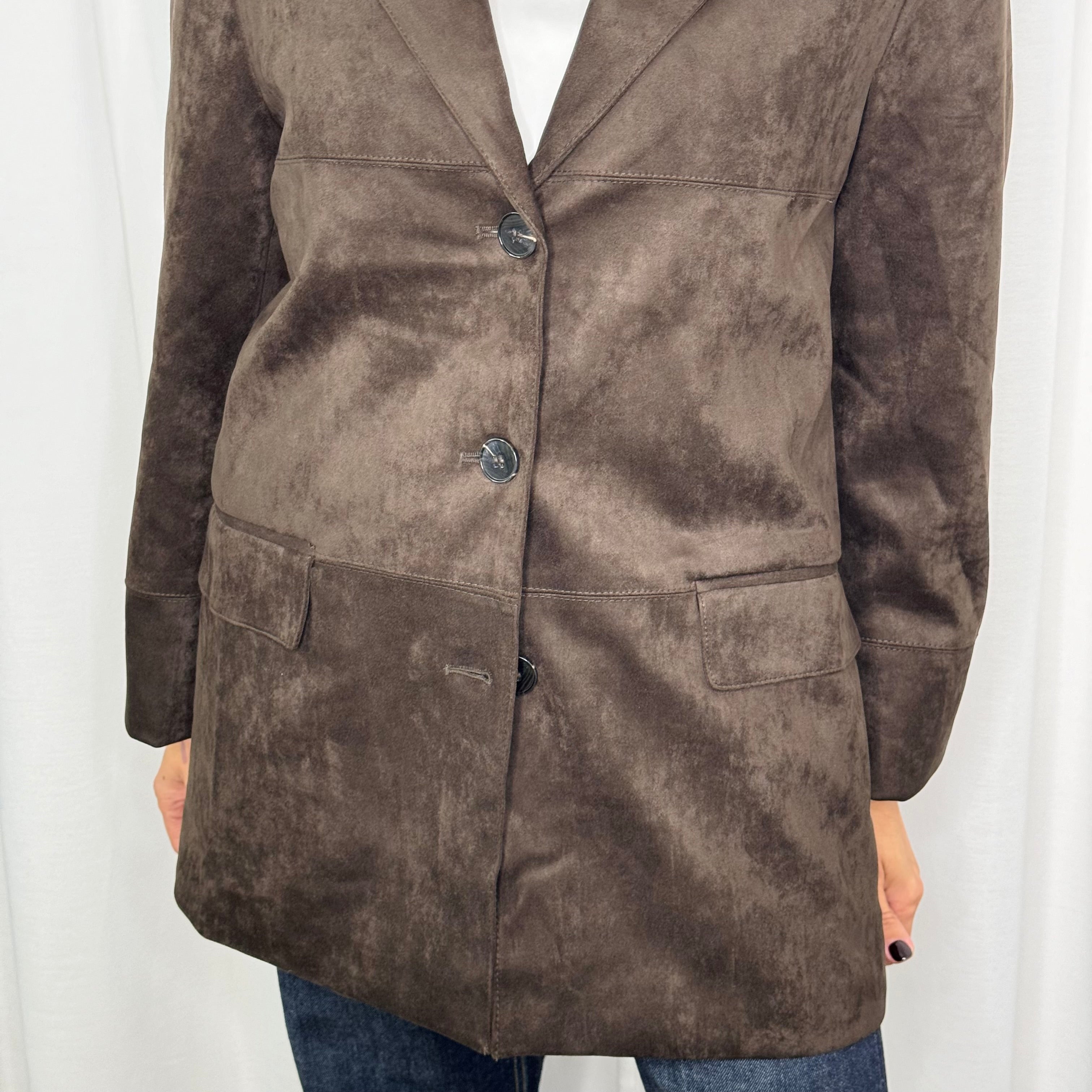 Casaco em camurça castanho com costuras pespontadas, Bolsos de chapa à frente. Aperta com botões ao centro.