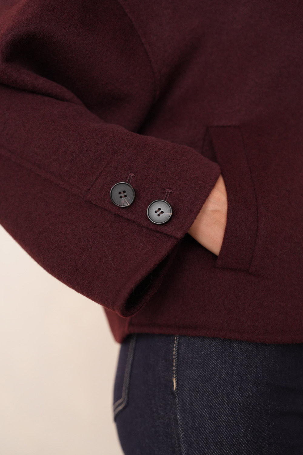 Casaco em fazenda bordeaux. Golas em aba. Aperta com botões ao centro. Bolsos laterais.