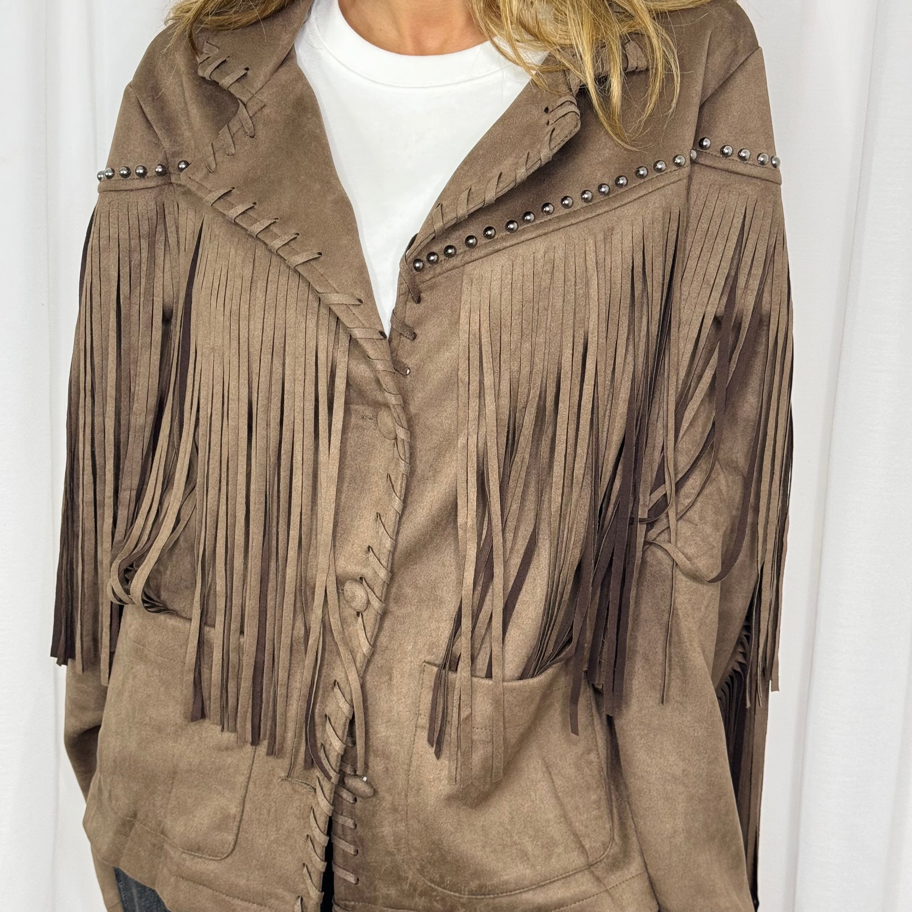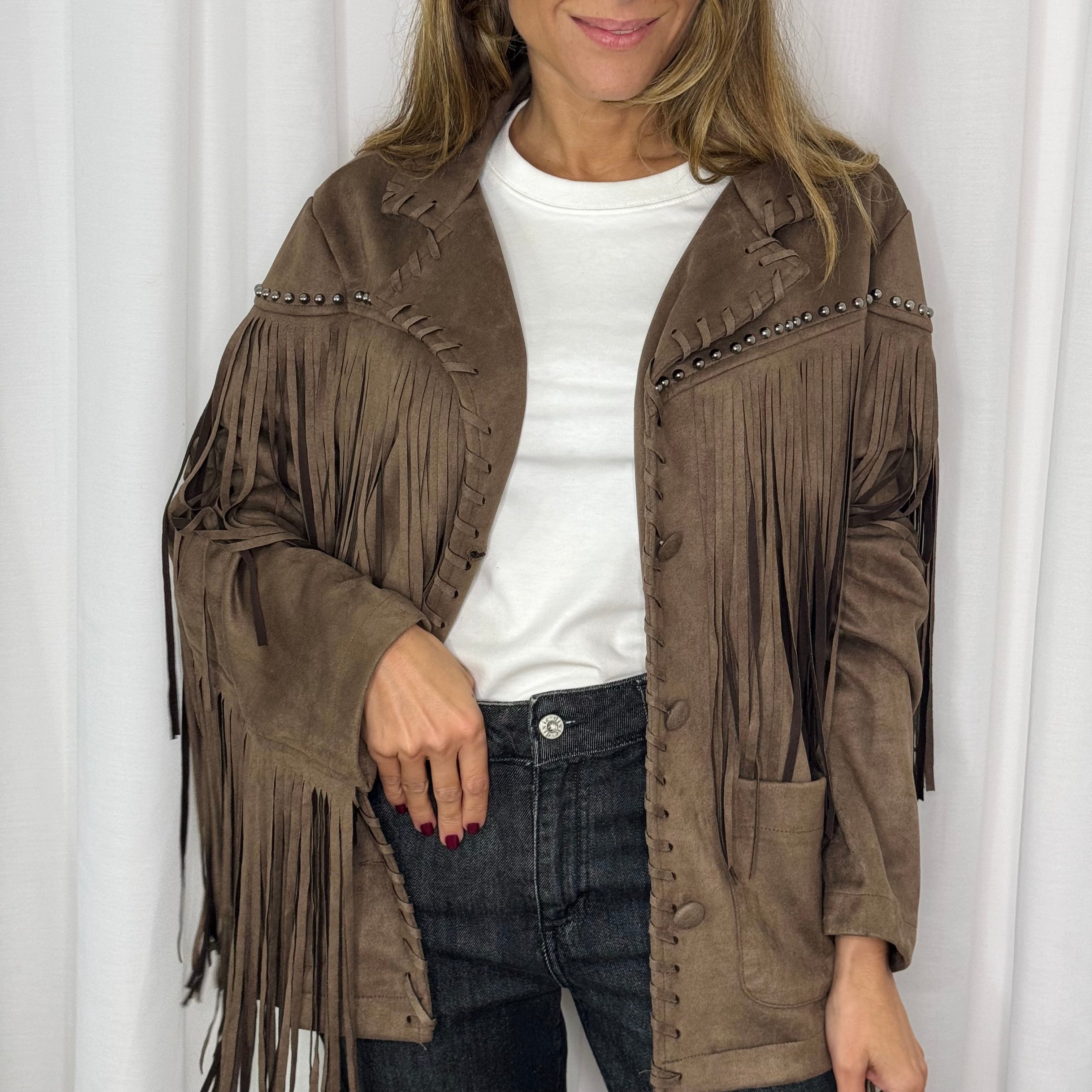 Casaco em camurça com franjas. Toque pele de pêssego. Bolsos à frente. Gola em aba com tachas. Aperta com botões.