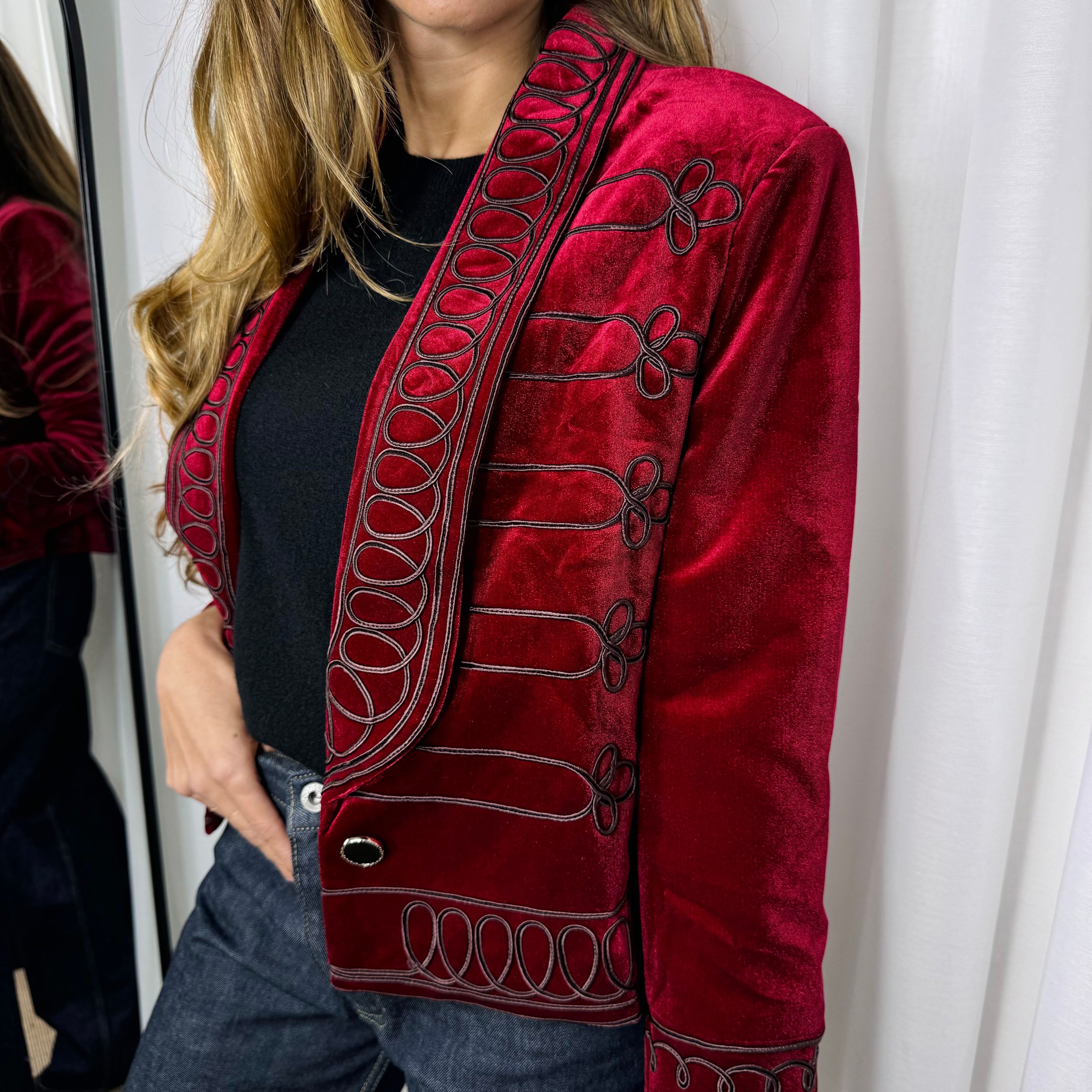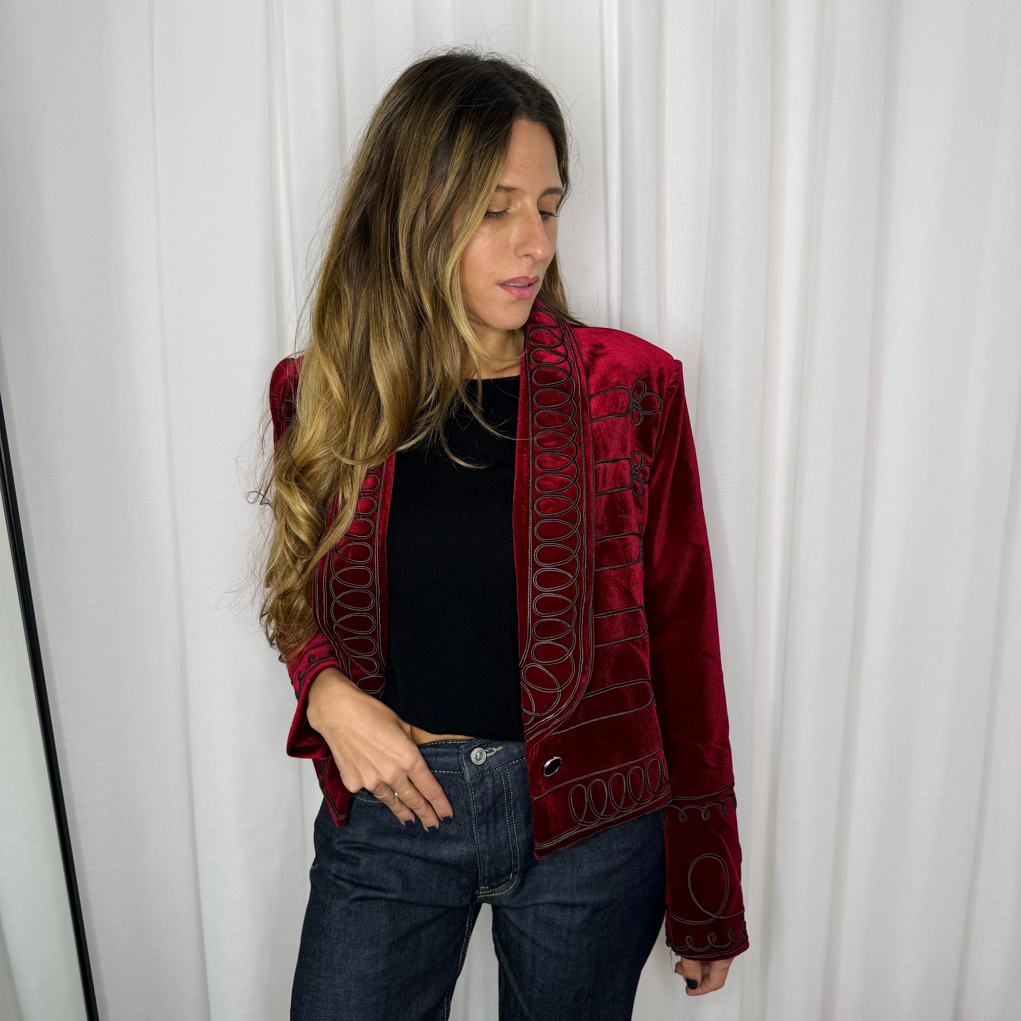 Casaco curto em veludo bordeaux cereja com bordados pretos. Aperta com botão ao centro.