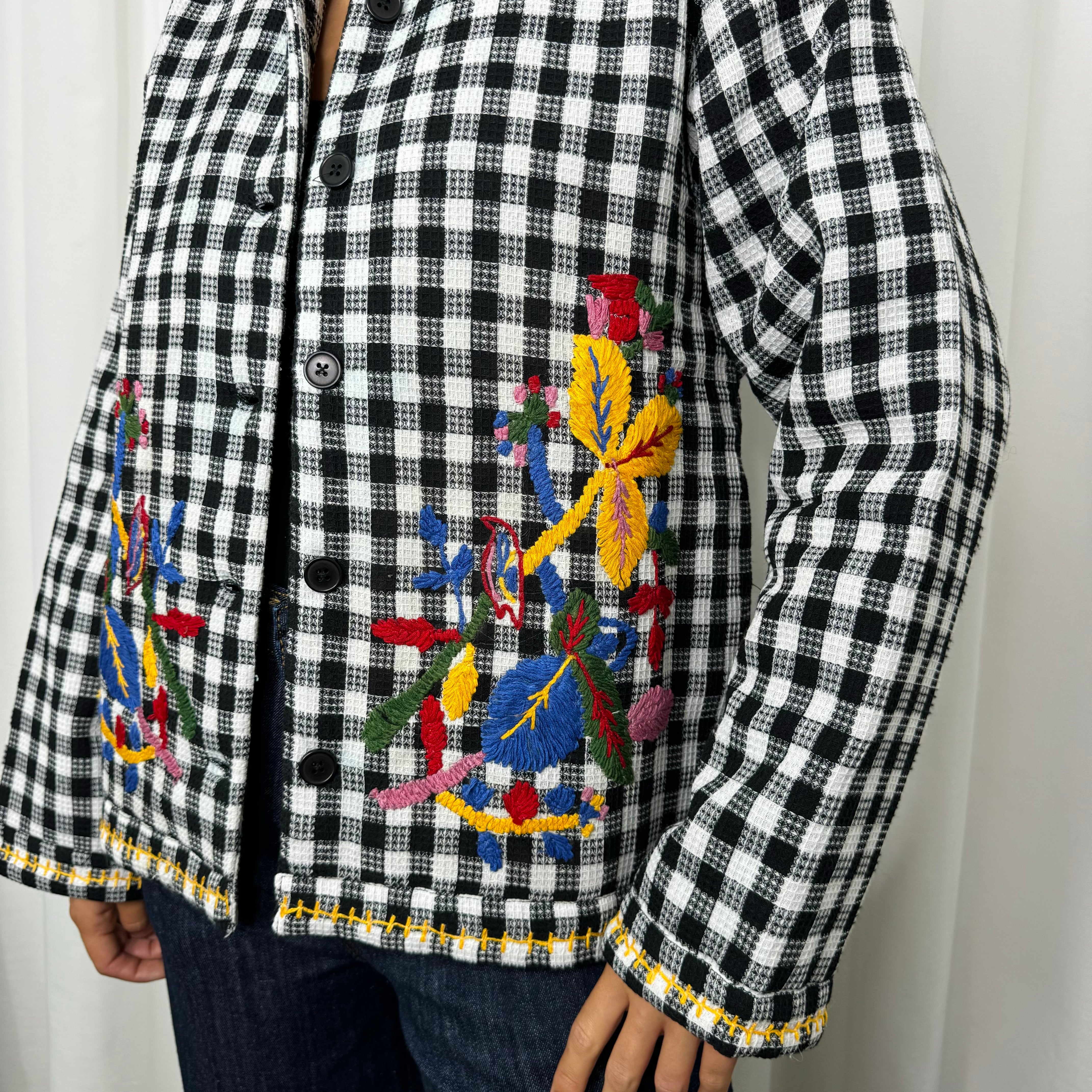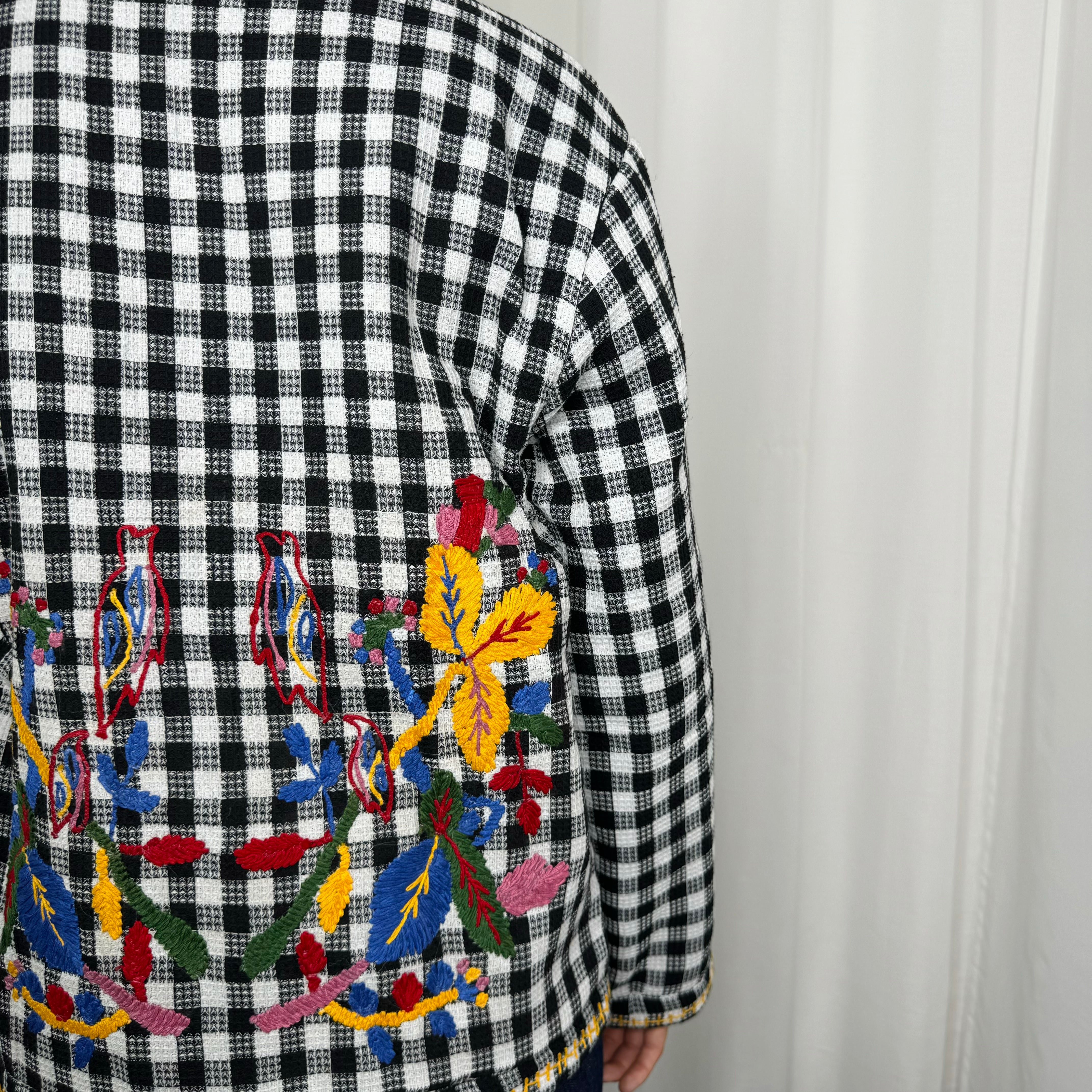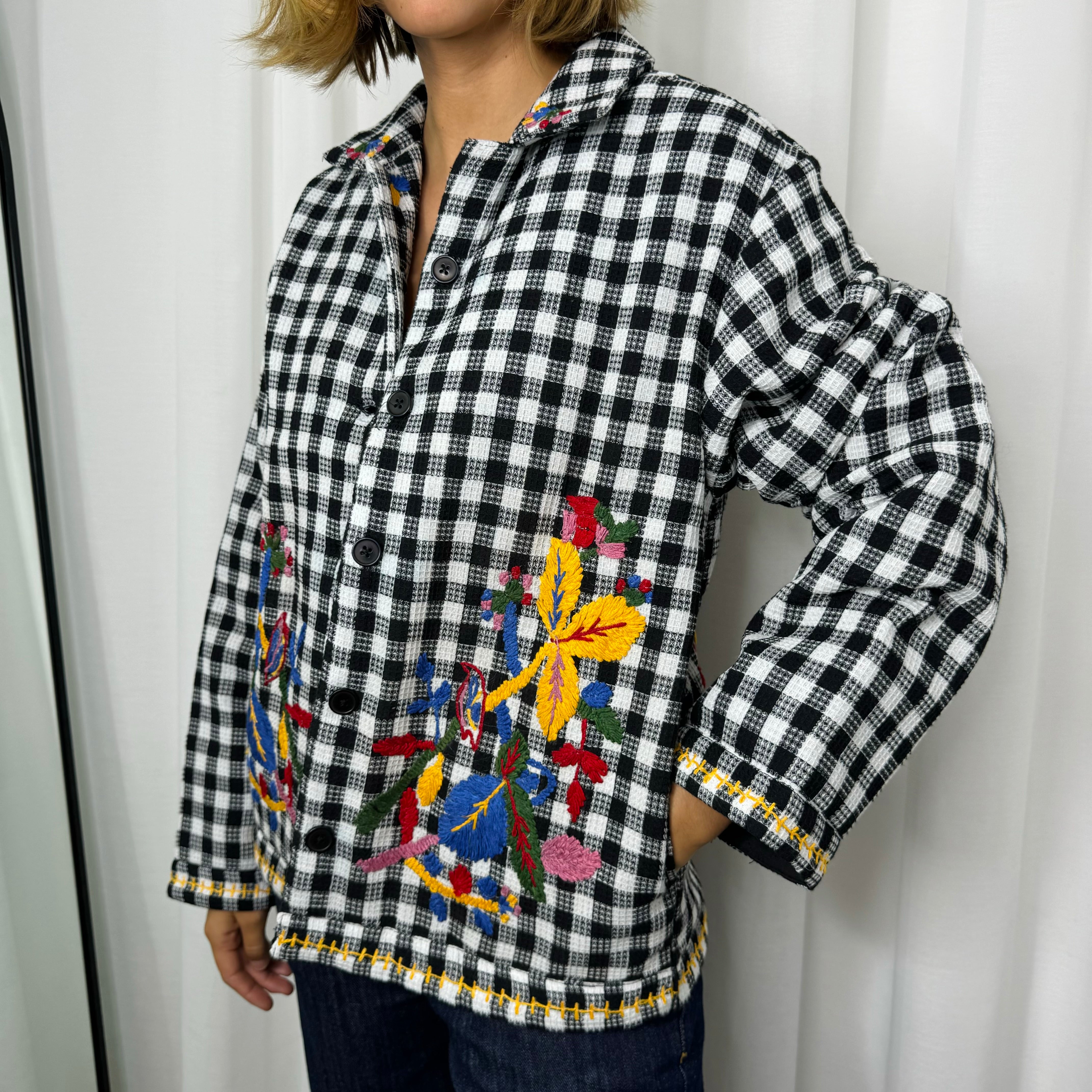 CASACO VICHY PRETO E BRANCO COM BORDADOS MULTICOLOR