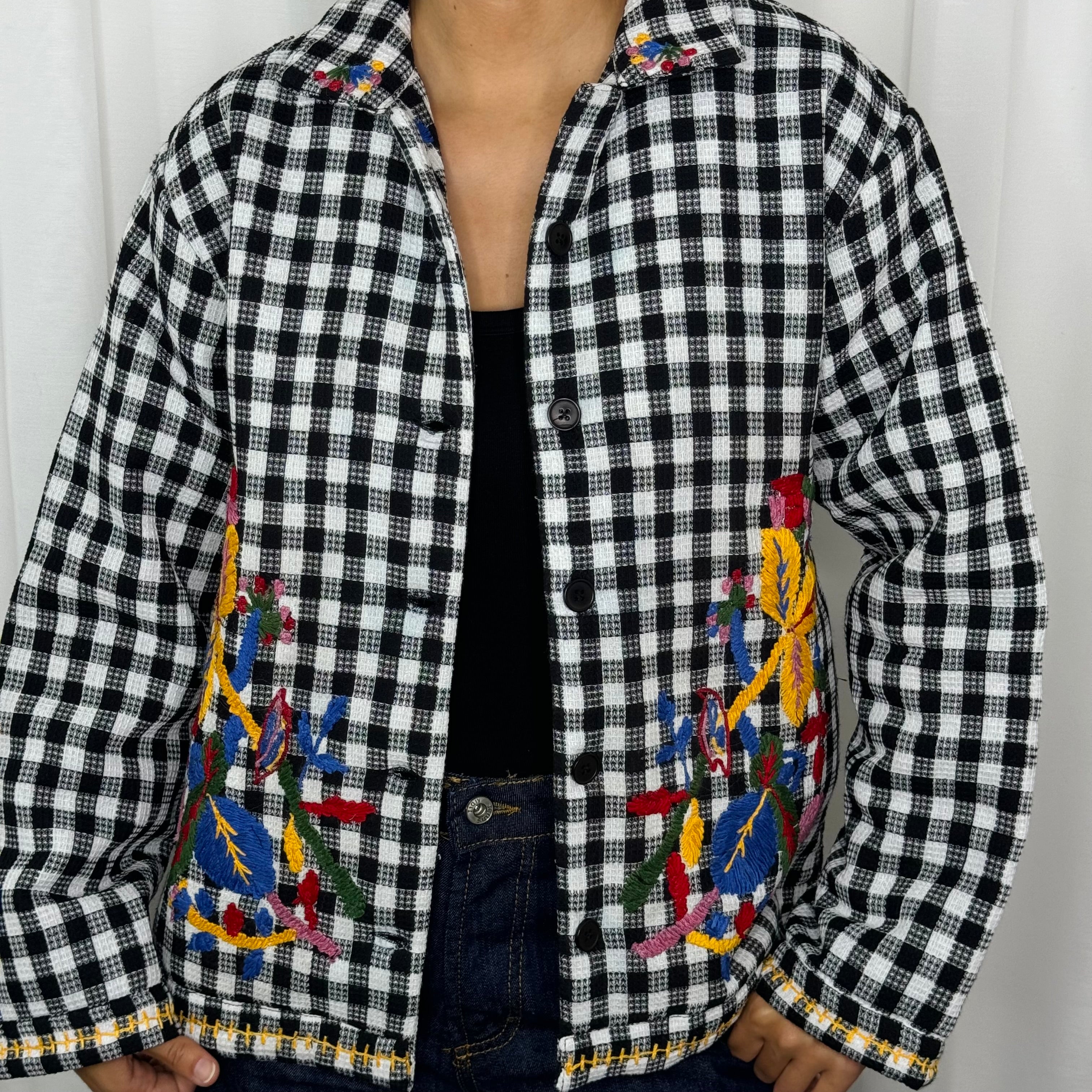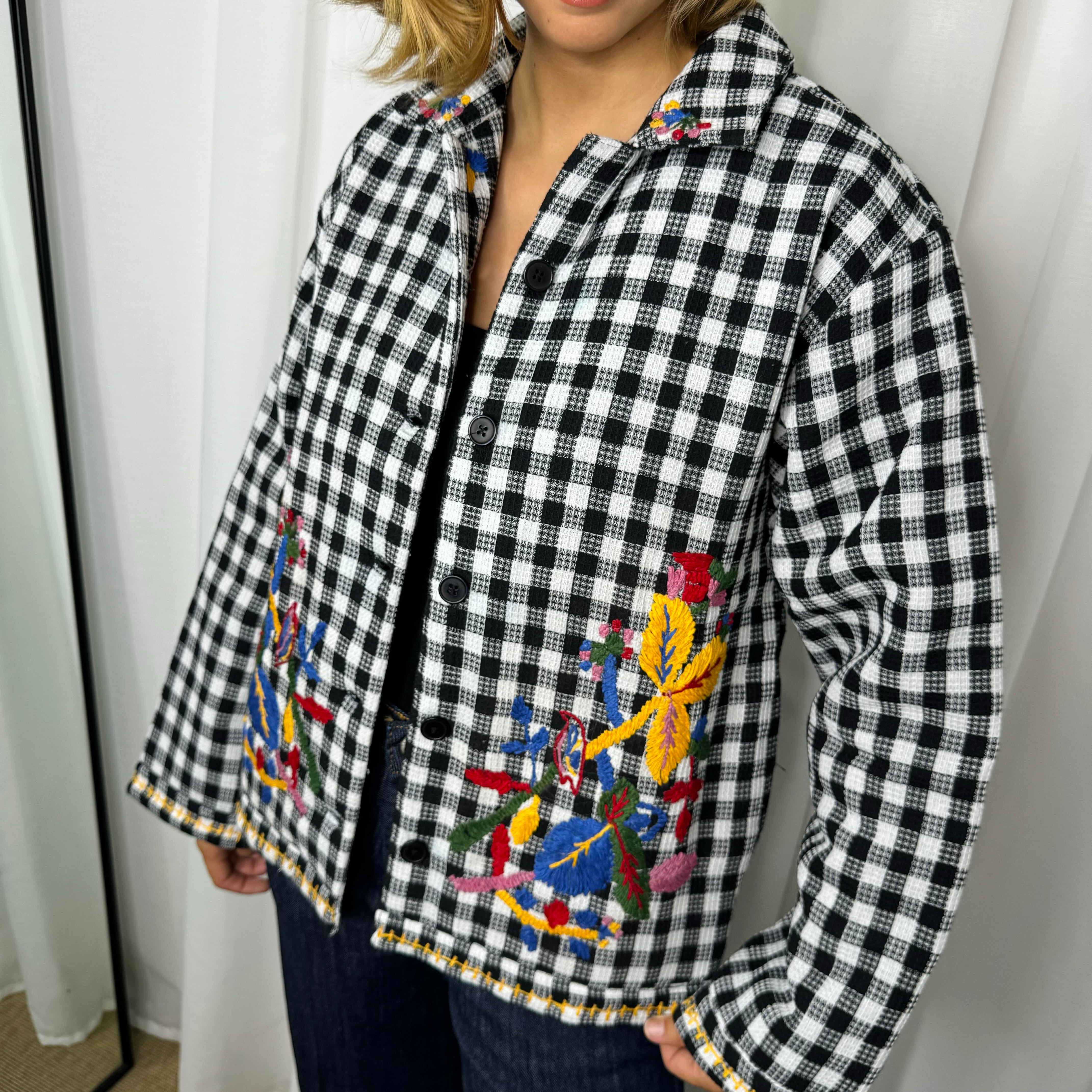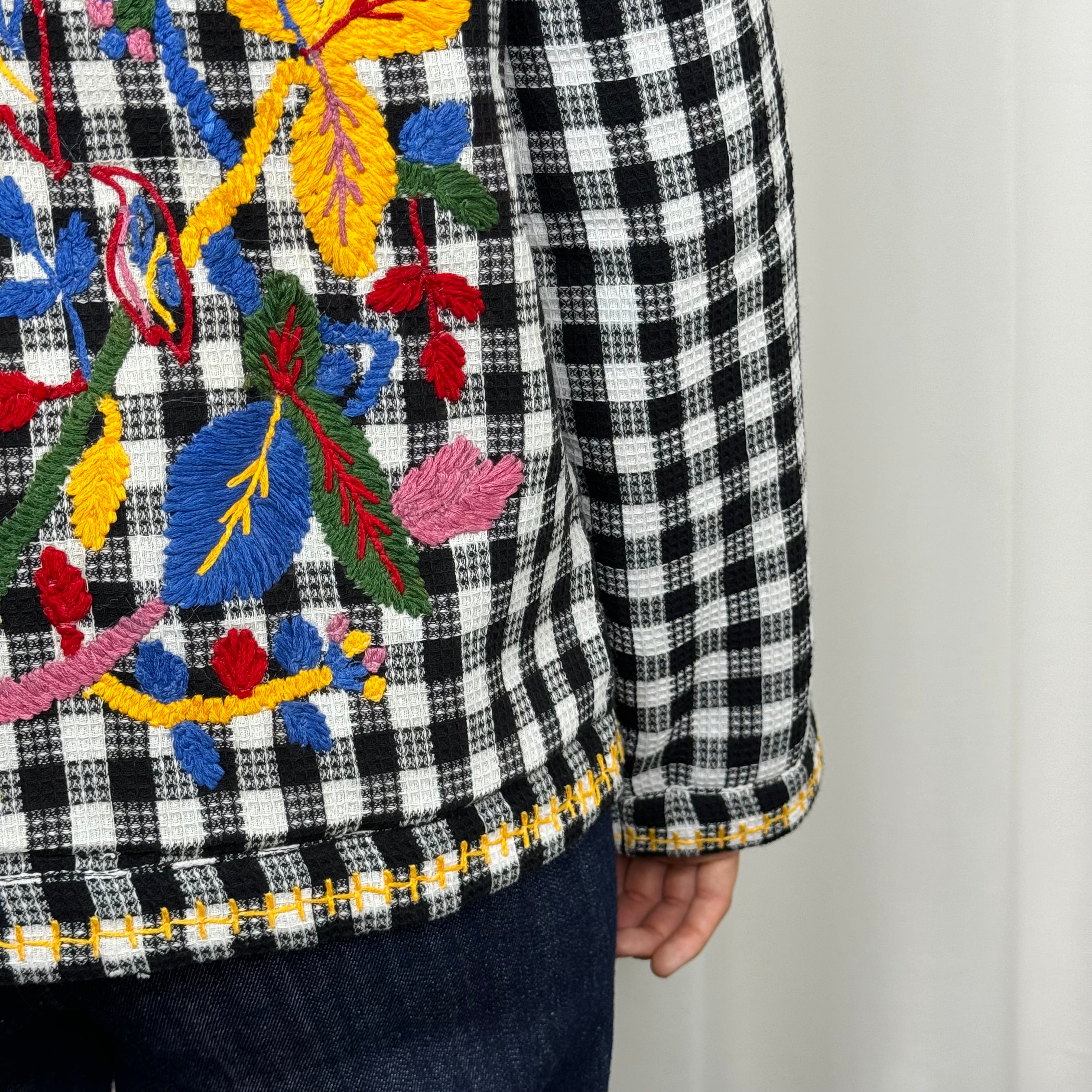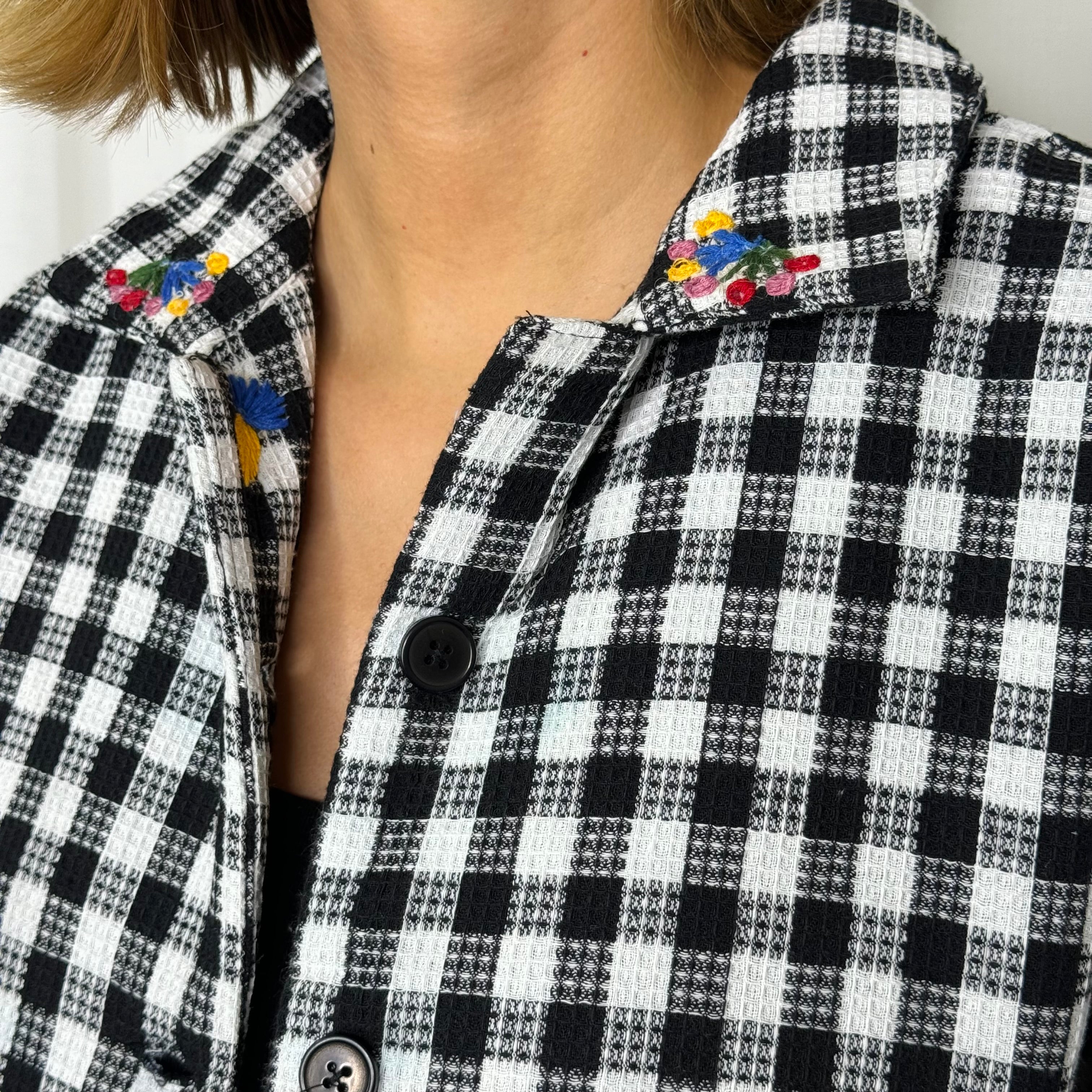 CASACO VICHY PRETO E BRANCO COM BORDADOS MULTICOLOR
