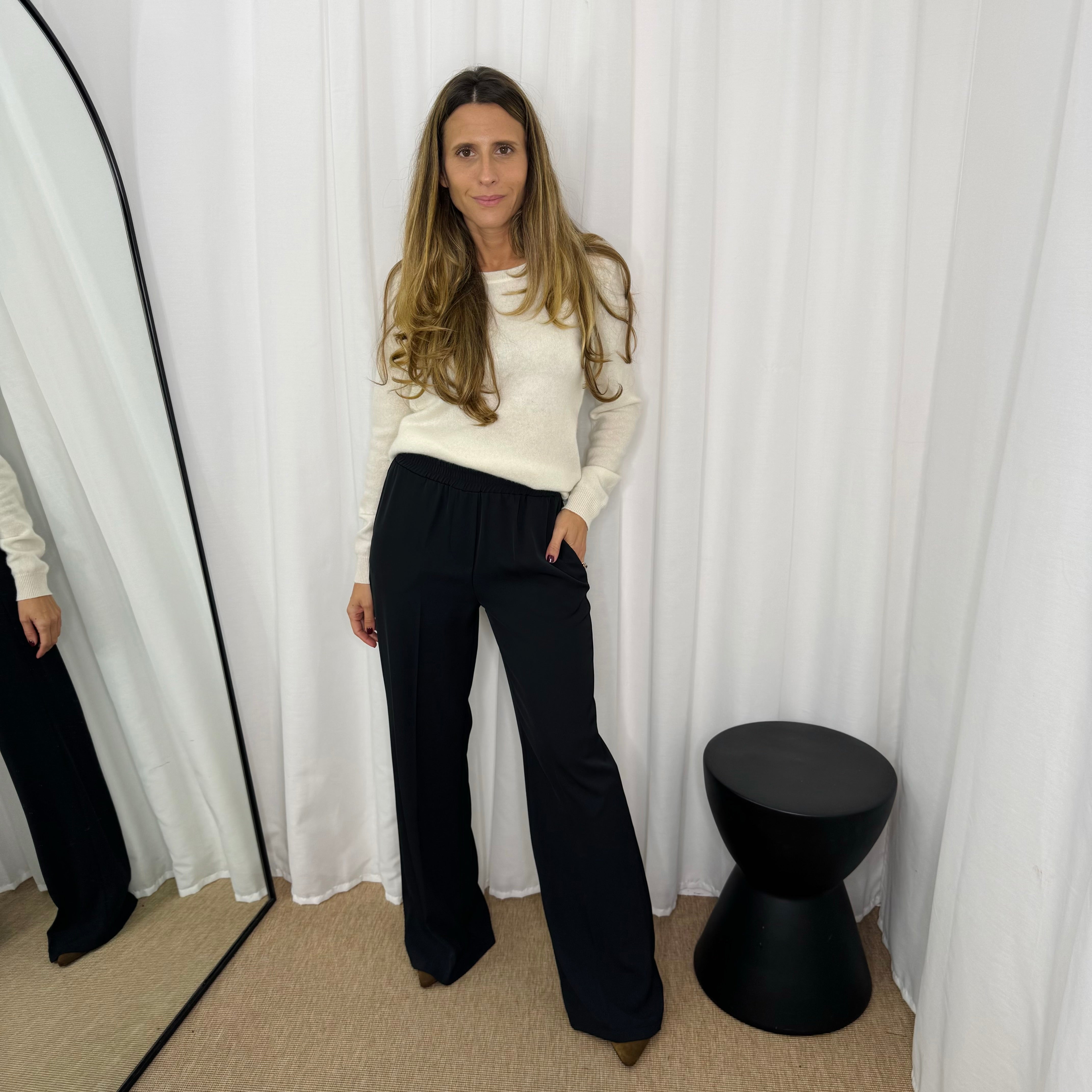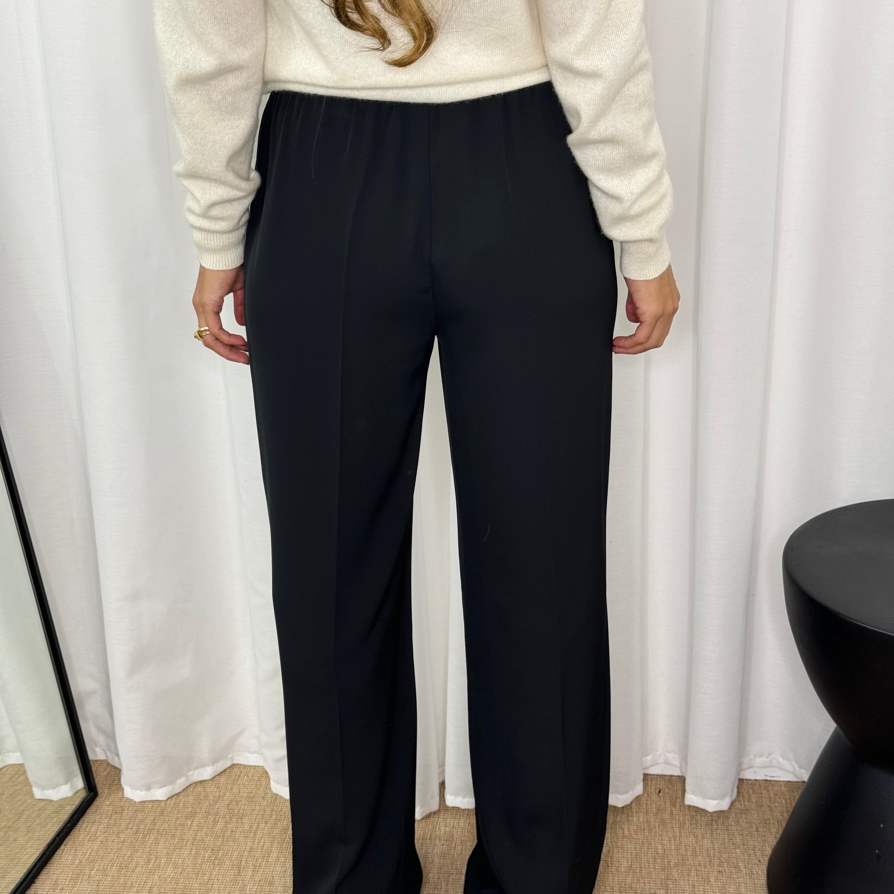 Calças modelo a direito. Perna larga. Tecido fino e confortável. Elástico na cintura. Bolsos laterais.
