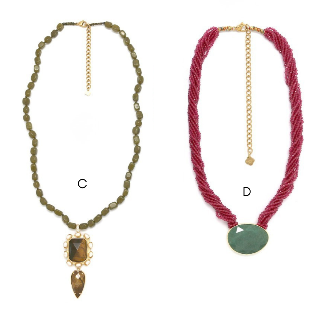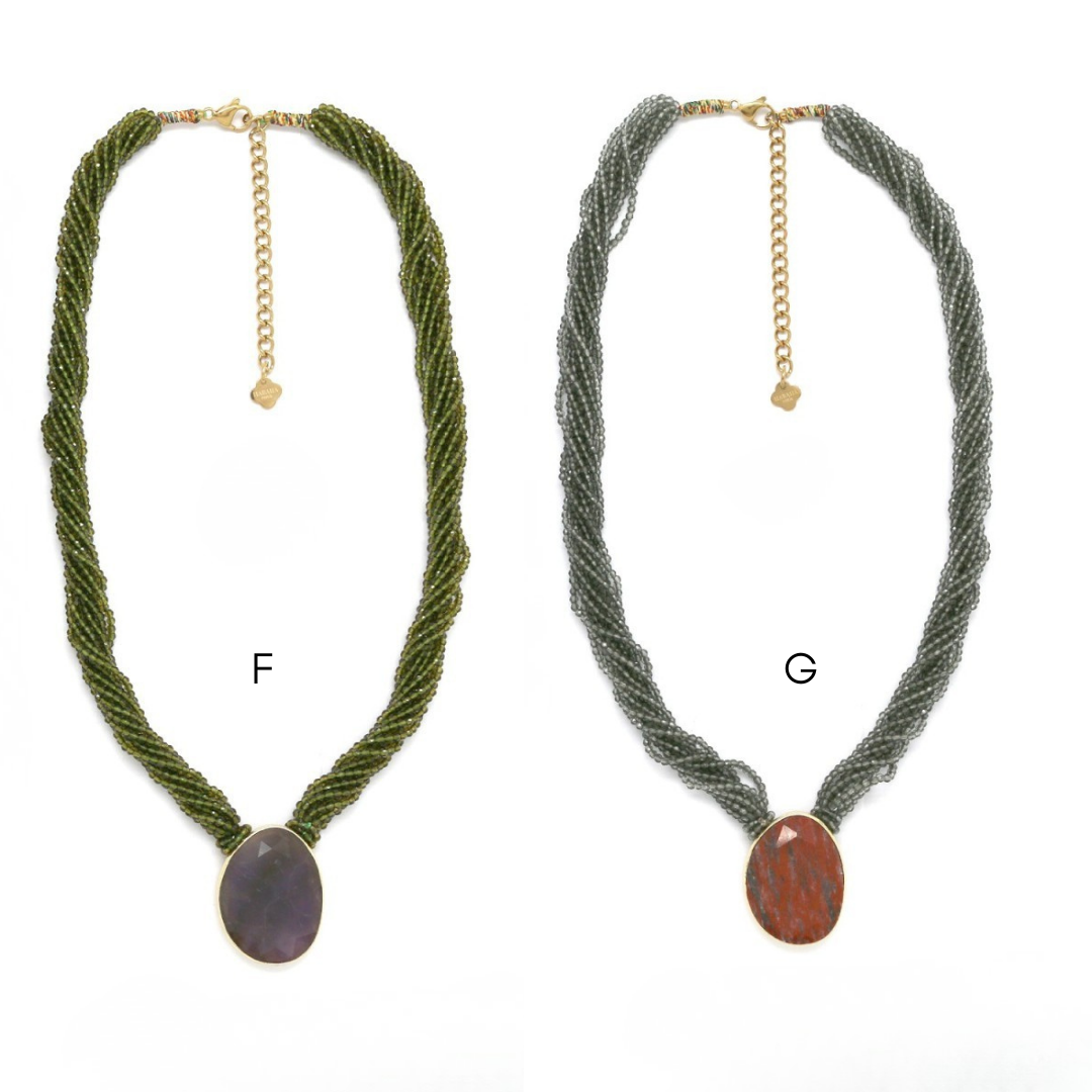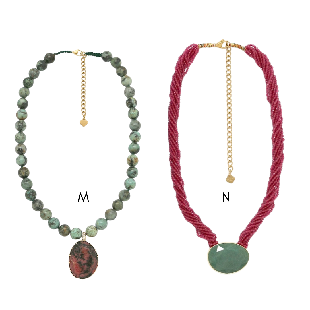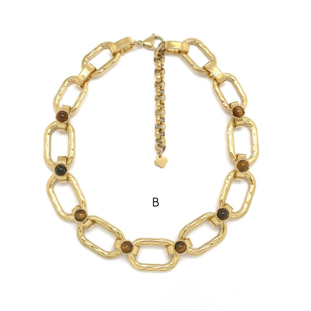 Colares em aço inoxidável e em pedras naturais.