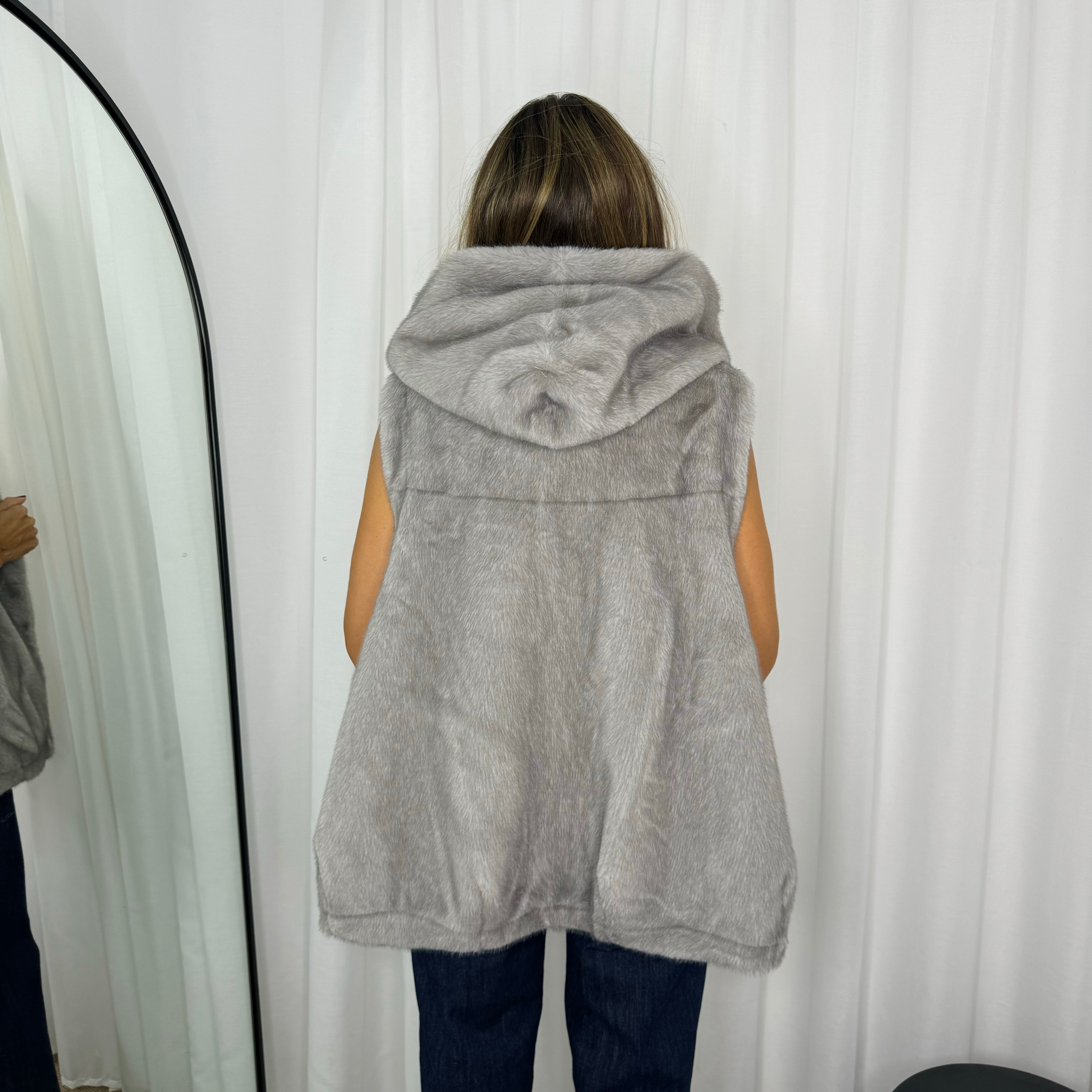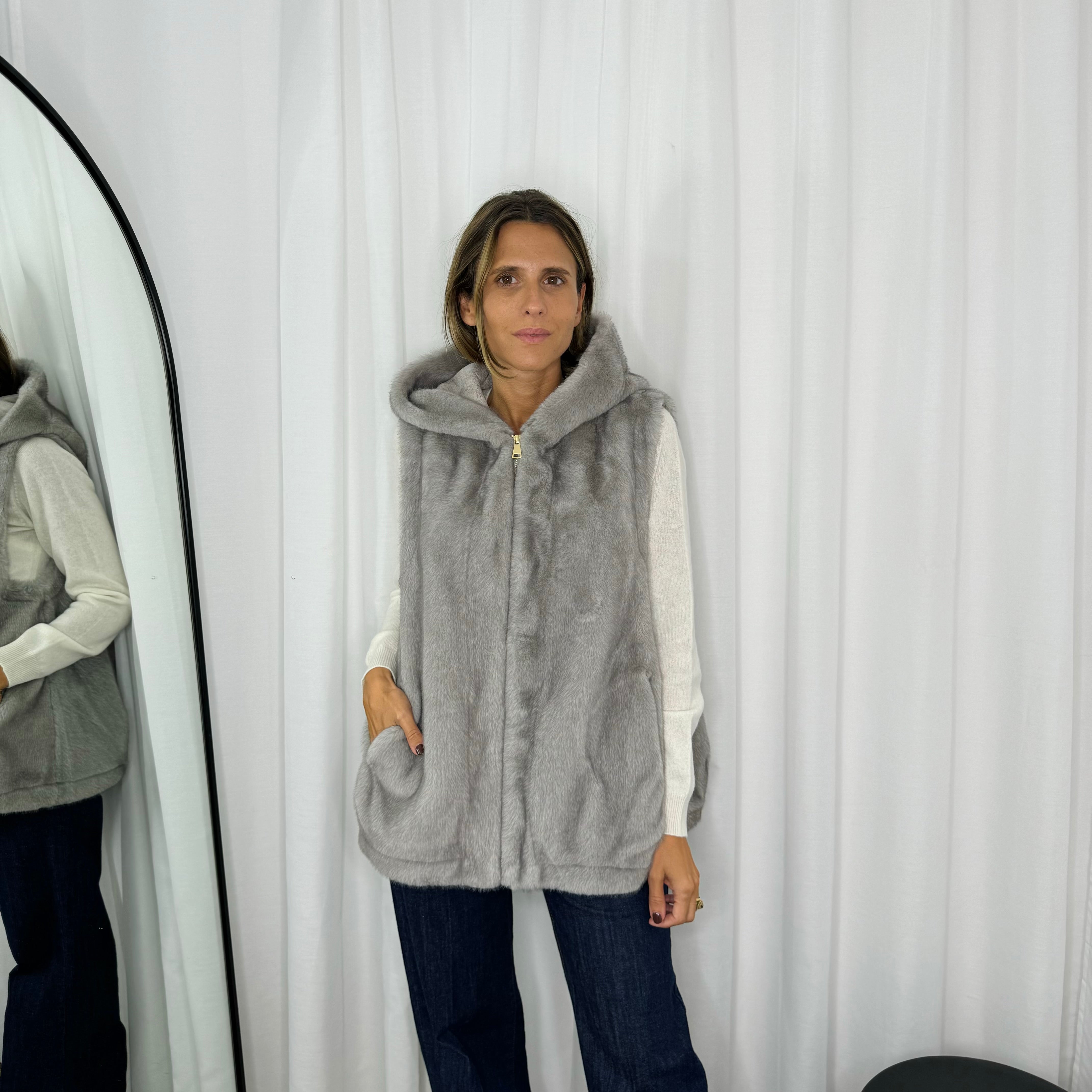 Colete comprido com capuz. Pelo sintético. Aperta com fecho zíper. Bolsos laterais.