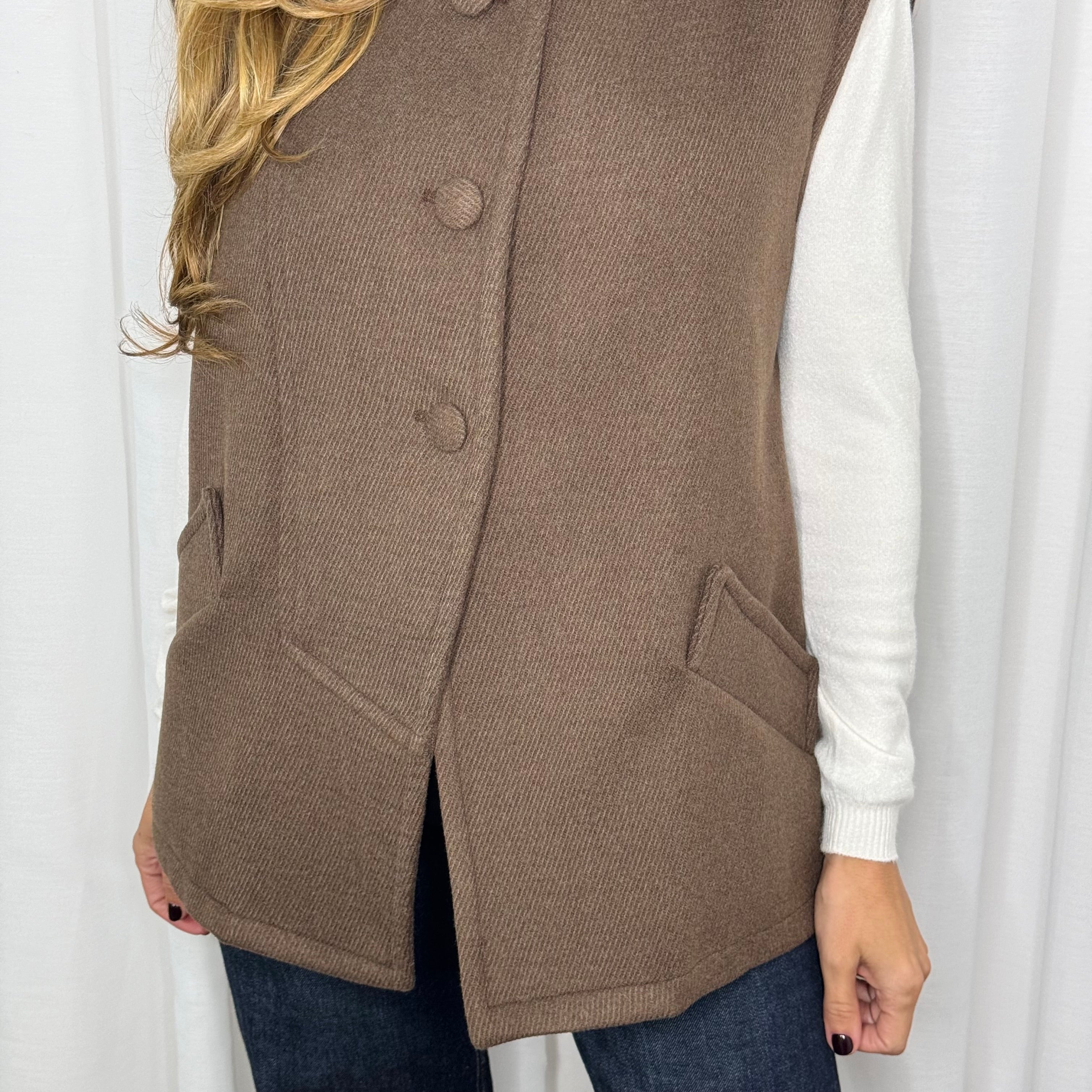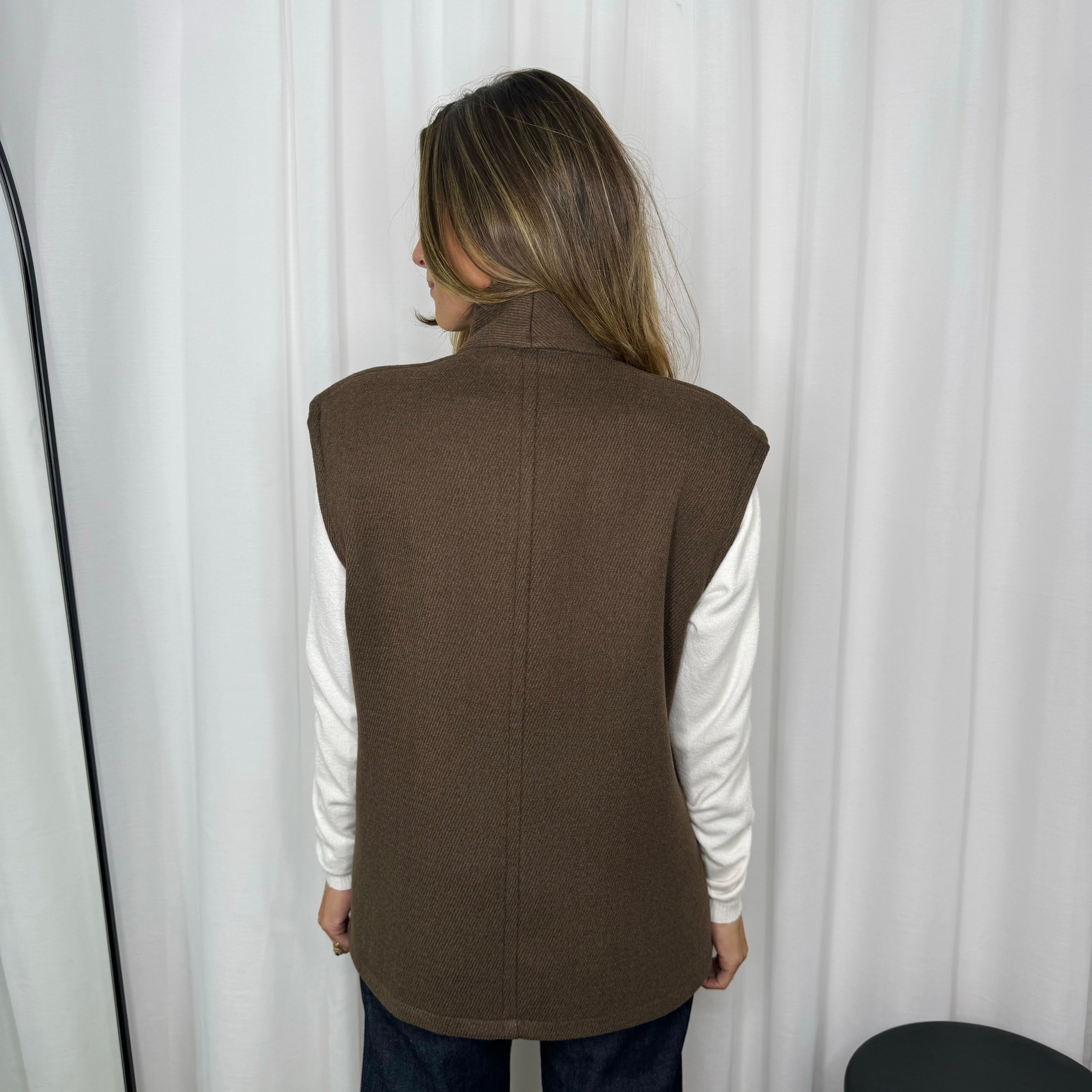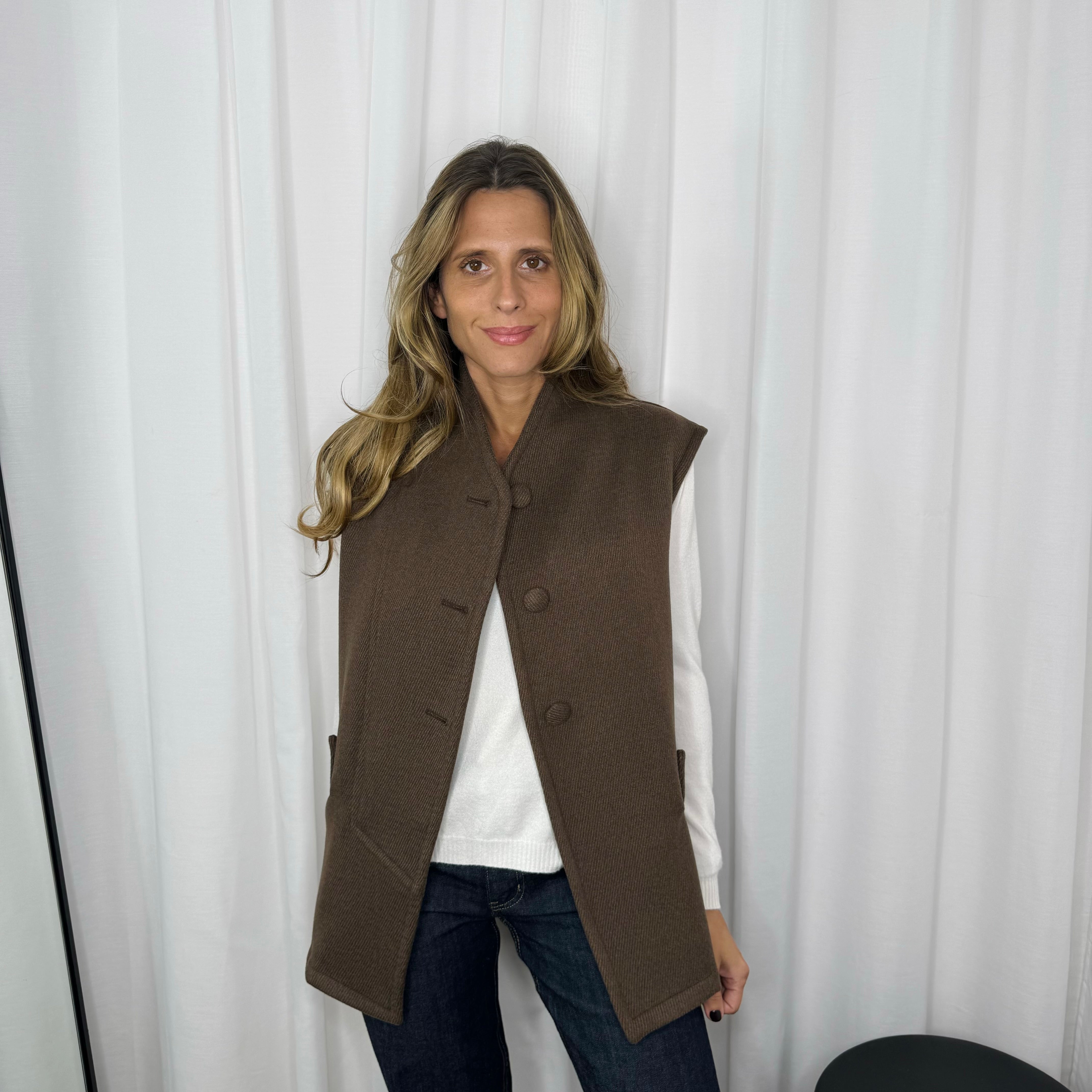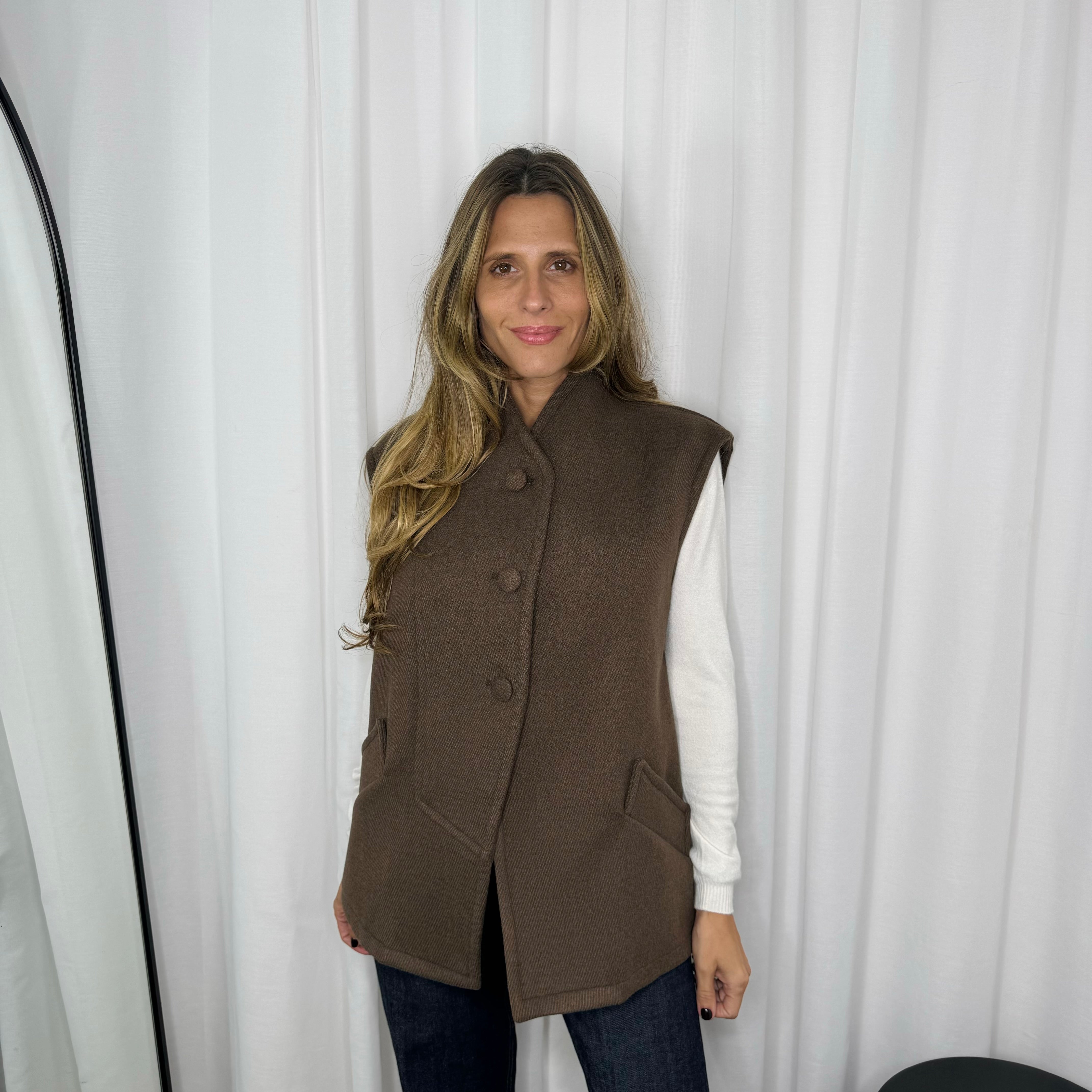 Colete em fazenda castanho. Aperta com botões forrados no mesmo tecido. Bolsos laterais.