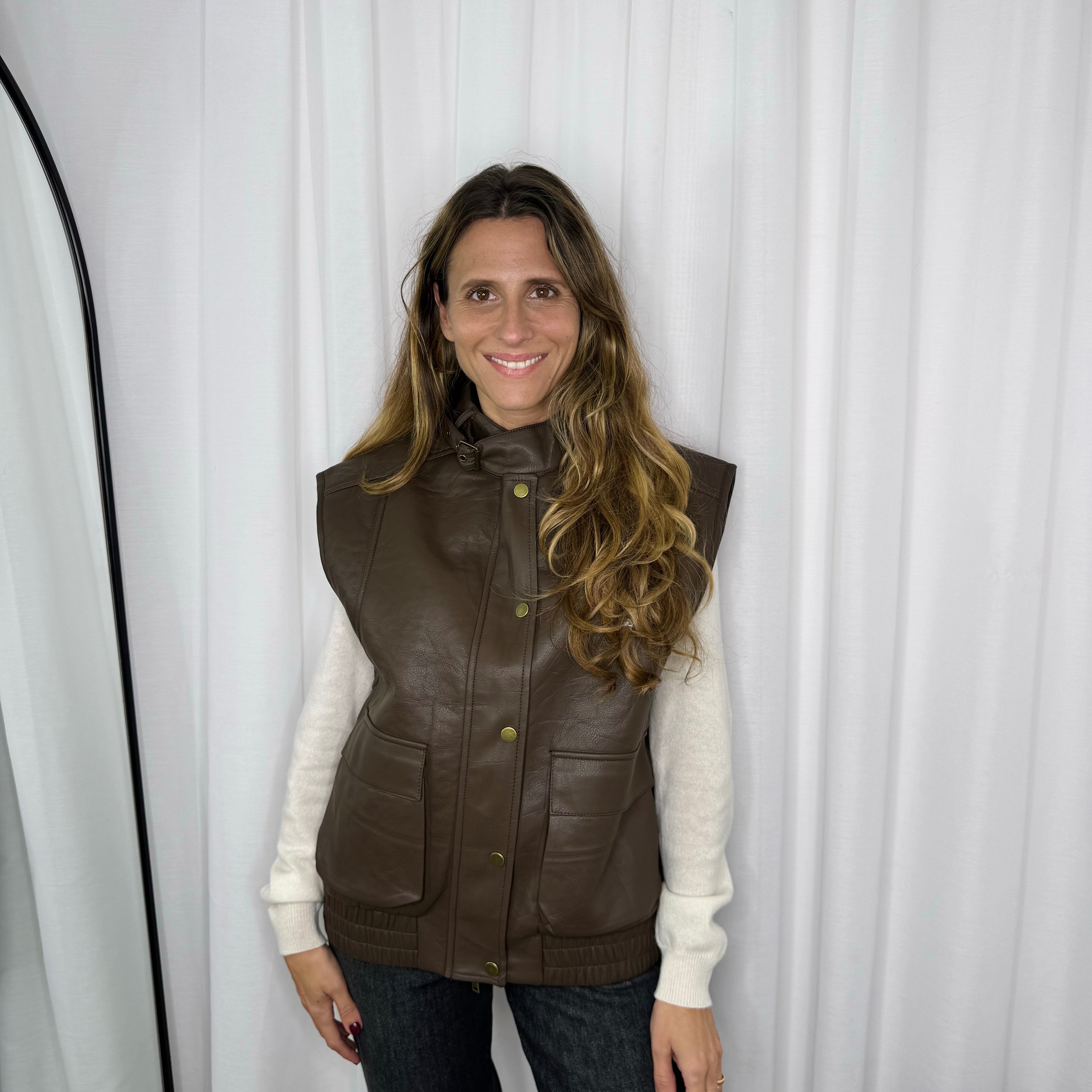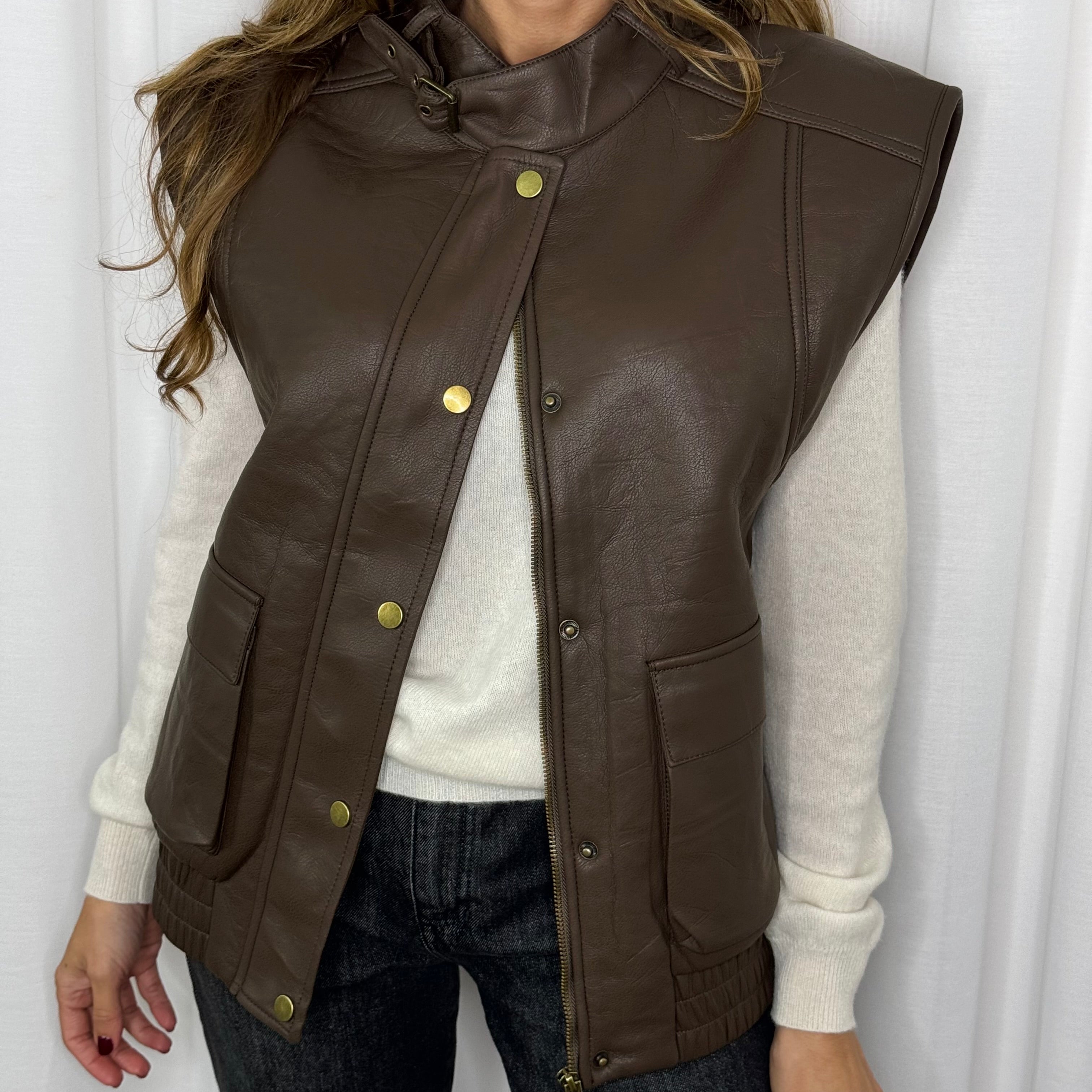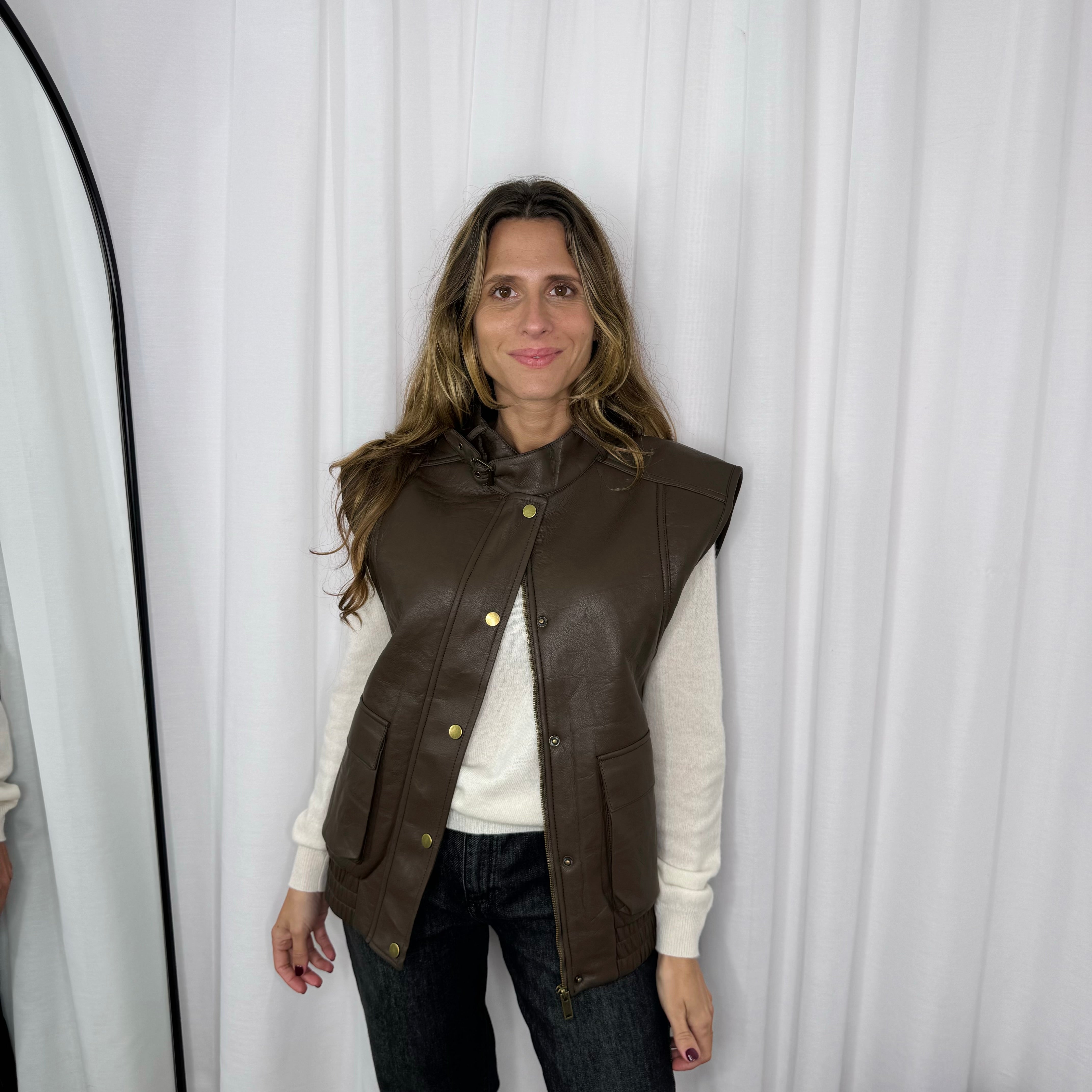 Colete castanho com forro em carneira. Aperta com botões-mola. Bolsos à frente.