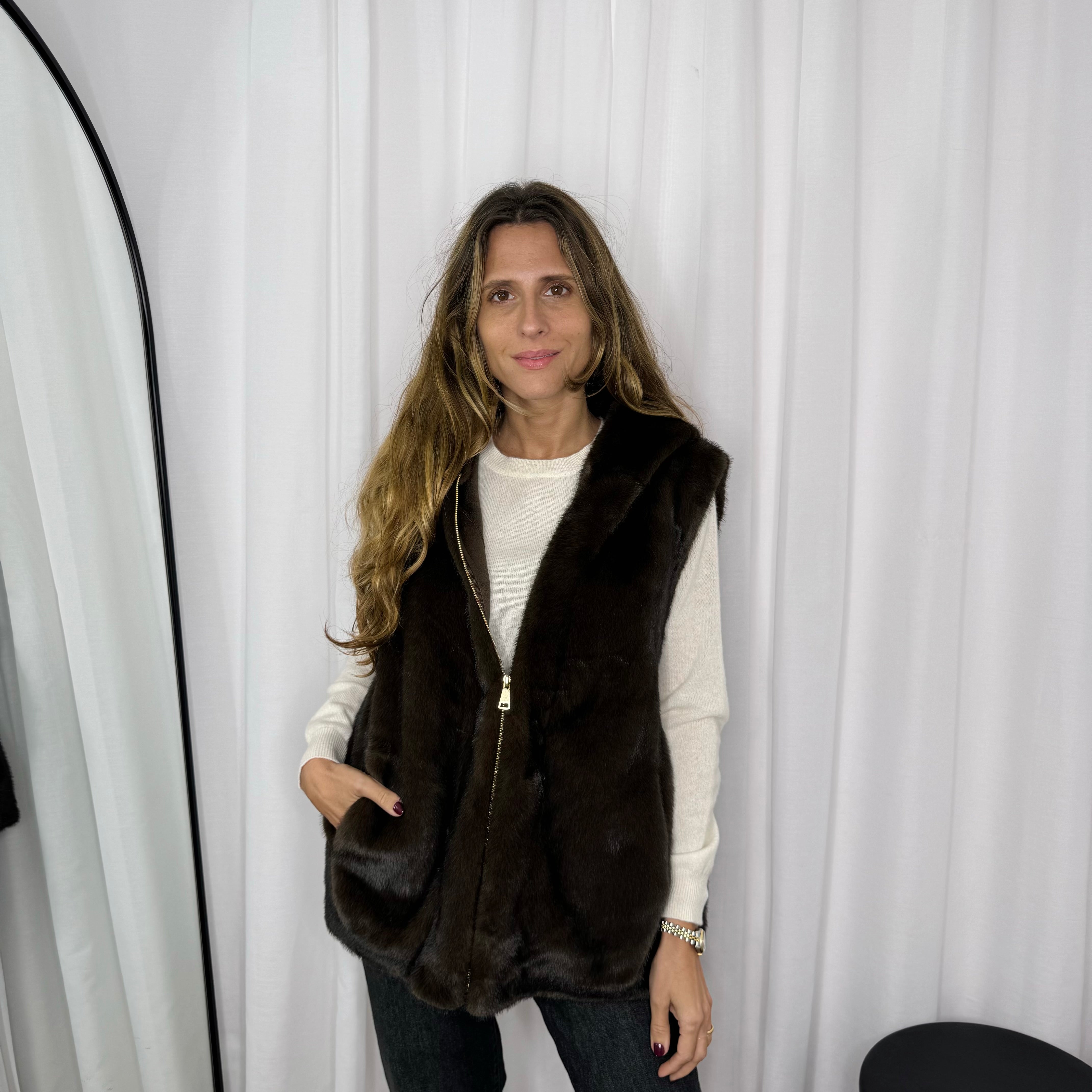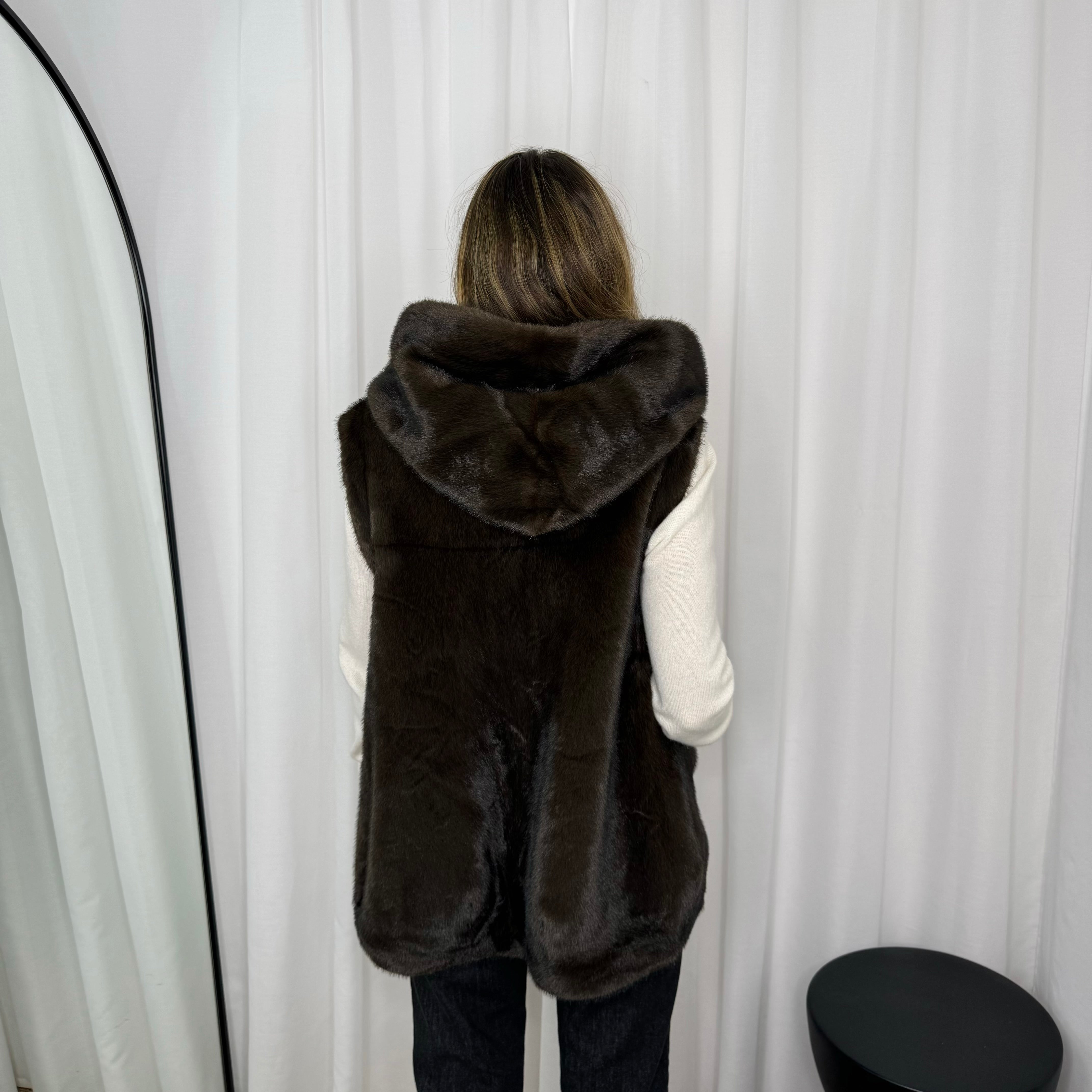 Colete comprido com capuz. Pelo sintético. Aperta com fecho zíper. Bolsos laterais.
