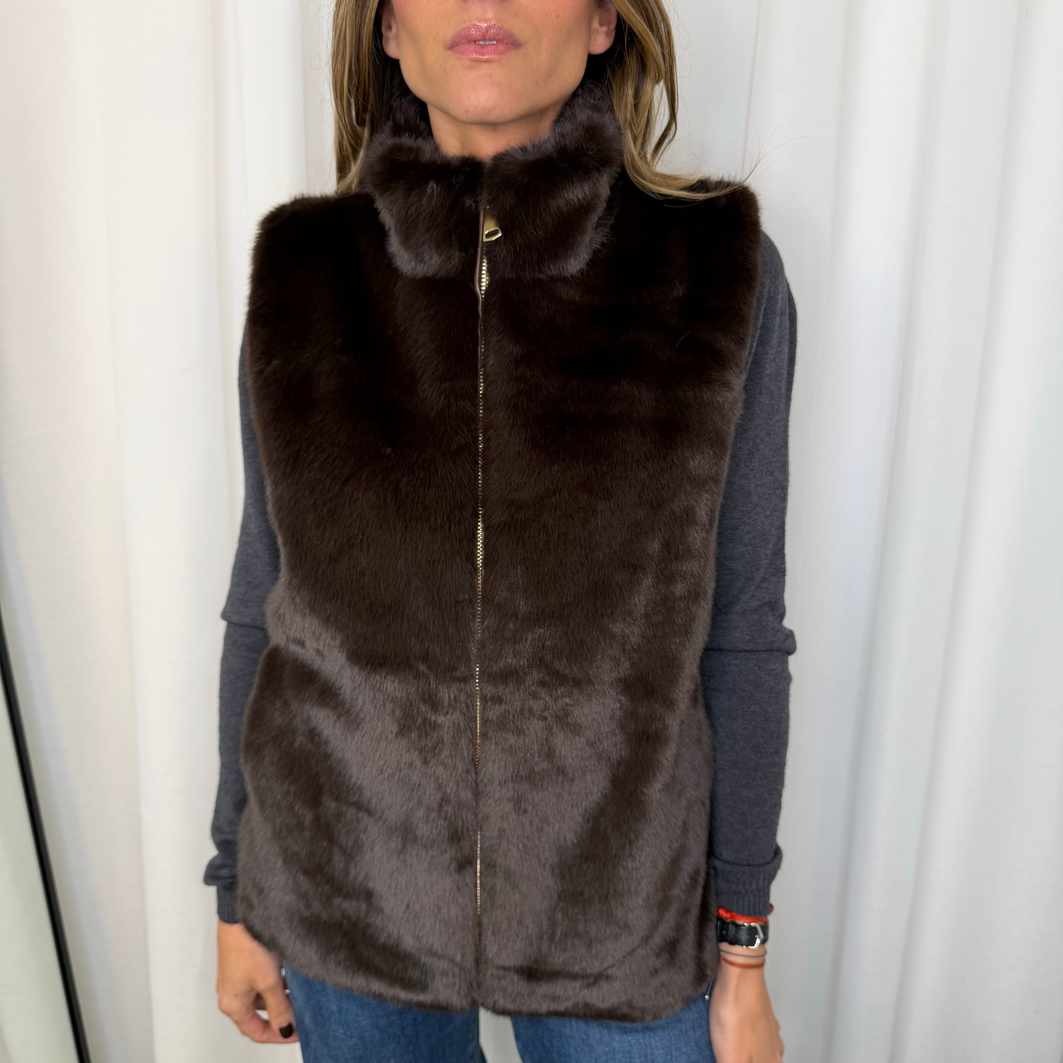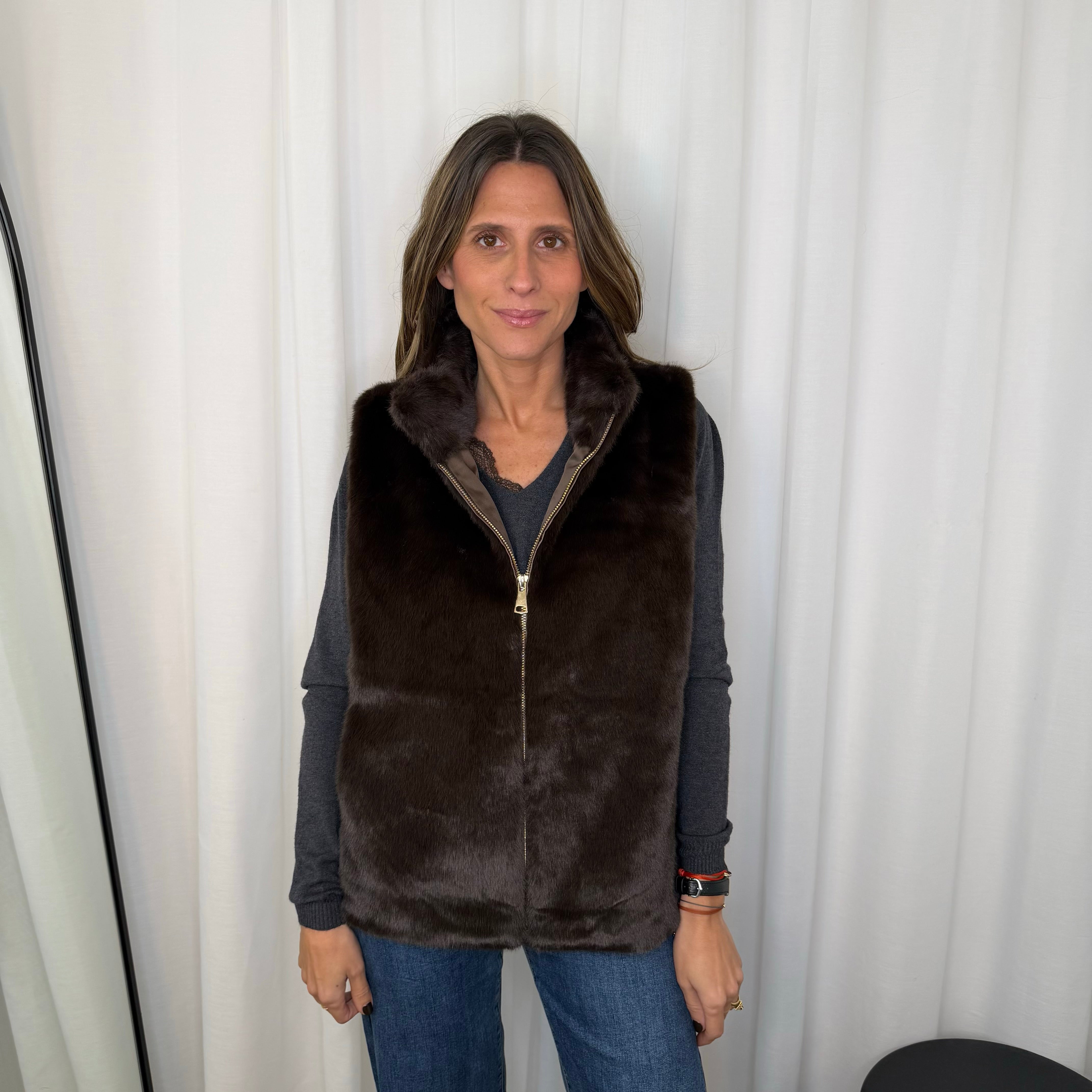 Colete em pelo sintético. Bolsos laterais. Gola alta. Aperta com fecho.