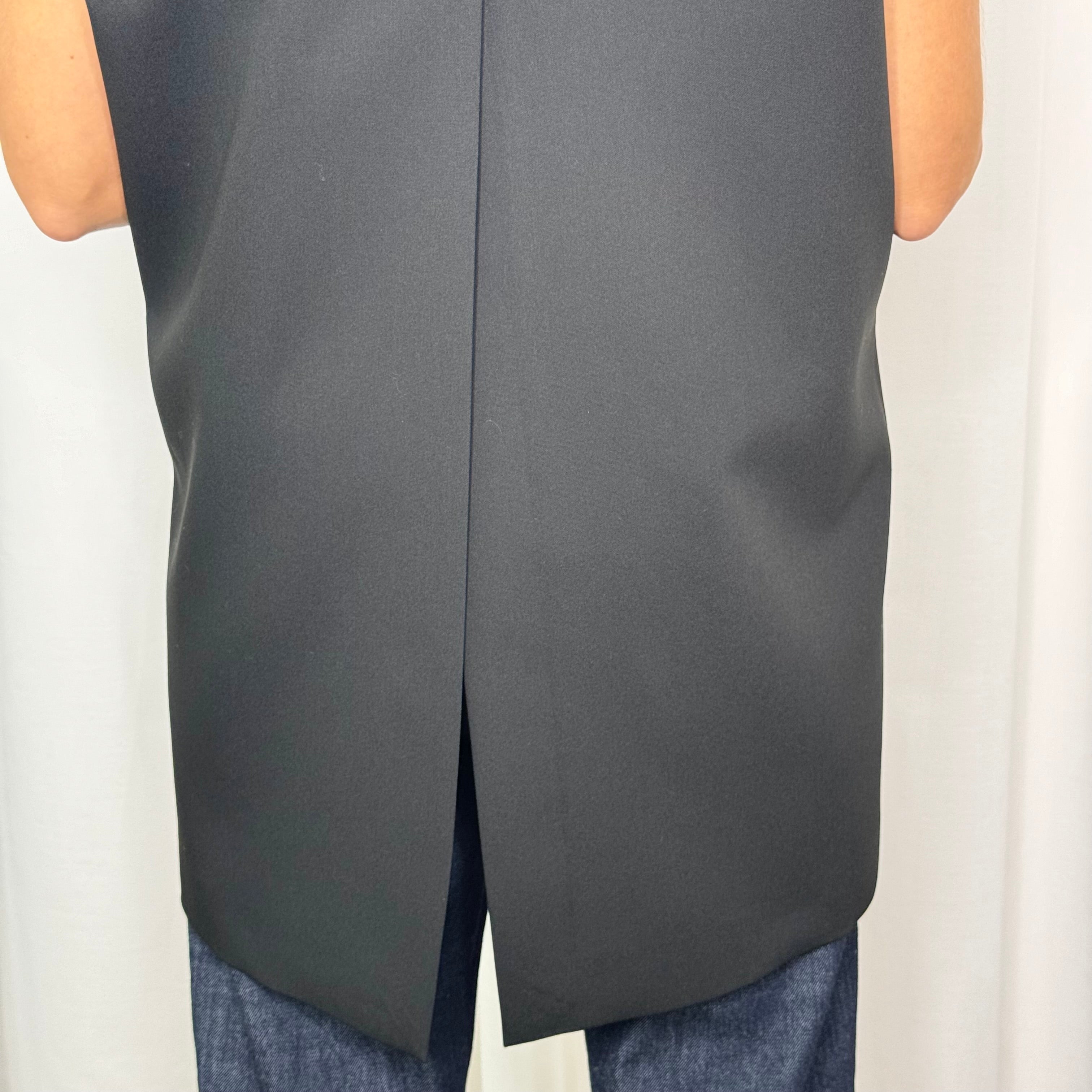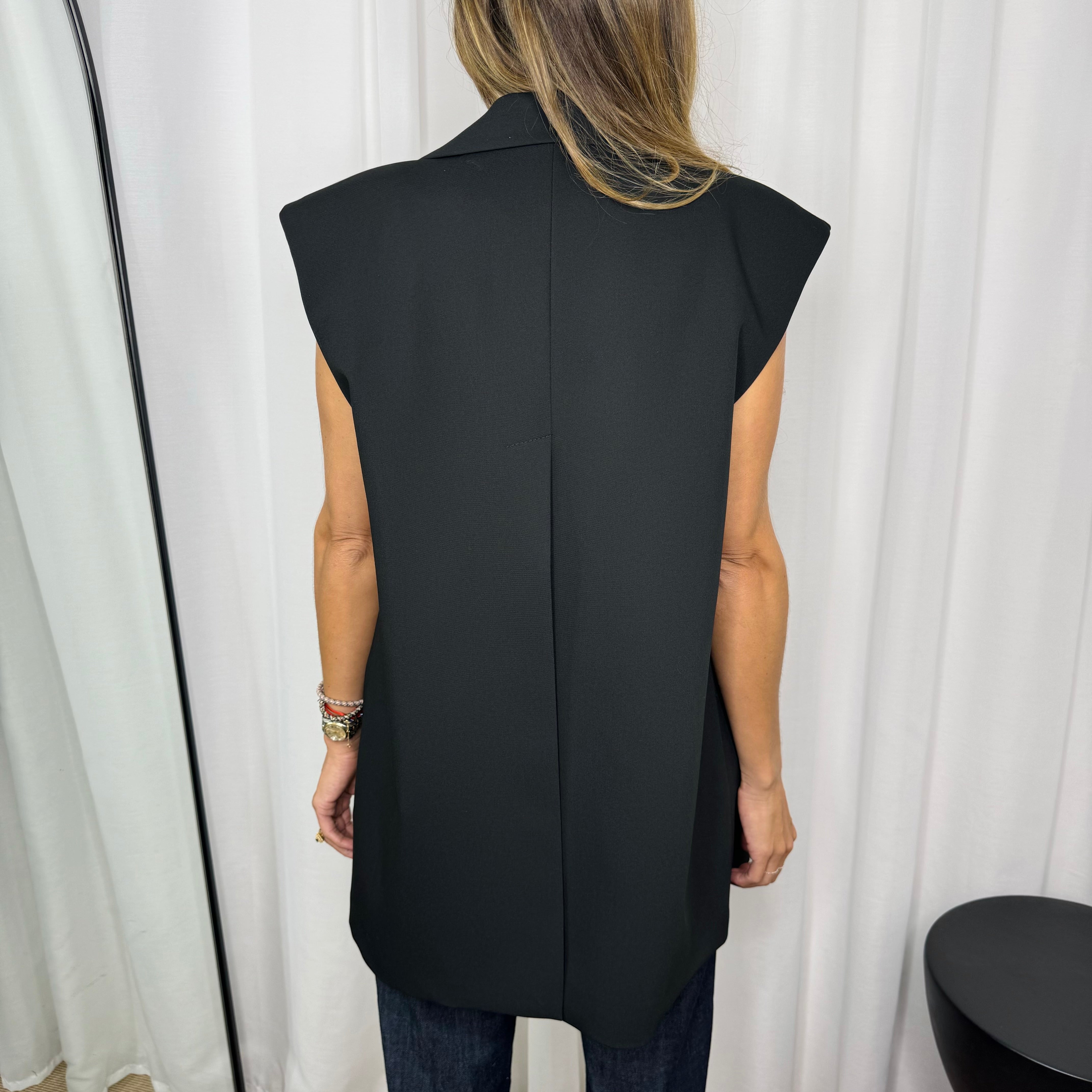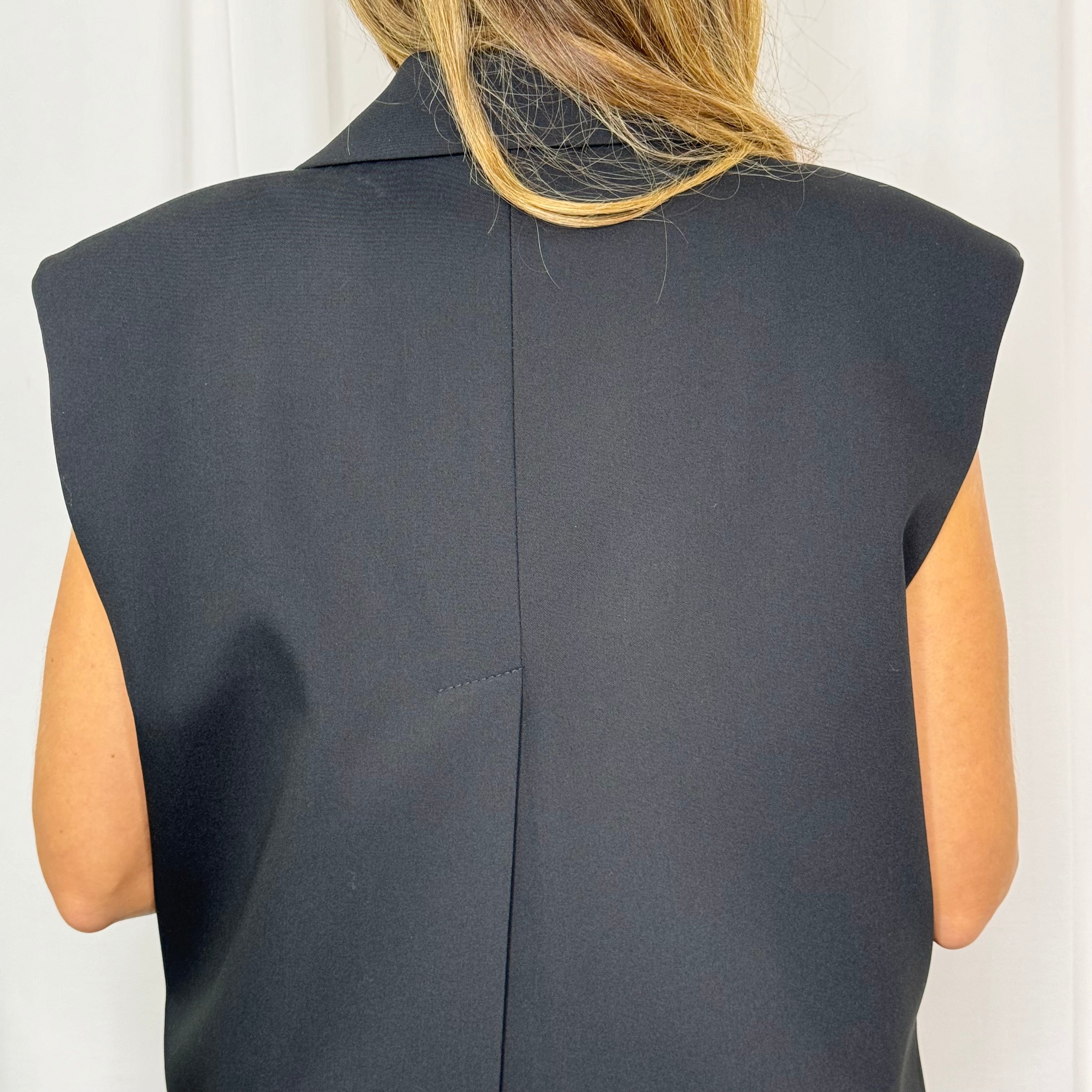 Colete oversized preto de trespasse. Racha assimétrica nas costas.