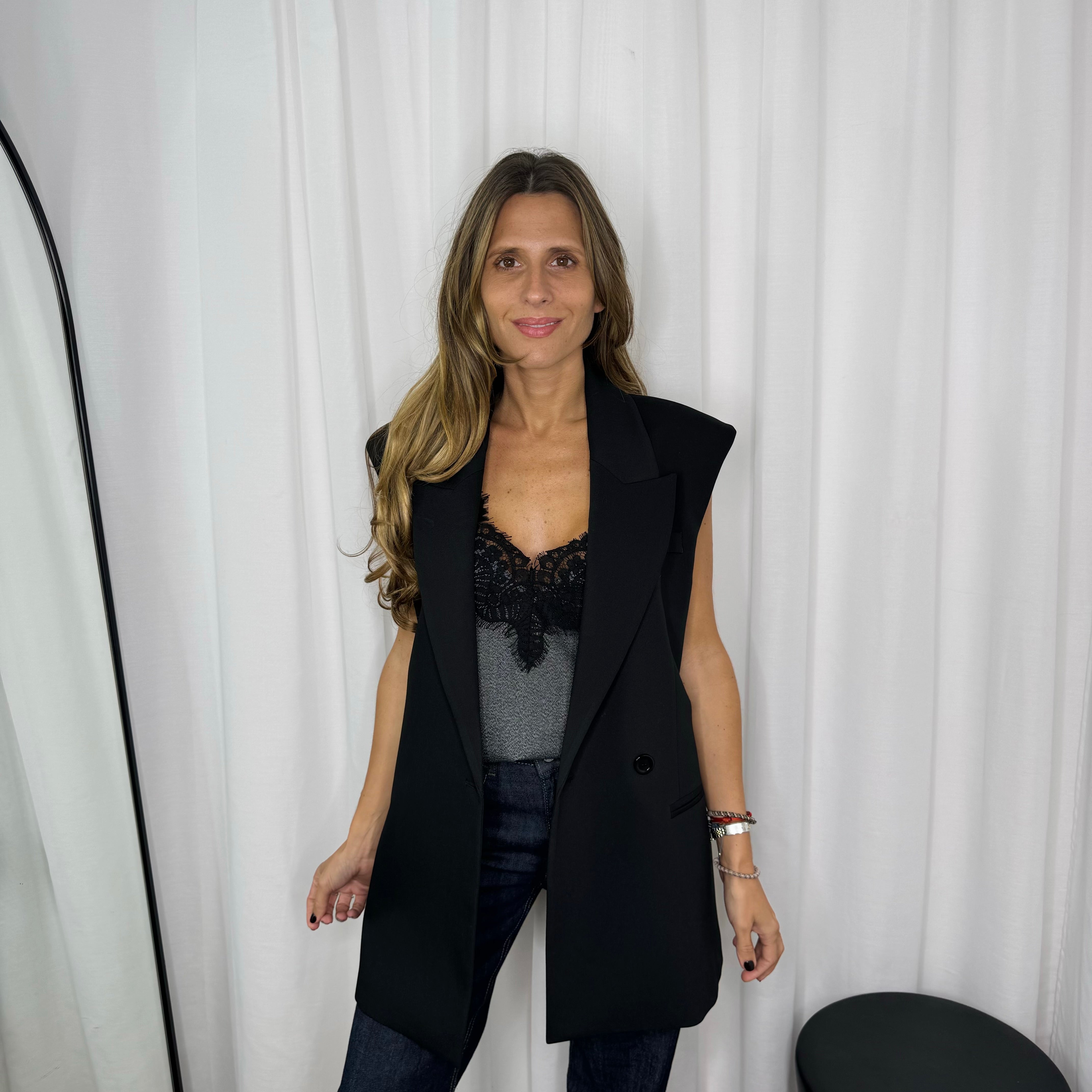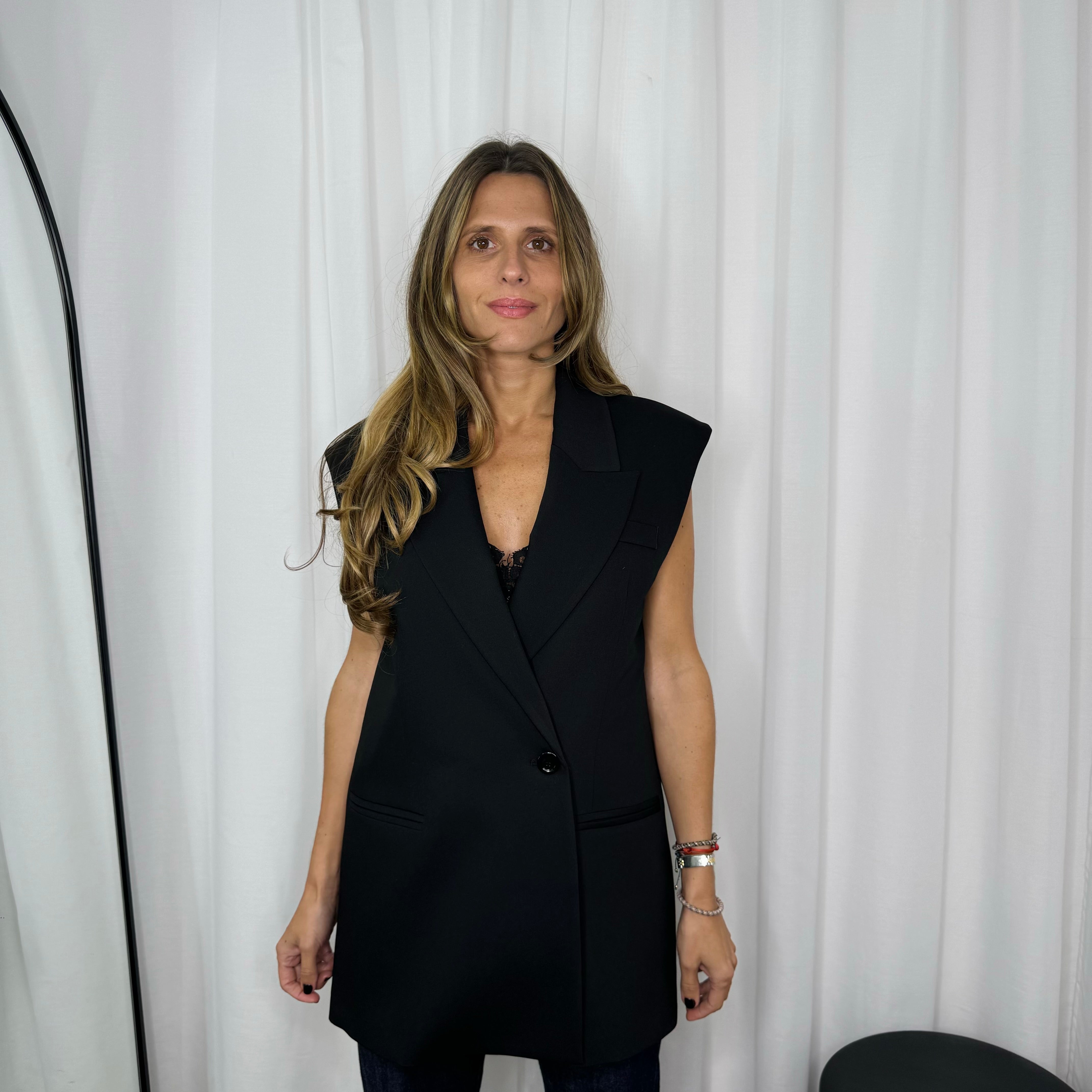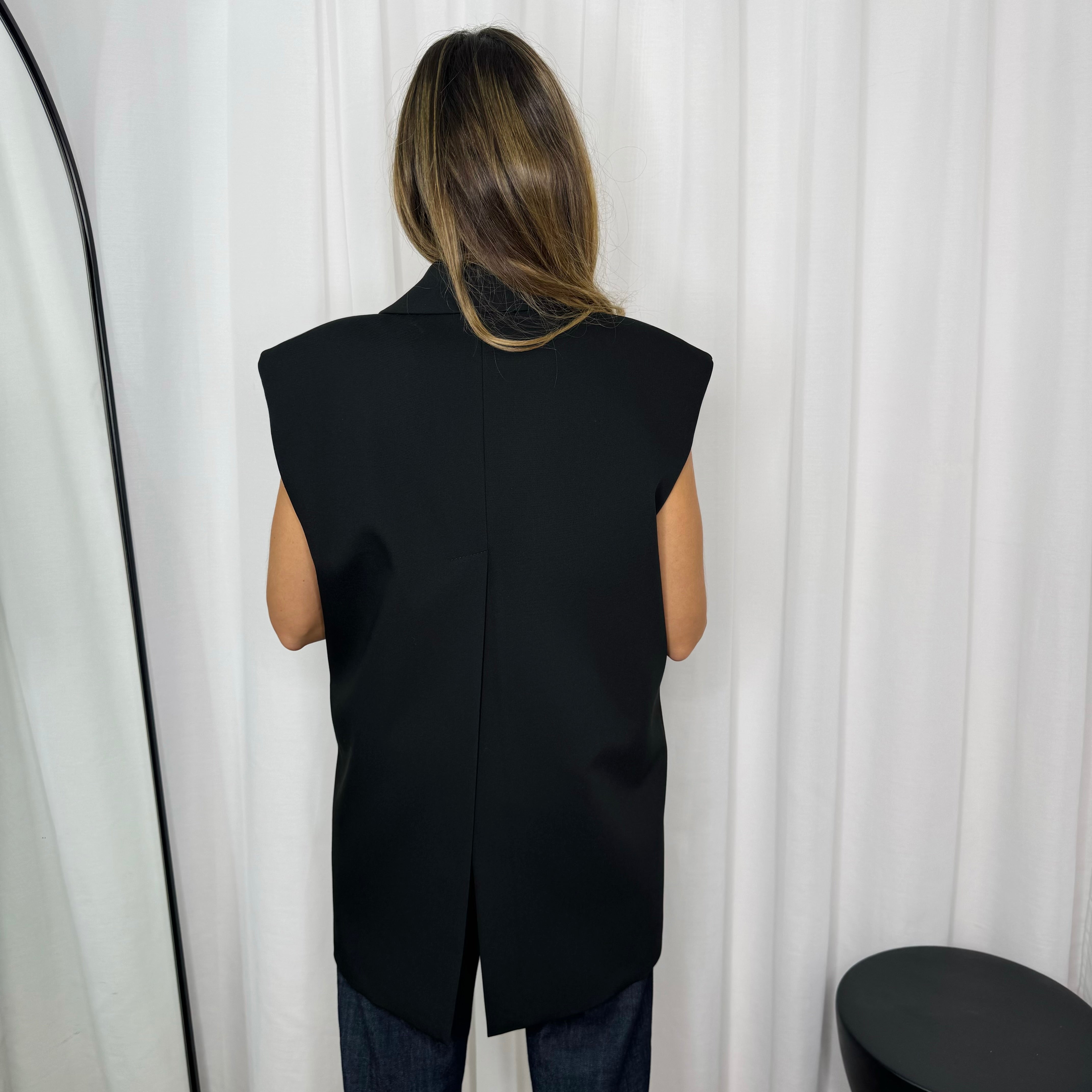 Colete oversized preto de trespasse. Racha assimétrica nas costas.
