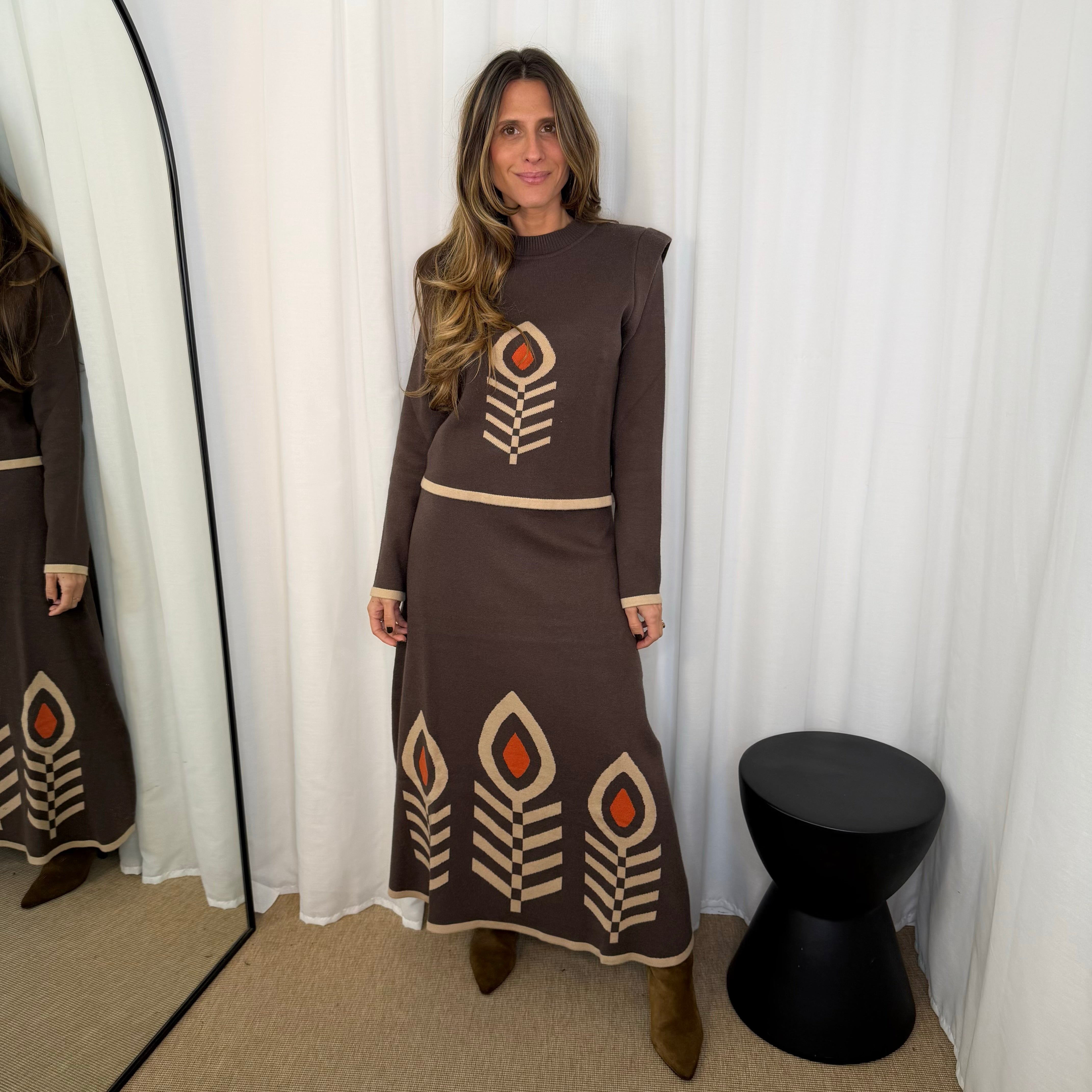 Conjunto camisola e saia. Em malha confortável e macia. Camisola de manga comprida. Decote redondo e canelado. Saia comprimento midi com elástico na cintura.
