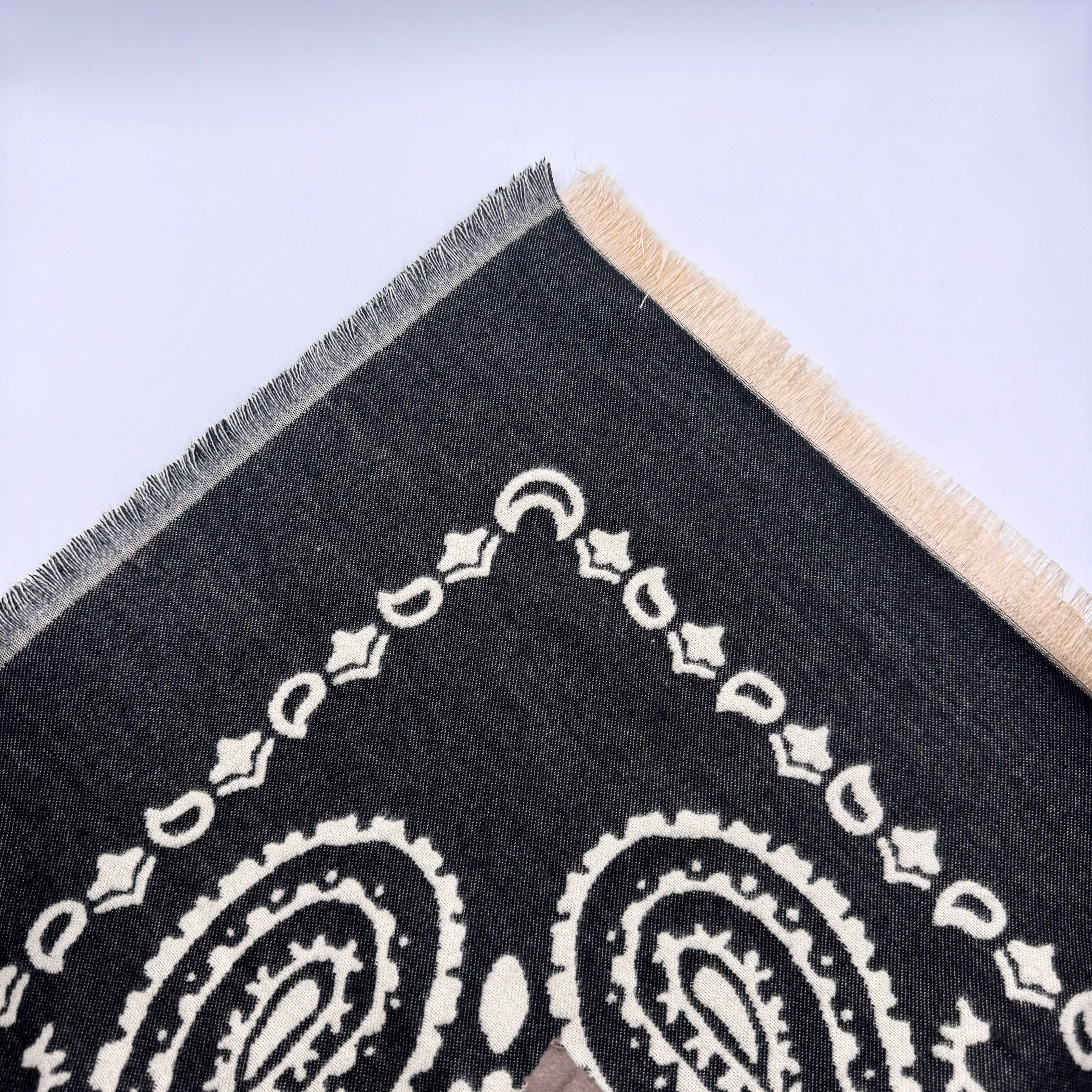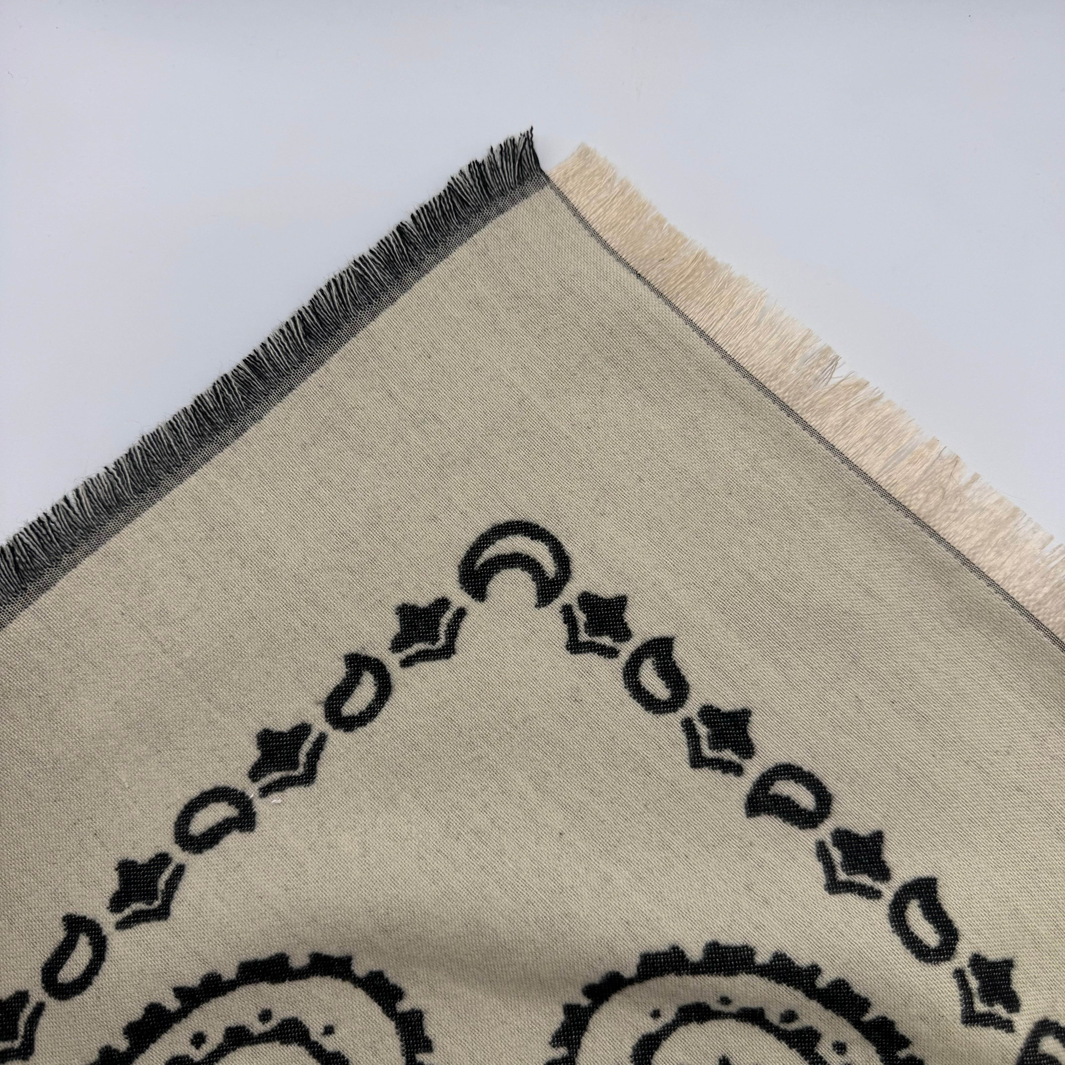 Echarpe grossa estampada e reversível. Acabamento em franjas.