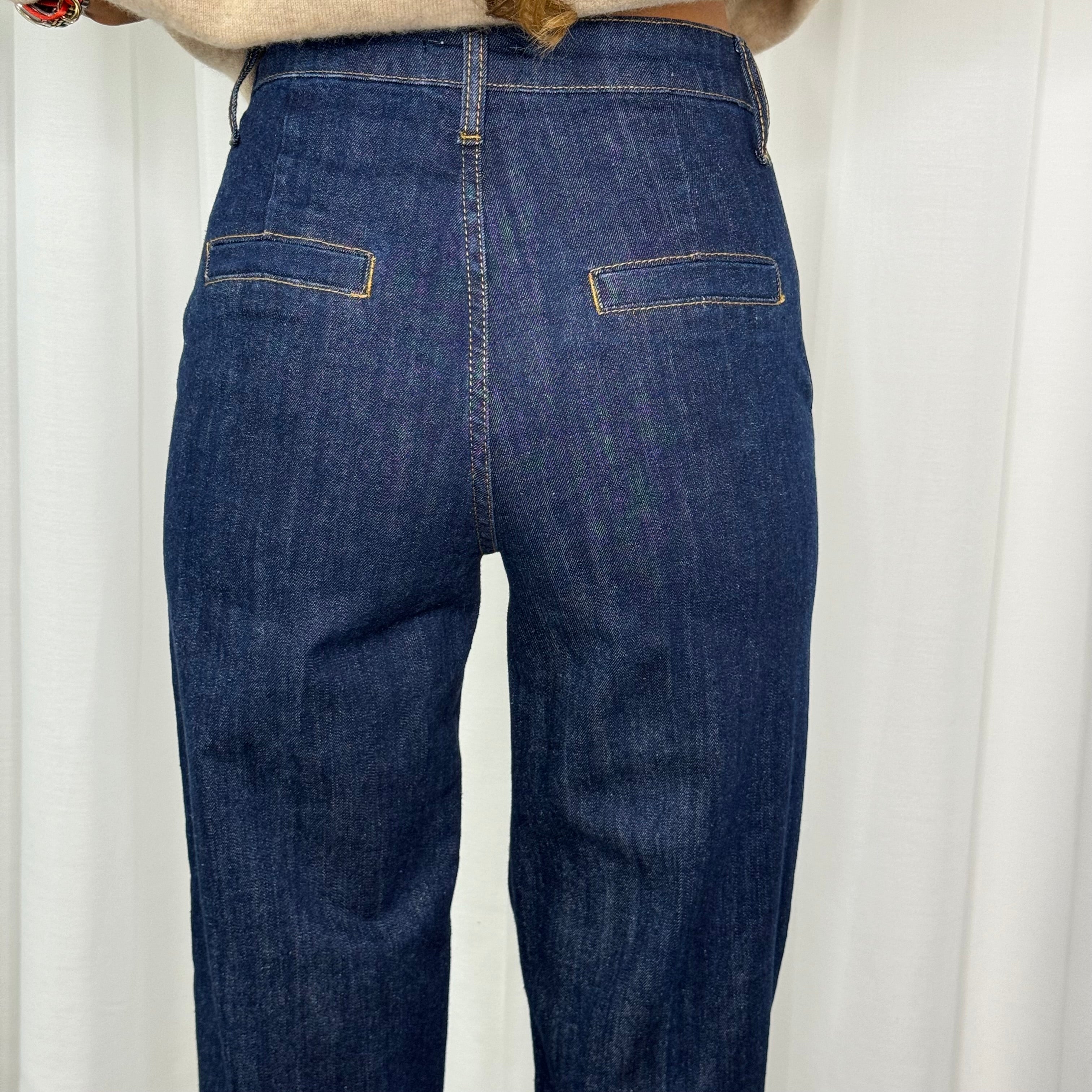 Calças em ganga escuras modelo à boca de sino. Bolsos laterais.