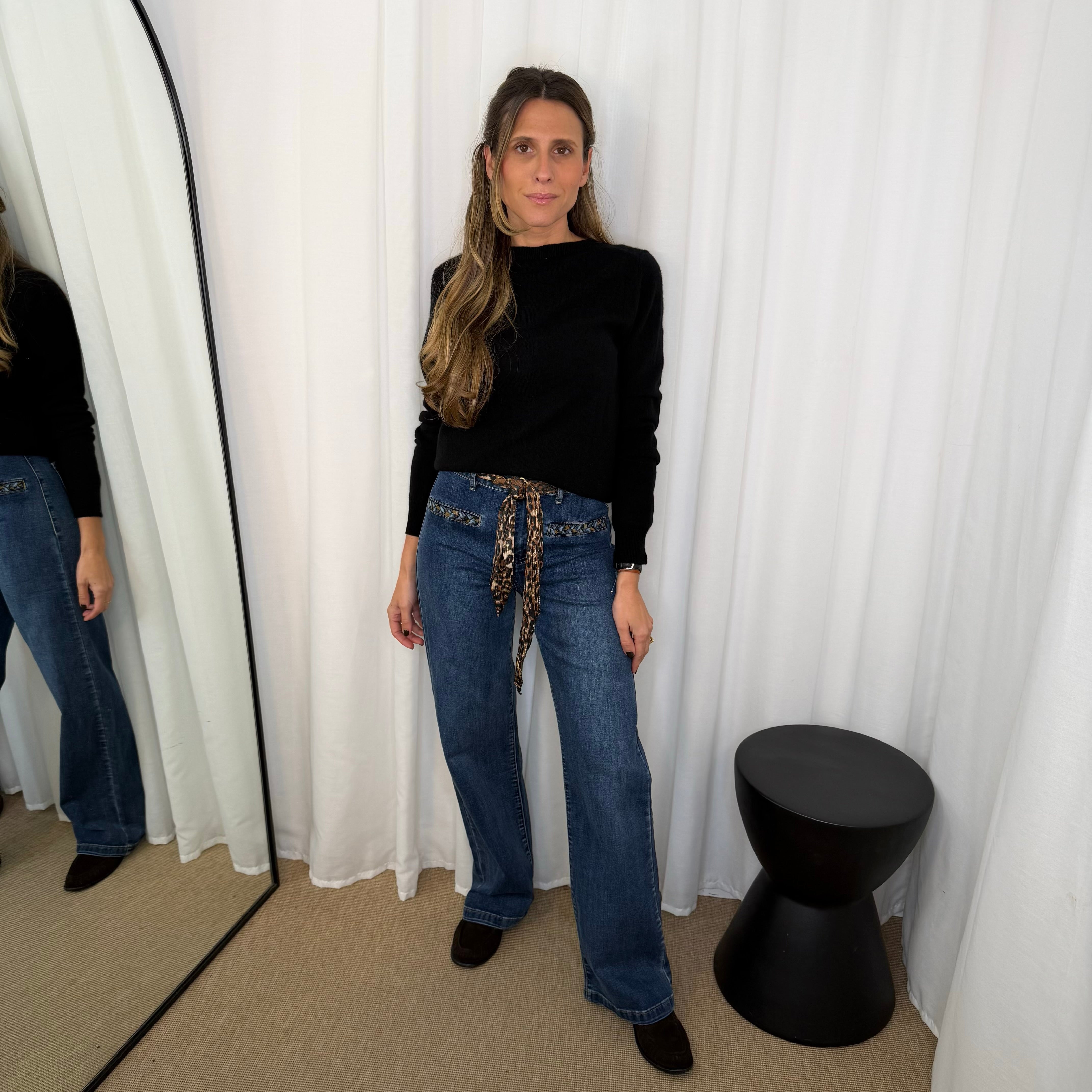 Calças jeans modelo reto. Presilhas na cintura. Inclui cinto em tecido animal print. Bolsos traseiros. Pormenor entrançado animal print. Aperta com fecho e botão.