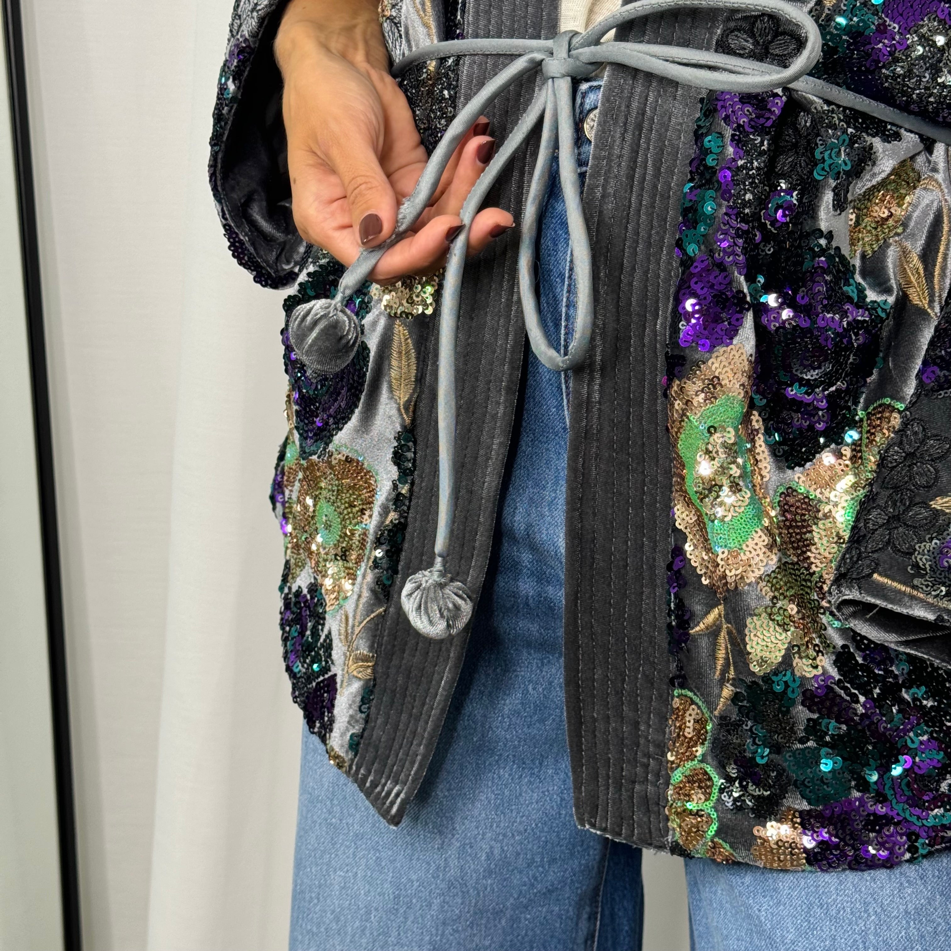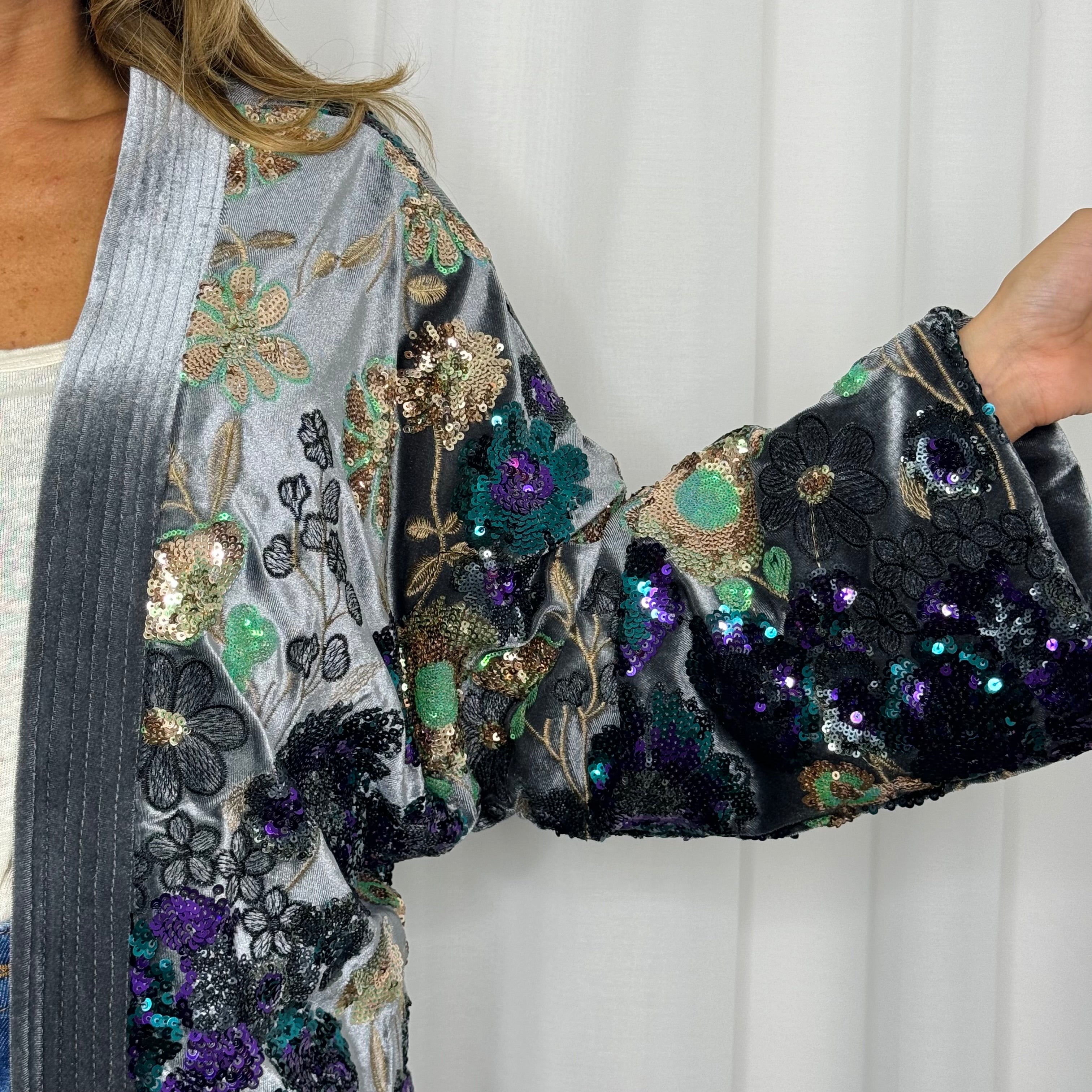 Kimono fundo cinza em veludo com lantejoulas multicolor. Inclui cinto.