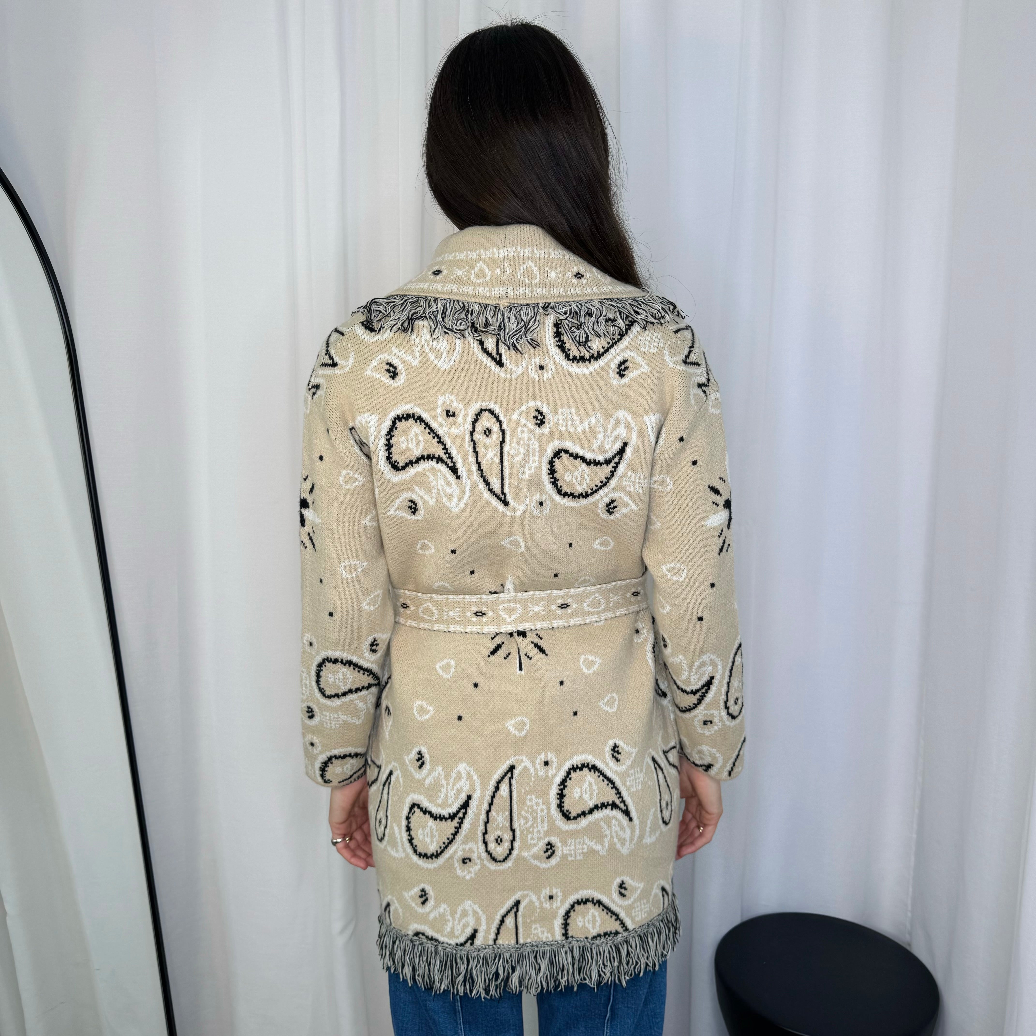 Kimono em malha fundo branco com estampado bandanas azul e preto. Acabamento em franjas. Bolsos à frente. Inclui cinto.