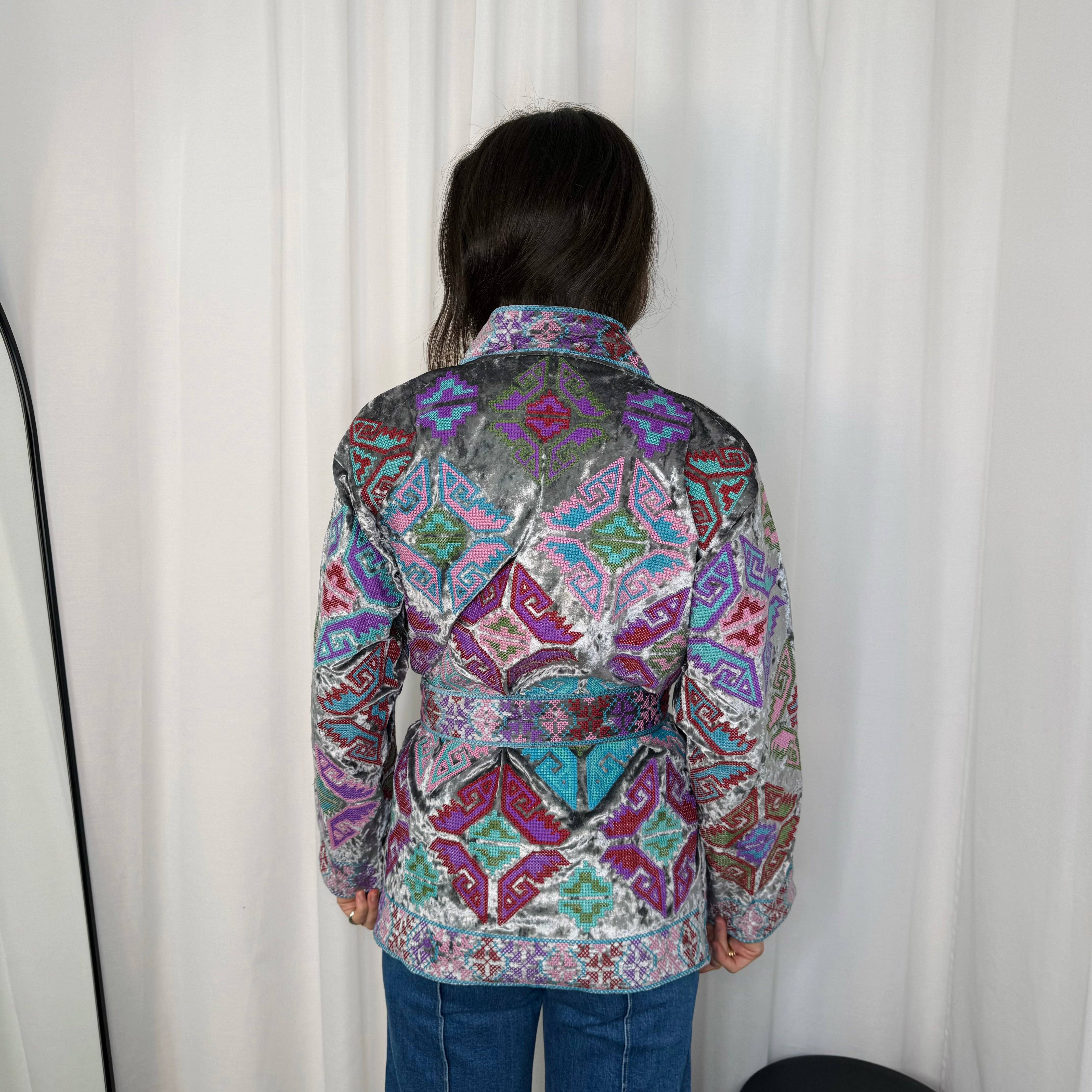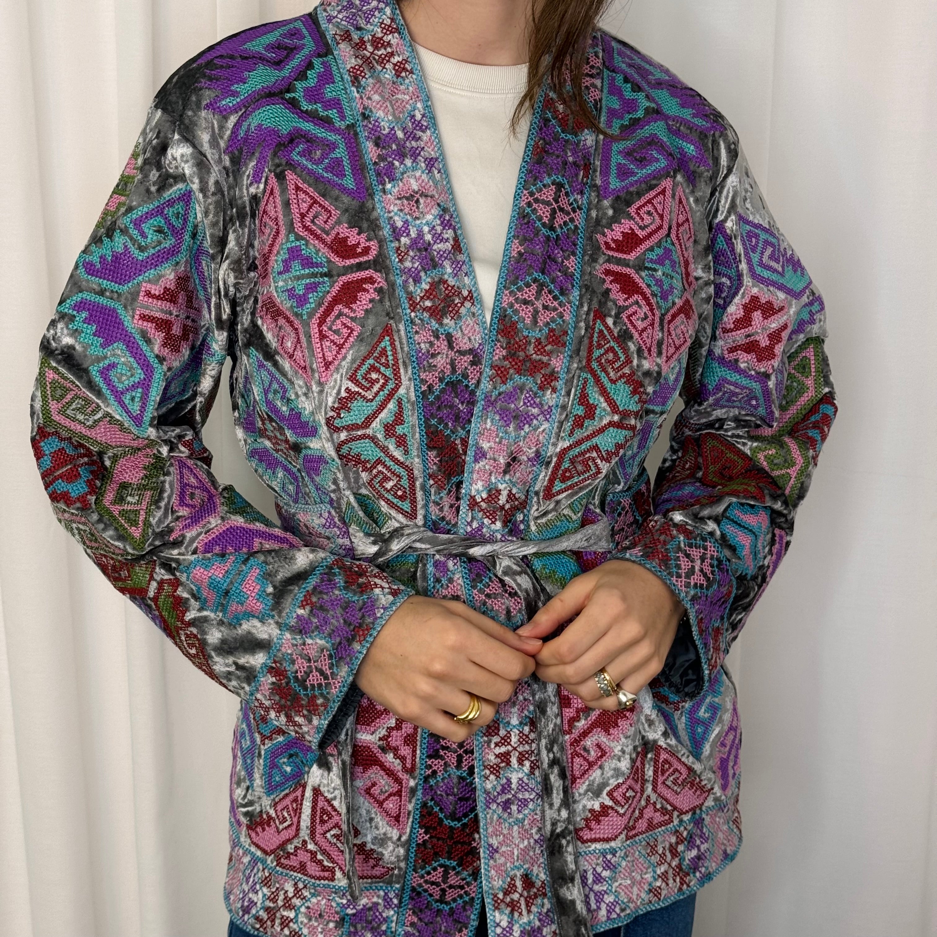 Kimono fundo cinza em veludo com bordados multicolor. Bolsos laterais. Inclui cinto no mesmo tecido.