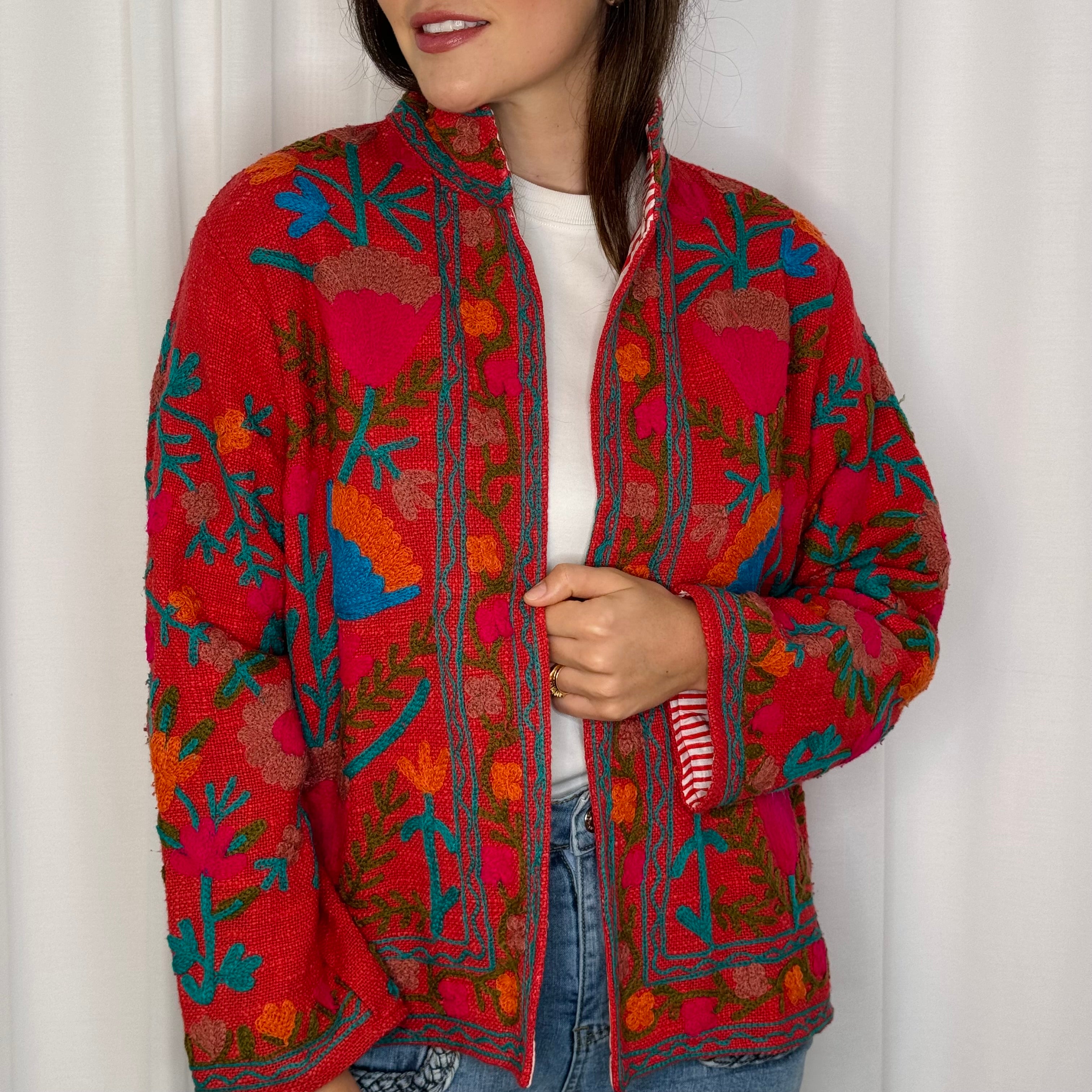 Kimono fundo vermelho com bordados multicolor. Forro às riscas.