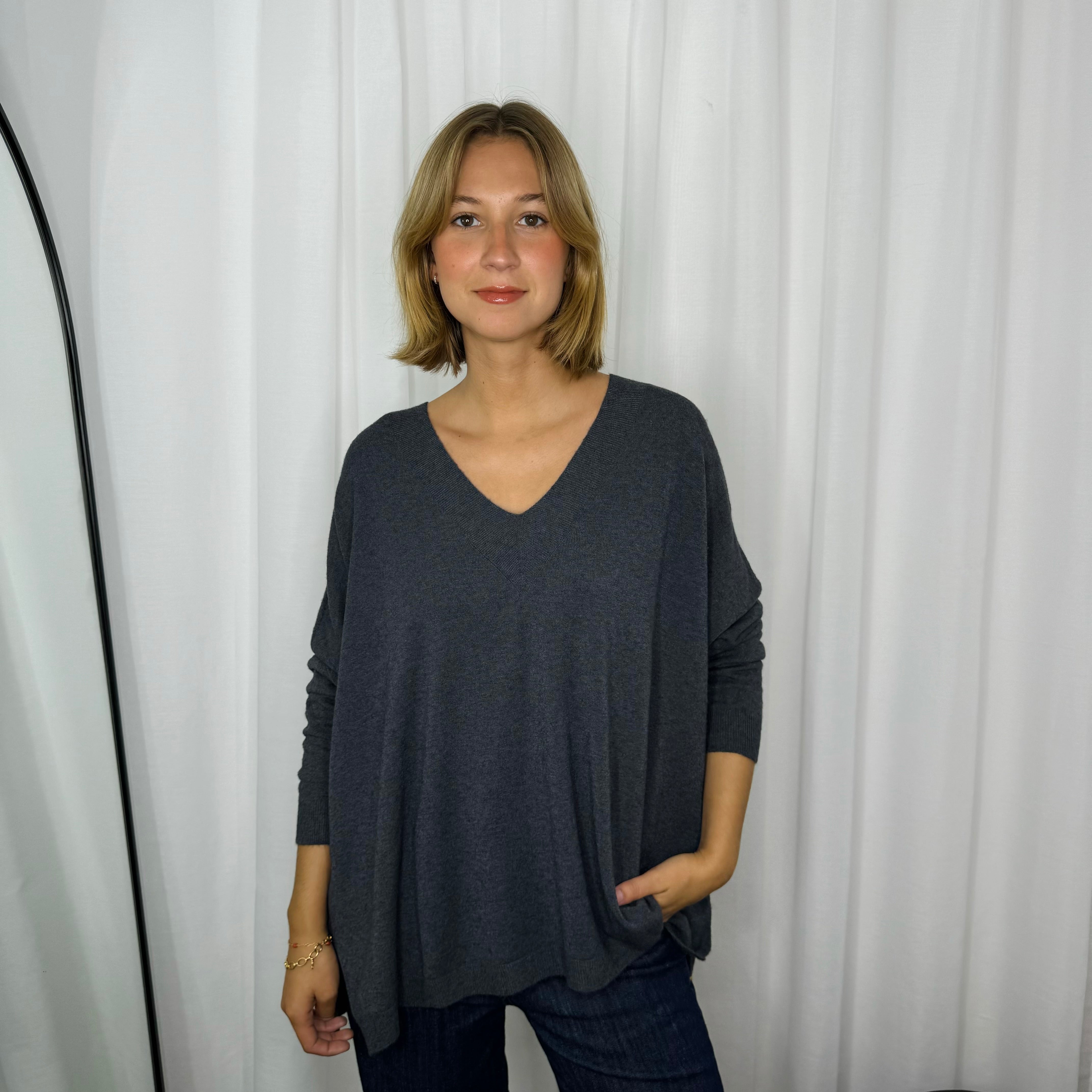 Camisola em decote bico. Modelo largo com racha lateral. Pormenor canelado na gola. Manga comprida.