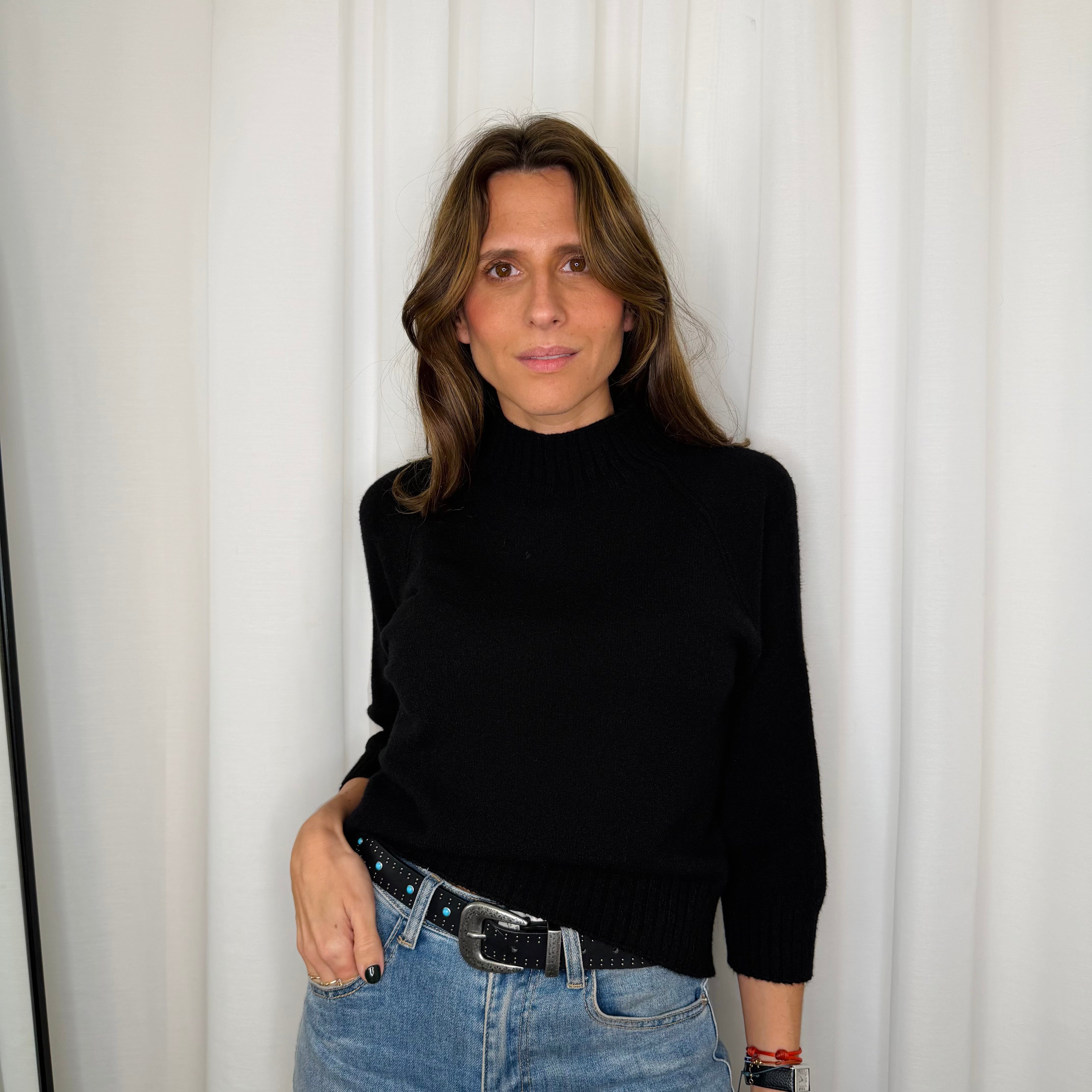 Camisola em malha. Meia gola. Manga 3/4. Gola, cós e punhos canelados.